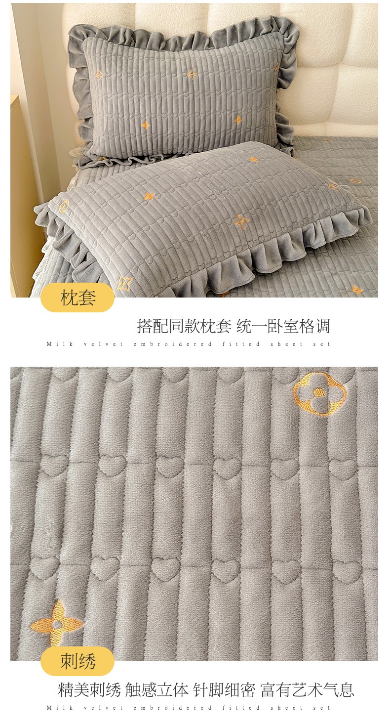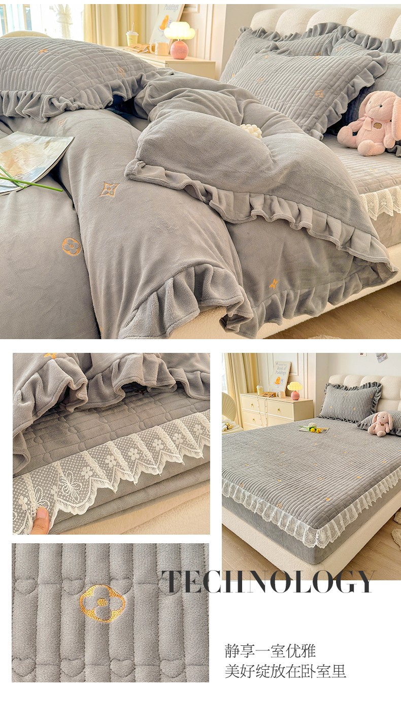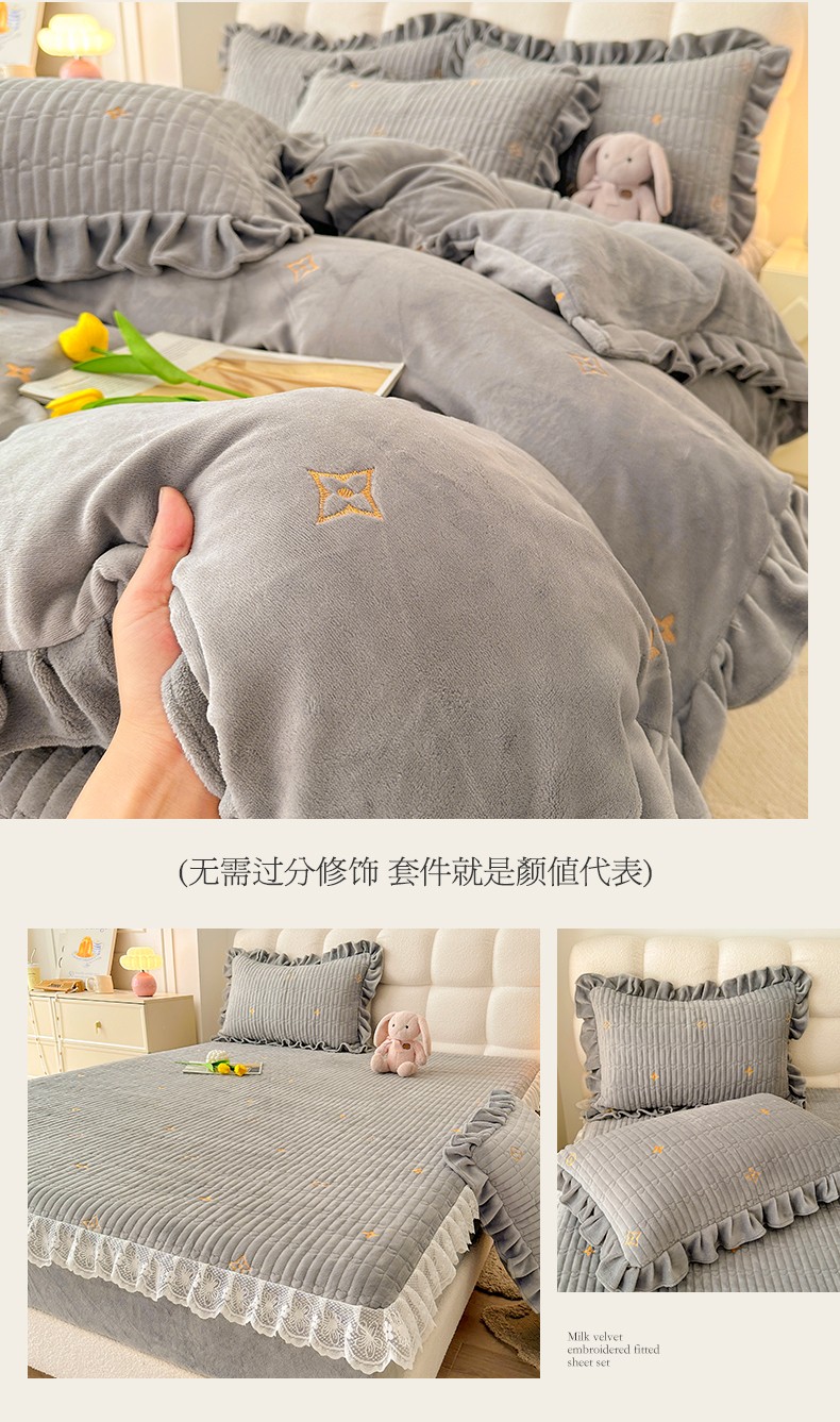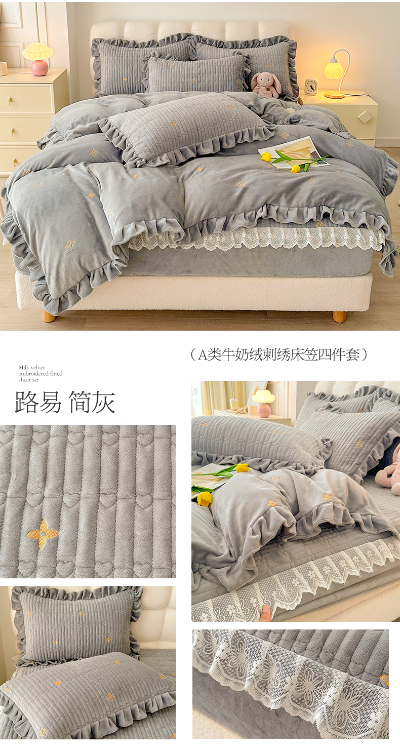宜凡 2023新款牛奶绒夹棉绗缝绣花床笠四件套 路易-简灰