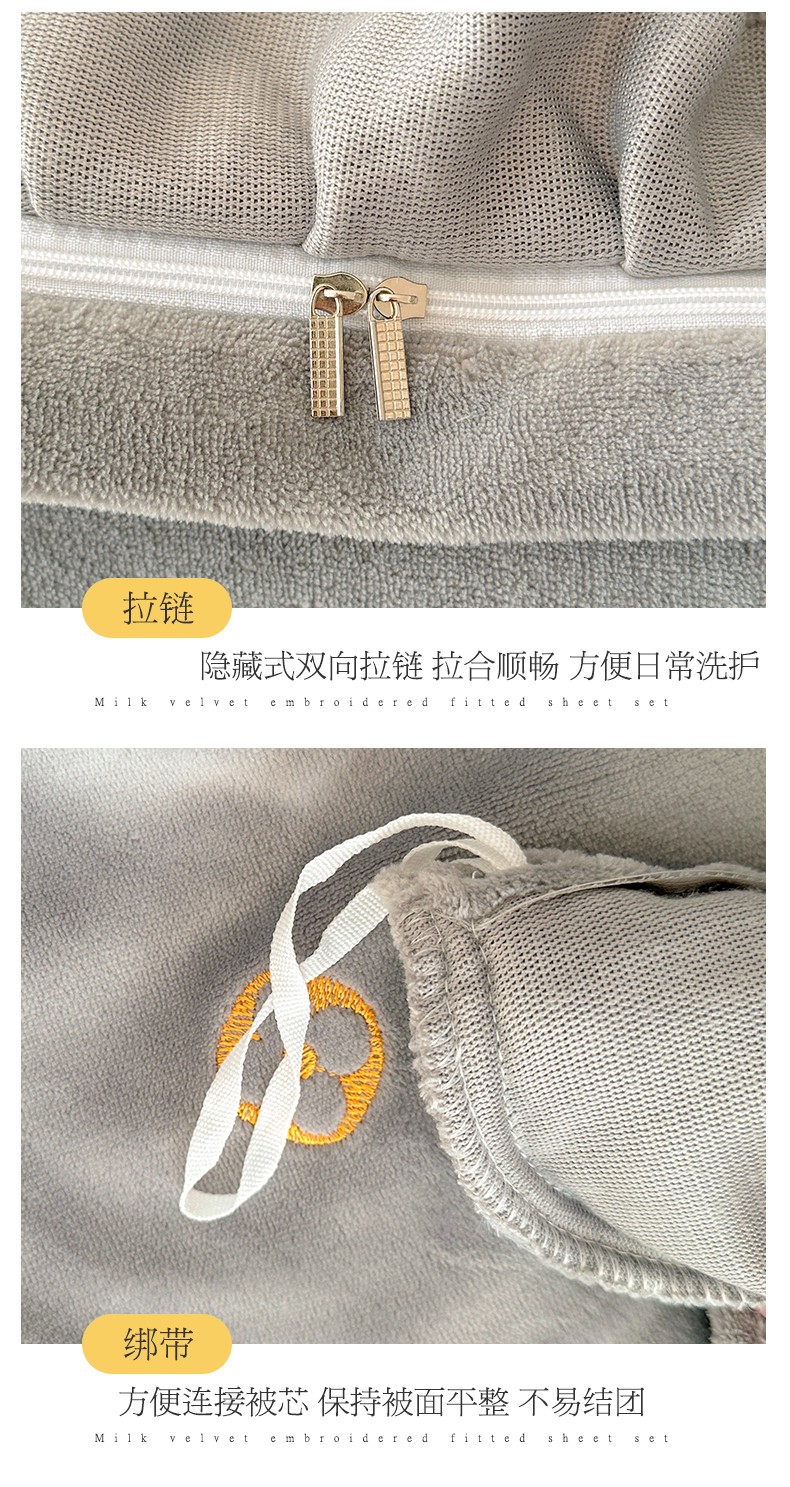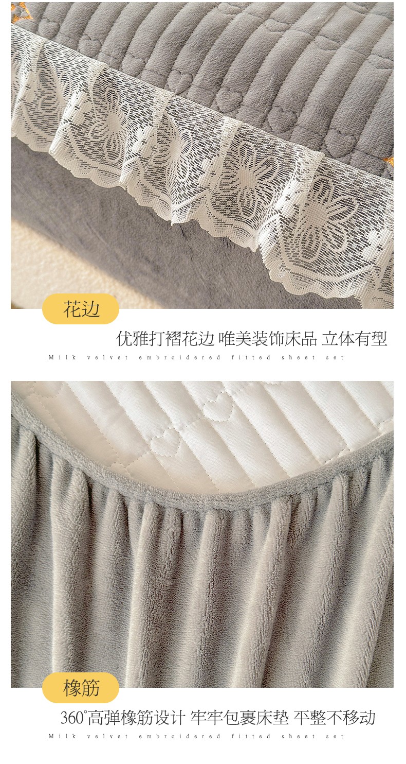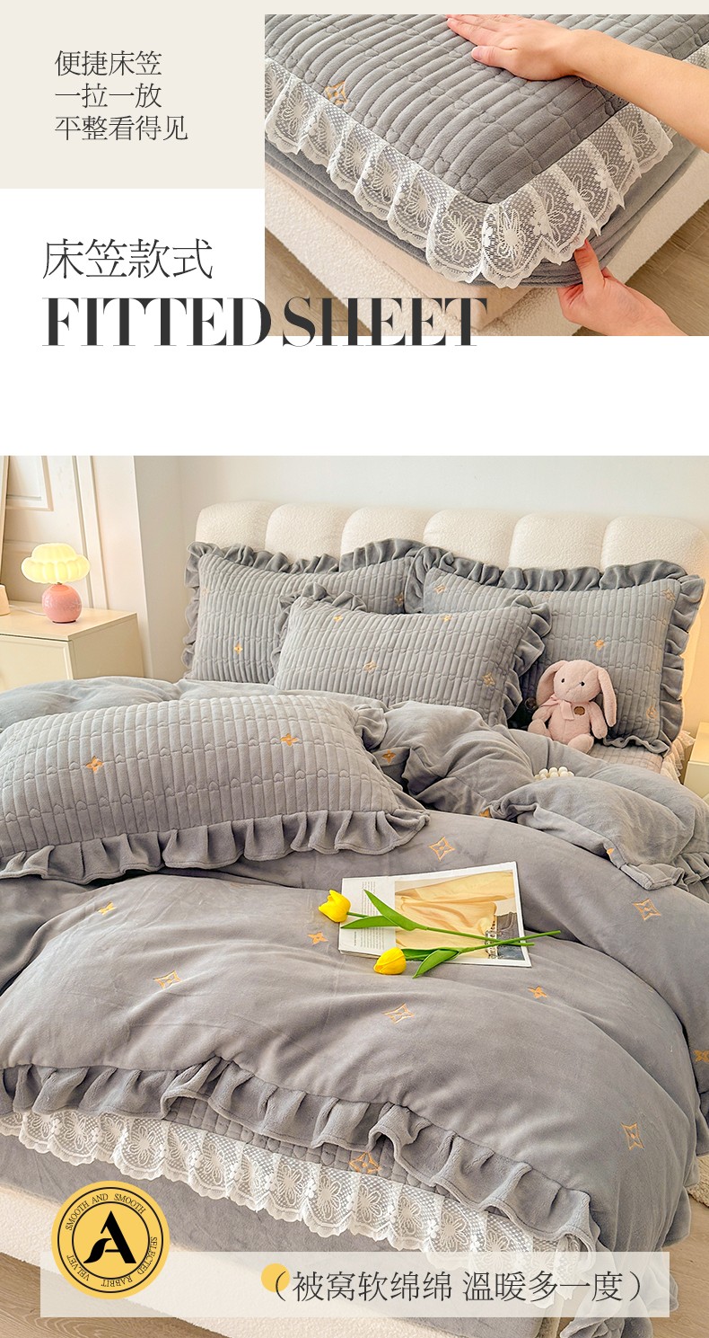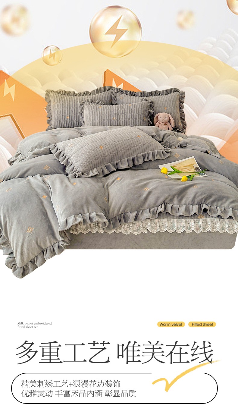 宜凡 2023新款牛奶绒夹棉绗缝绣花床笠四件套 路易-简灰
