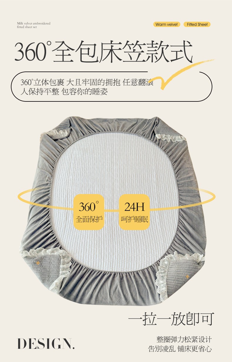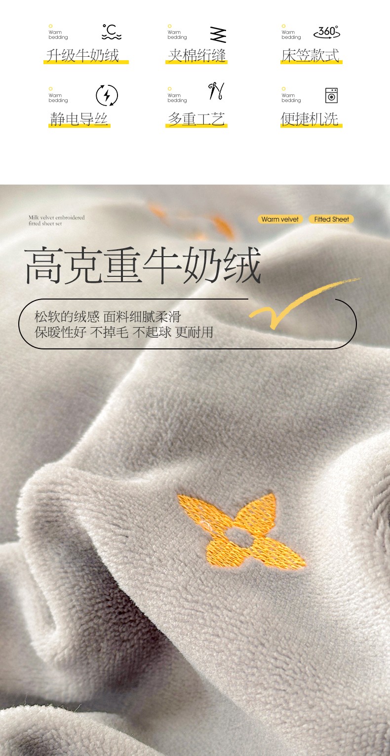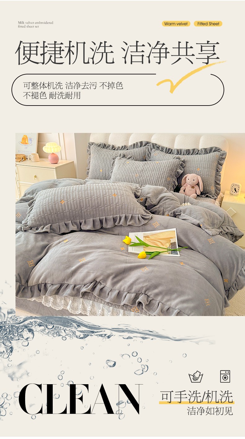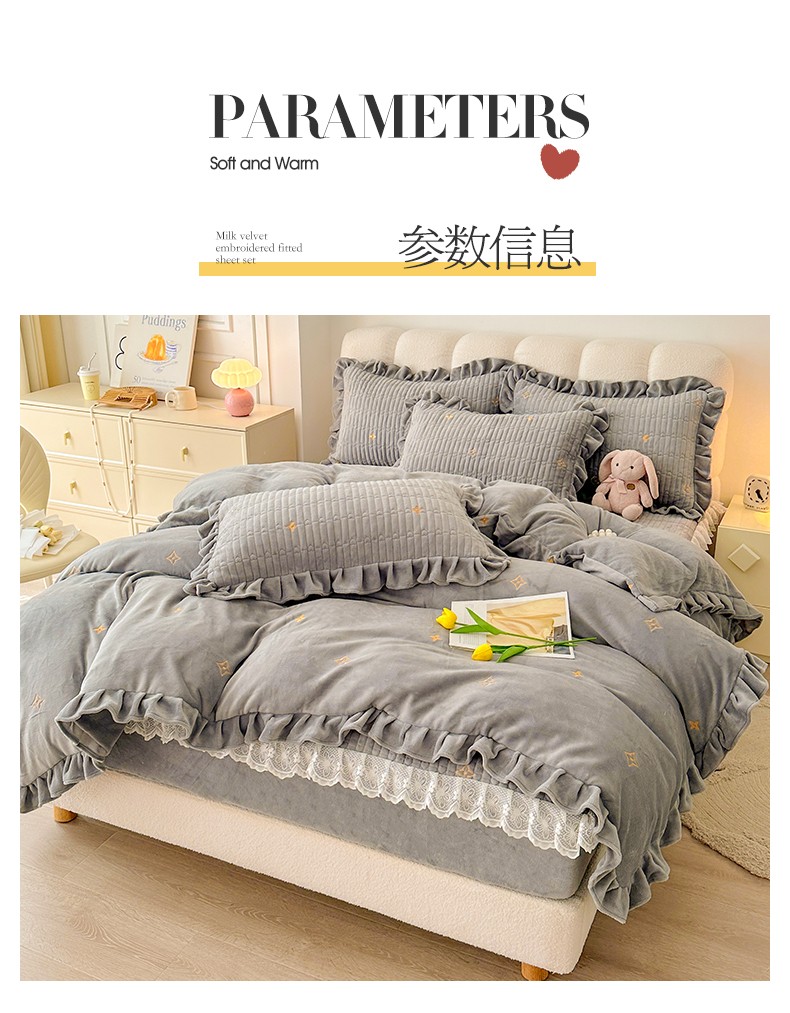 宜凡 2023新款牛奶绒夹棉绗缝绣花床笠四件套 路易-简灰