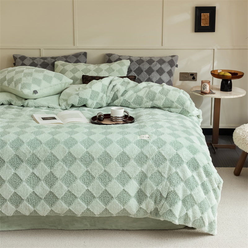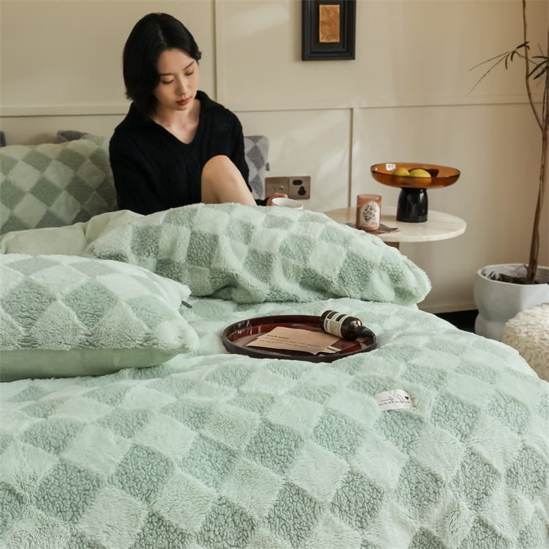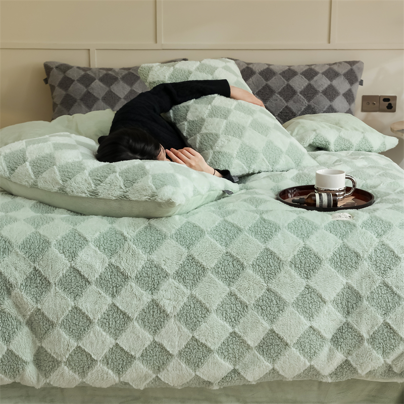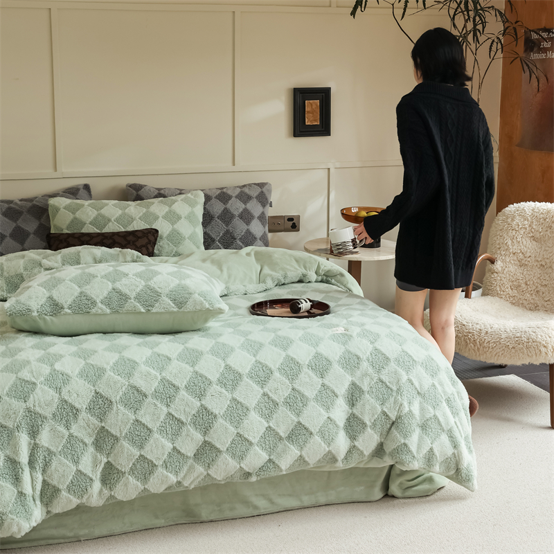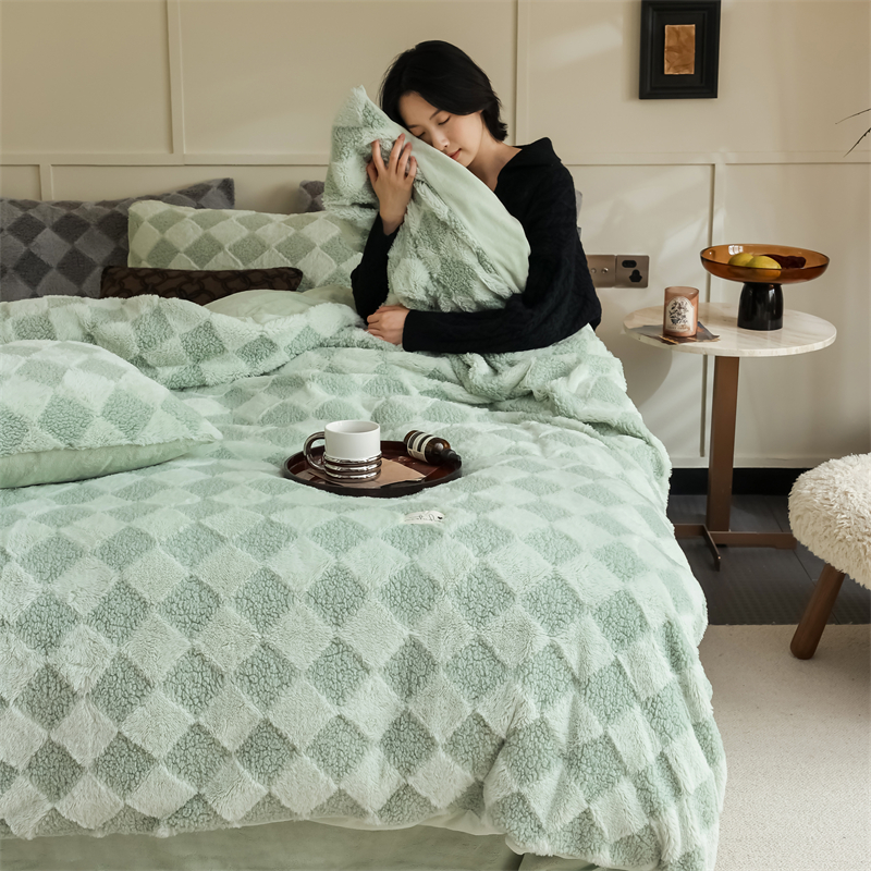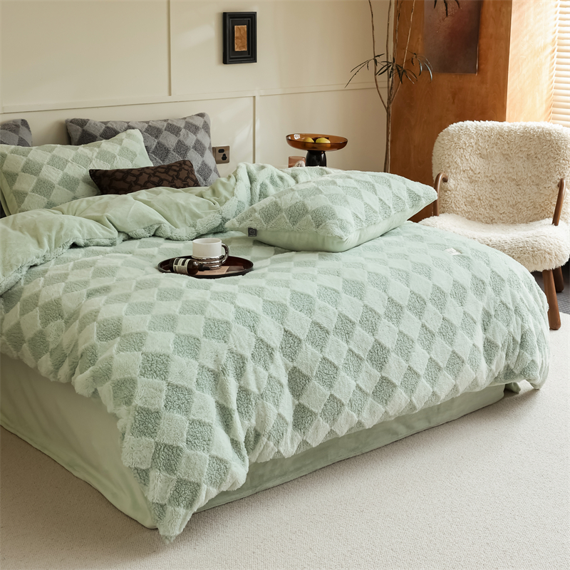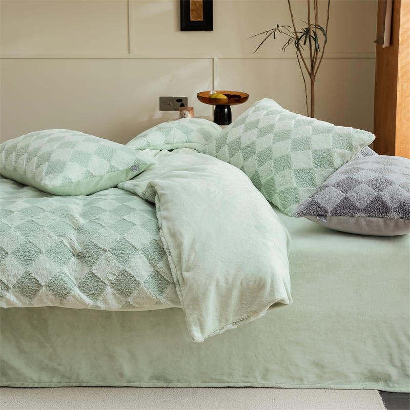 玉宇阁家居 2023新款兔毛雕花泰迪卷毛绒四件套-布洛丽格 青森绿
