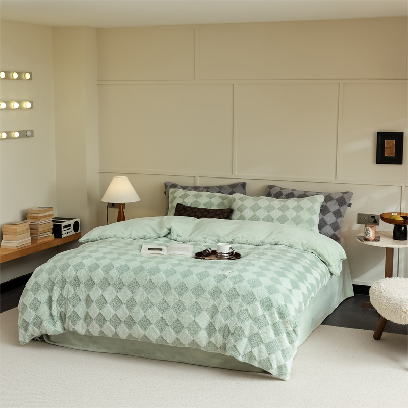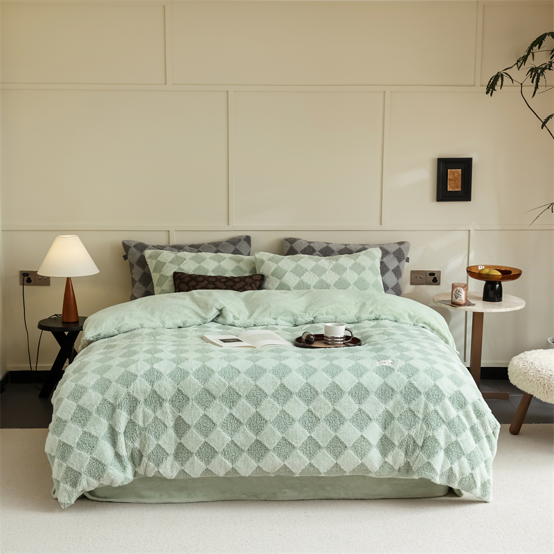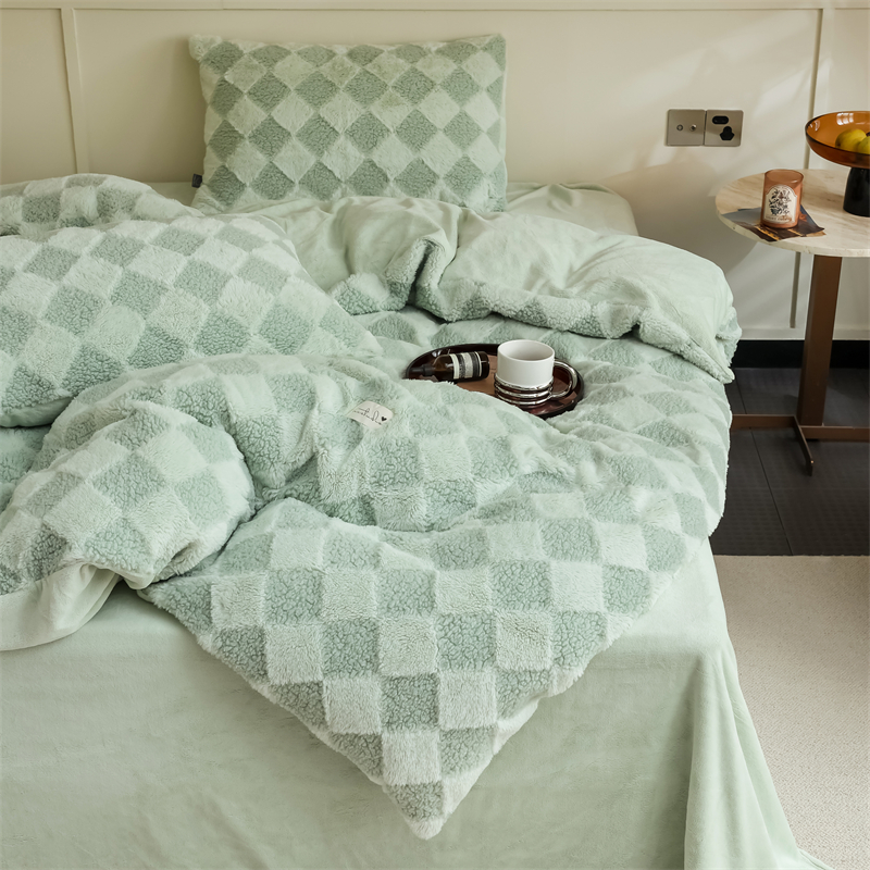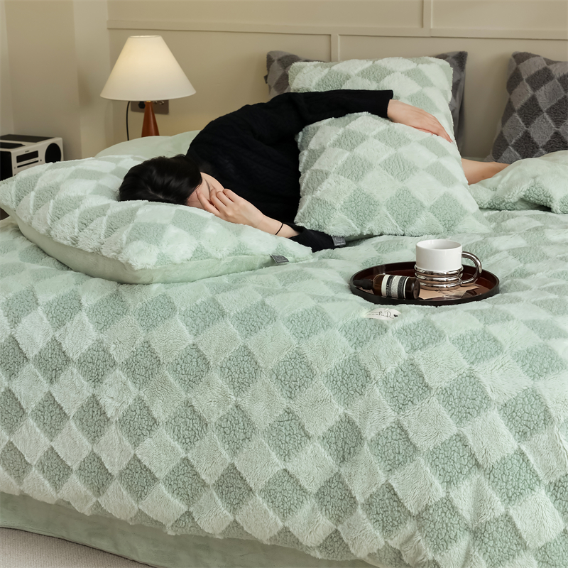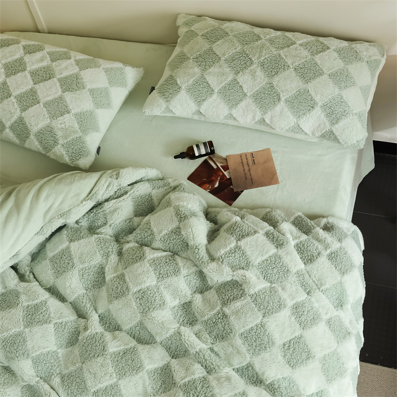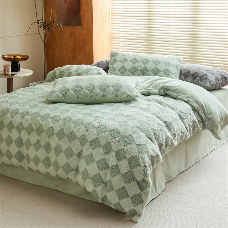 玉宇阁家居 2023新款兔毛雕花泰迪卷毛绒四件套-布洛丽格 青森绿