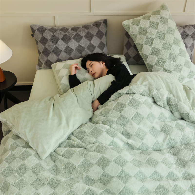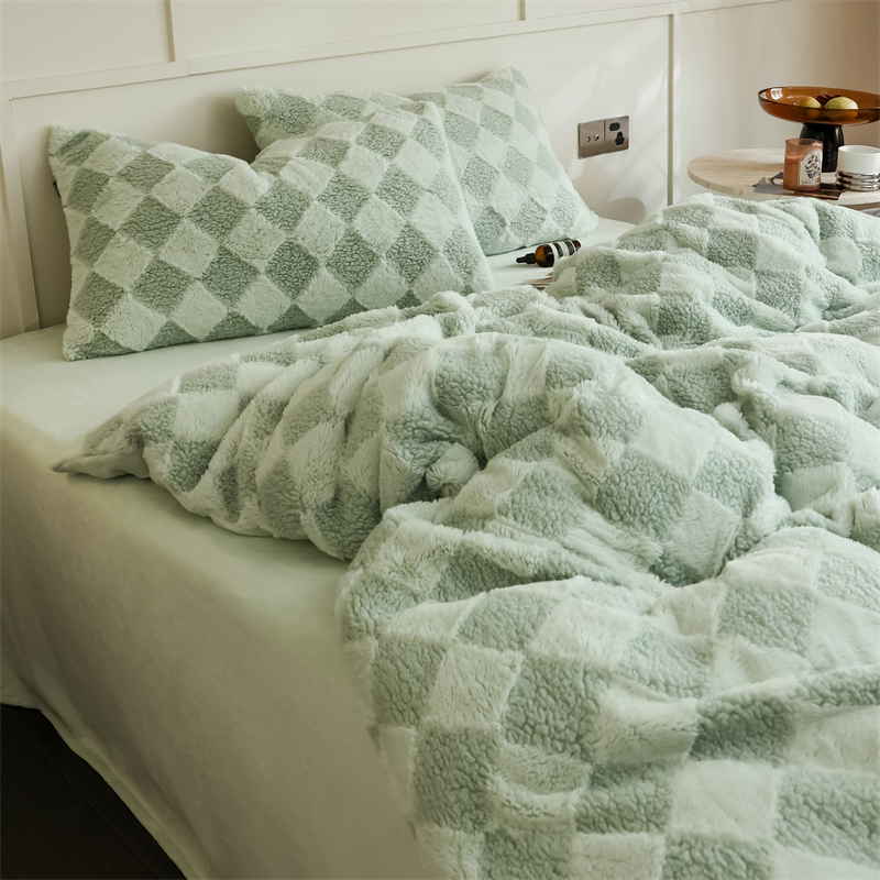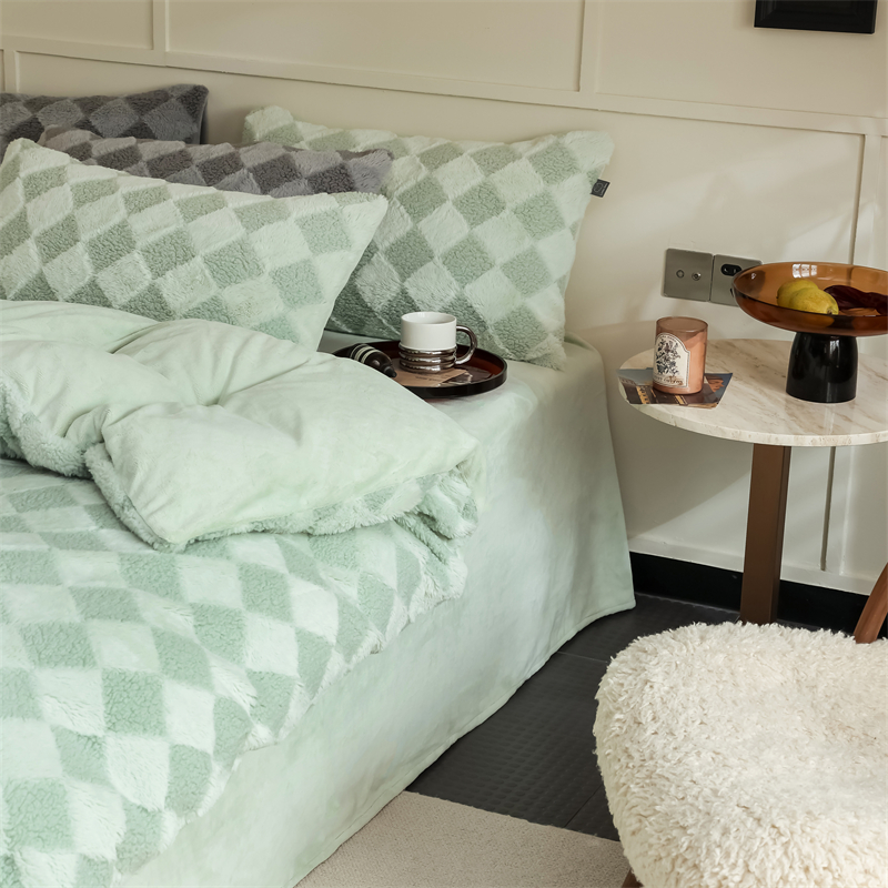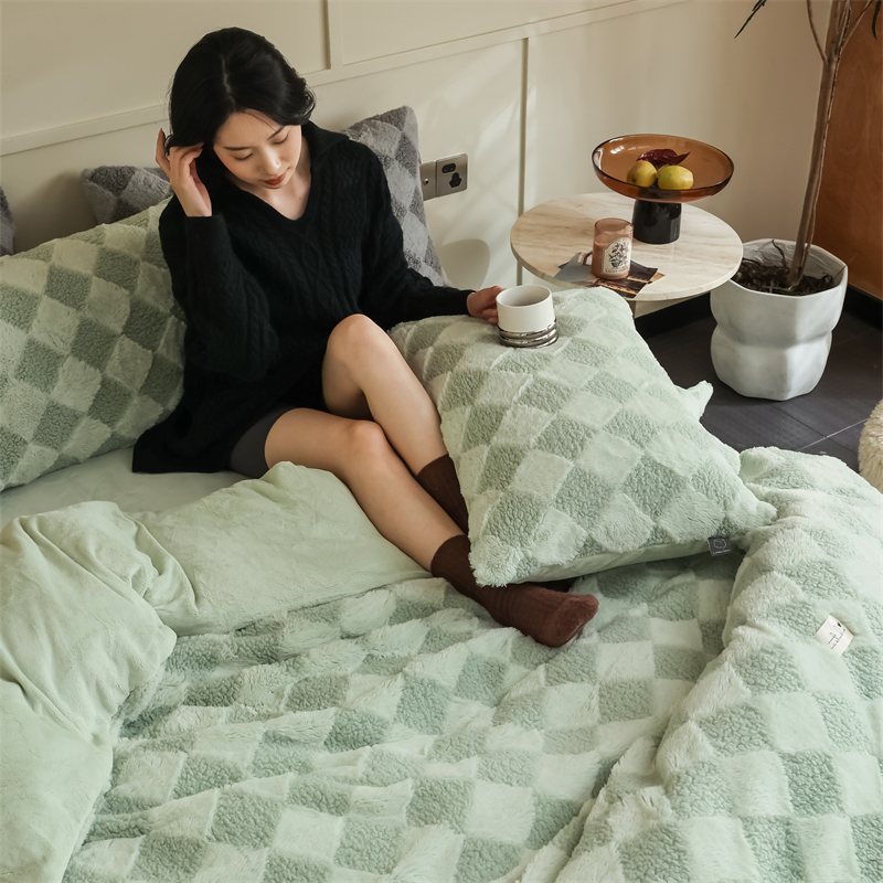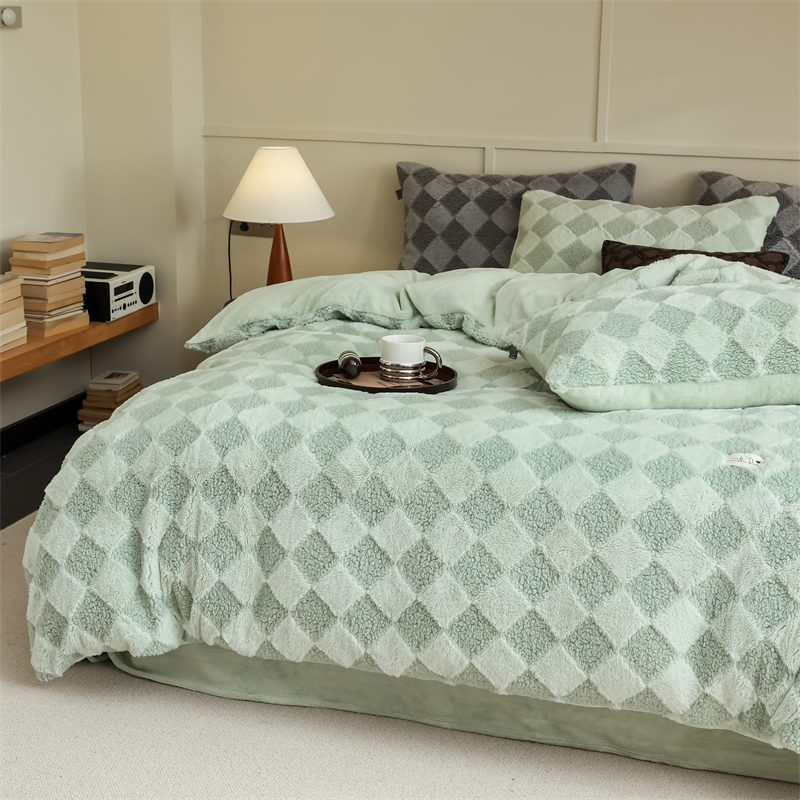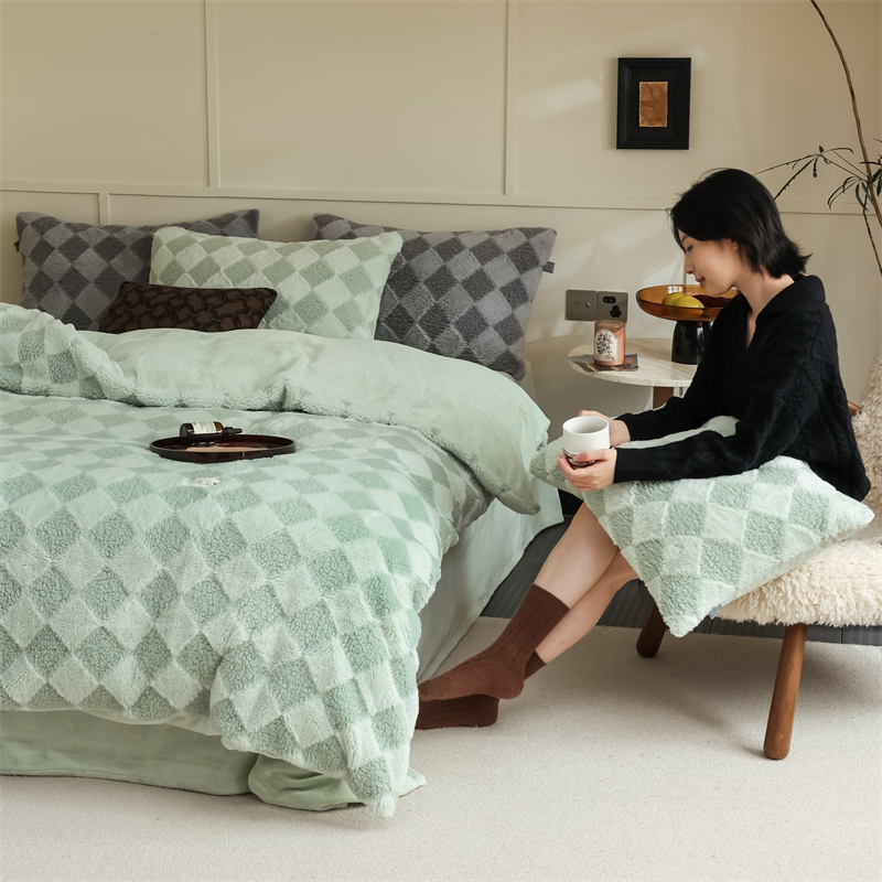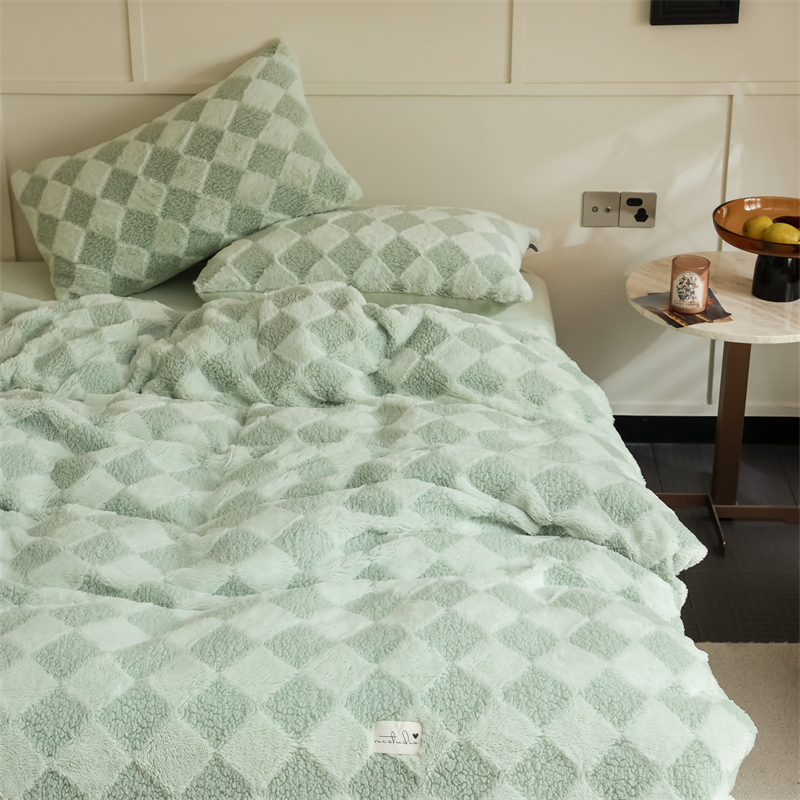 玉宇阁家居 2023新款兔毛雕花泰迪卷毛绒四件套-布洛丽格 青森绿