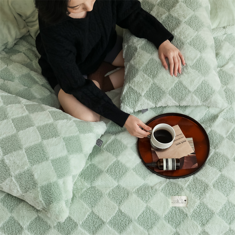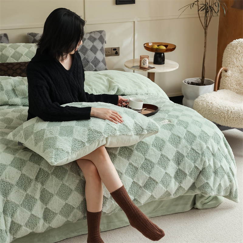 商品名称:玉宇阁家居 2023新款兔毛雕花泰迪卷毛绒四件套-布洛丽格 青森绿
