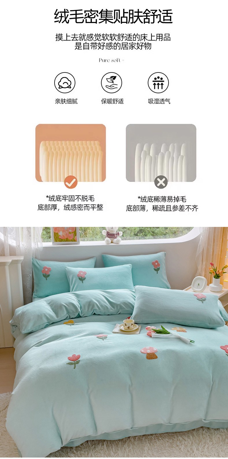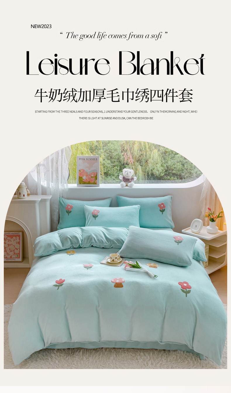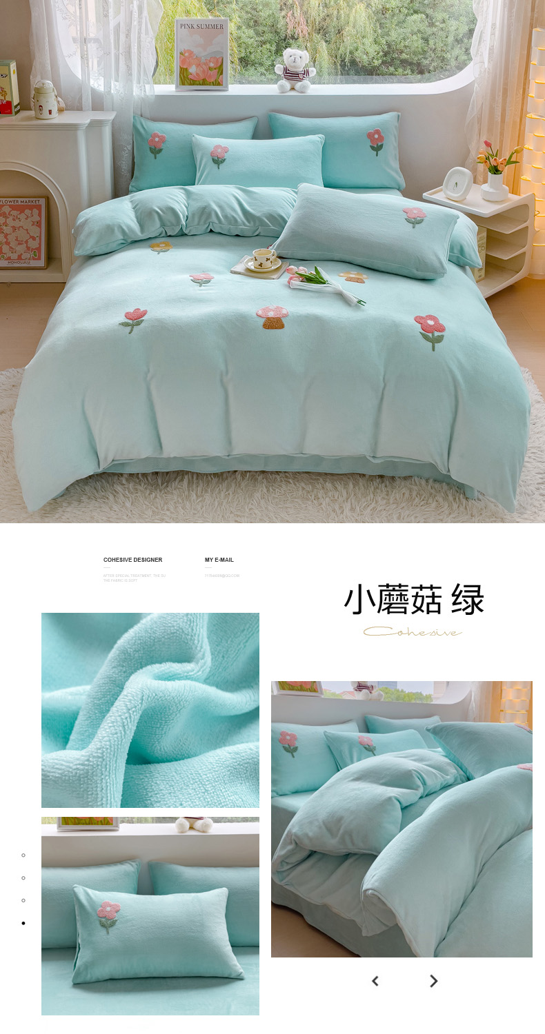 商品名称:菲儿家纺 2023新款牛奶绒毛巾绣四件套 小蘑菇-绿