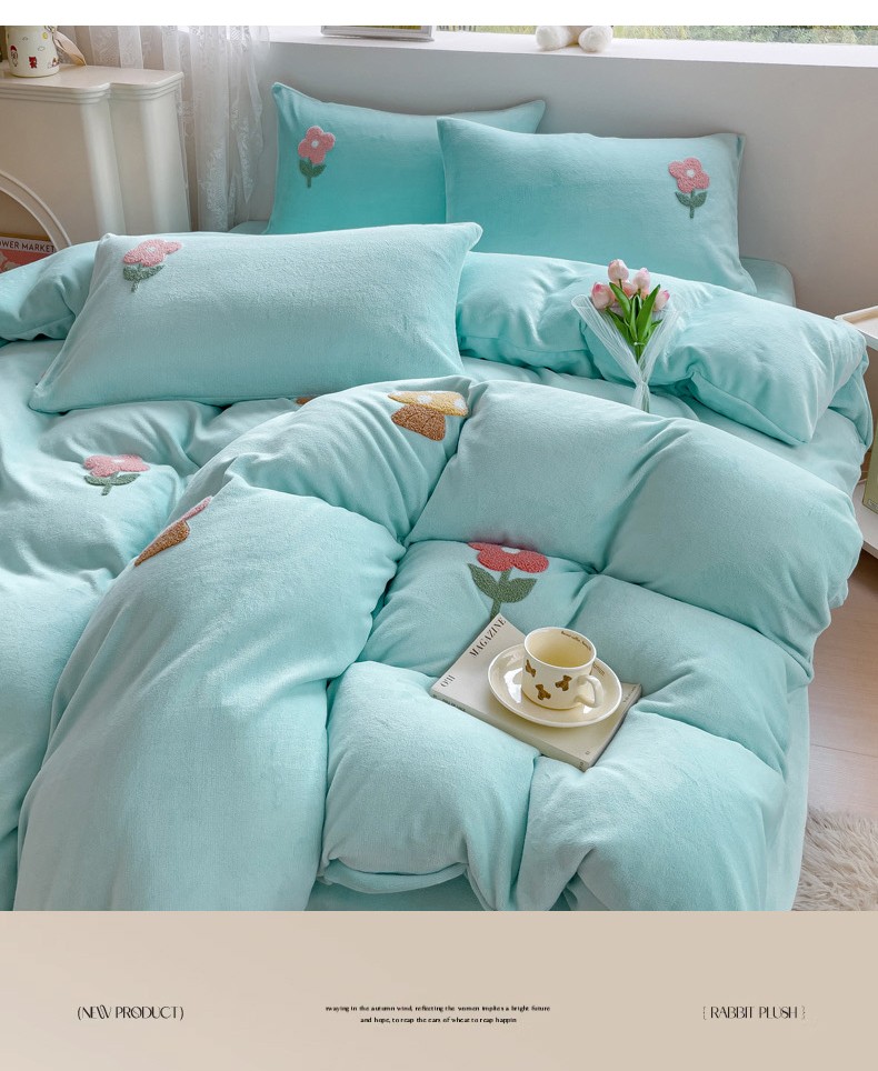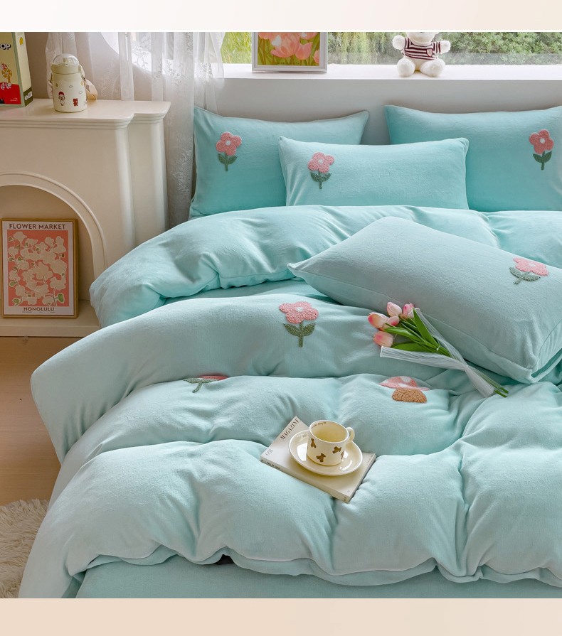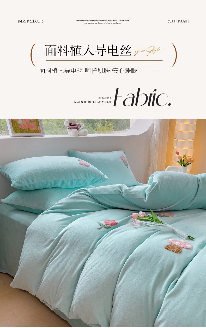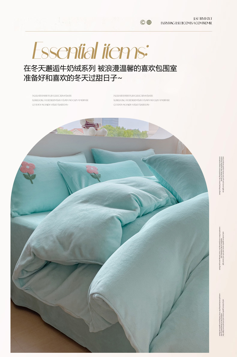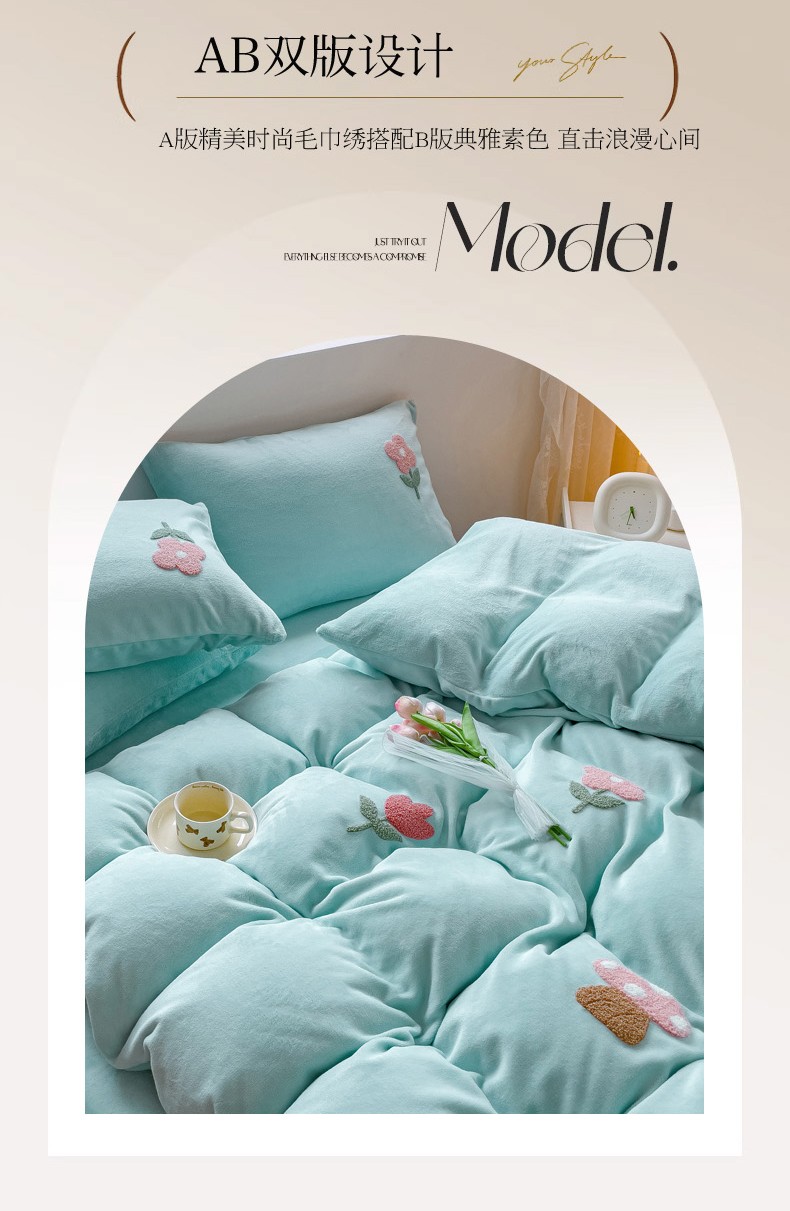 商品名称:菲儿家纺 2023新款牛奶绒毛巾绣四件套 小蘑菇-绿