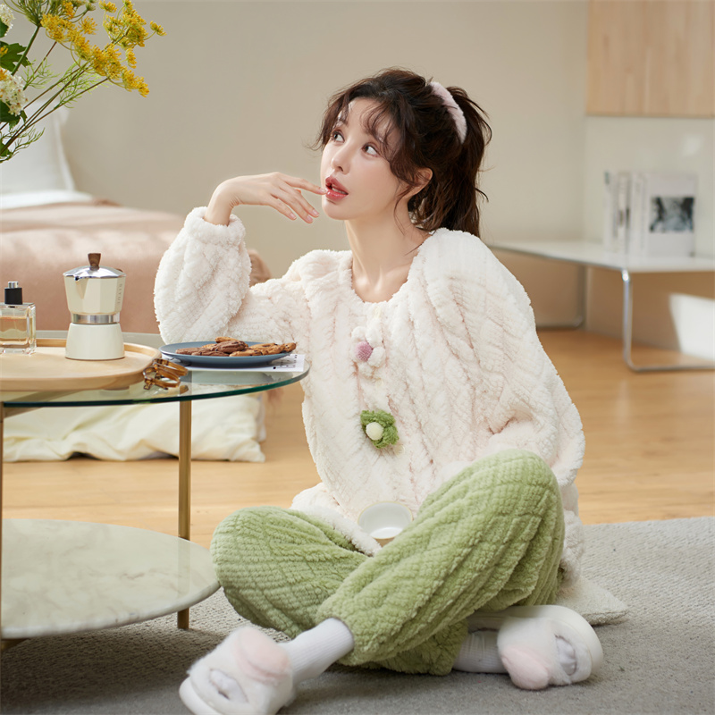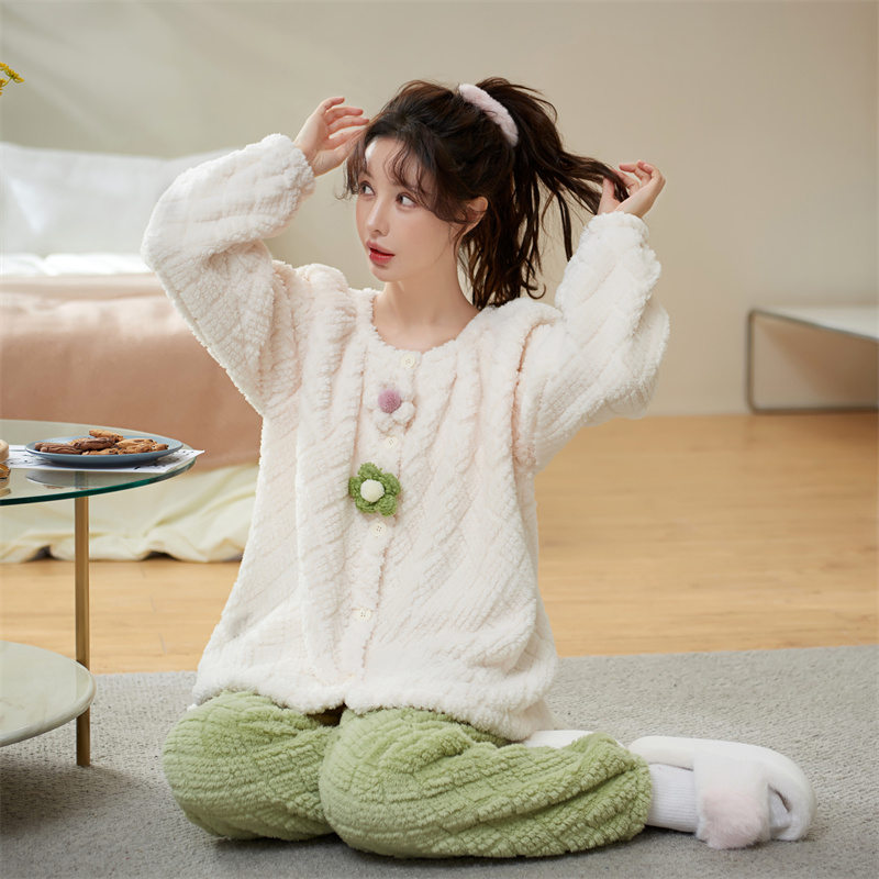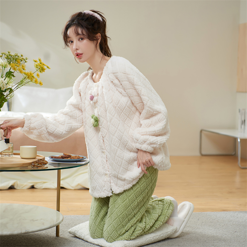 (总)洛兰沙家居馆 2024新款秋冬季清新款睡衣女三层夹棉珊瑚绒加厚保暖两件套女士可外穿加绒家居服,白色