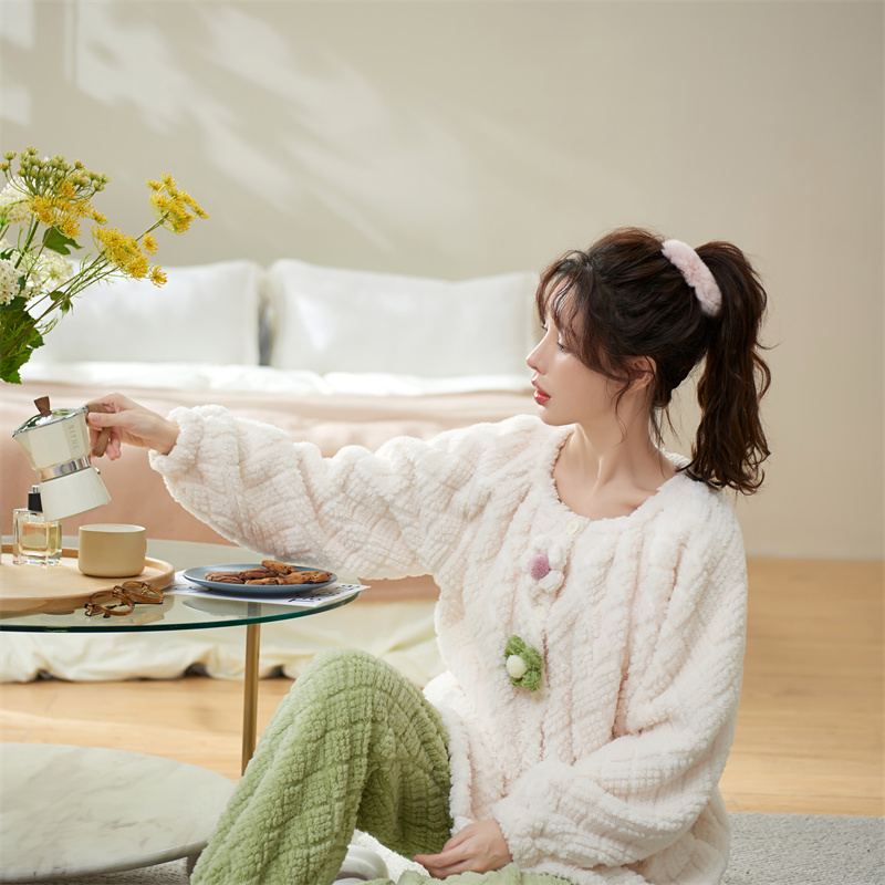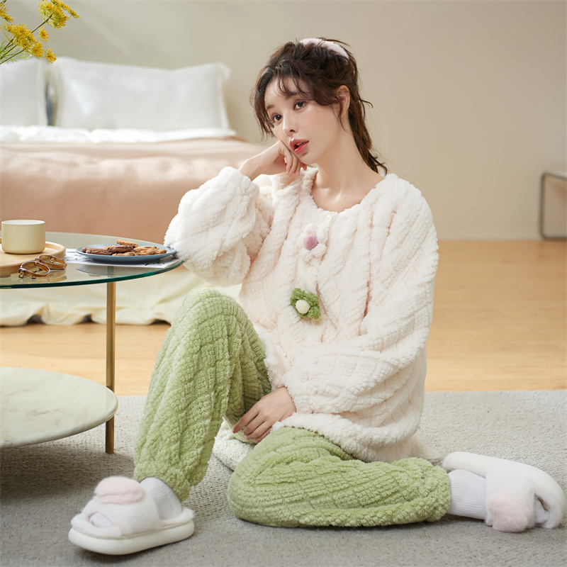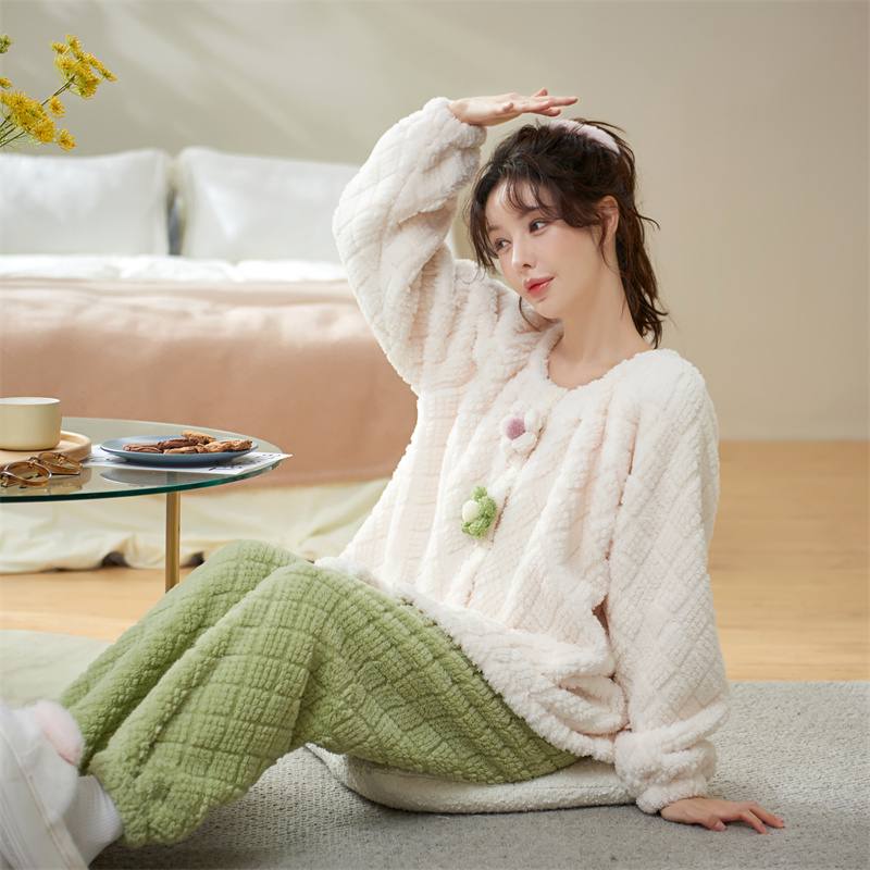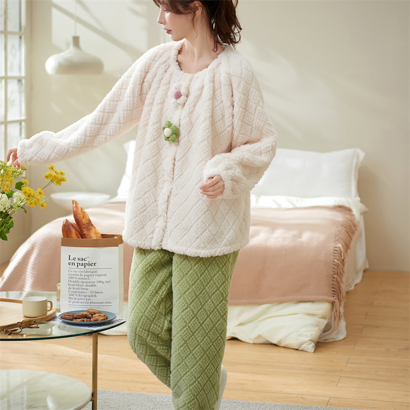 (总)洛兰沙家居馆 2024新款清新款睡衣女秋冬三层夹棉珊瑚绒加厚保暖两件套女士可外穿加绒家居服,99078,99077,99064,99065,99076,99063,99062