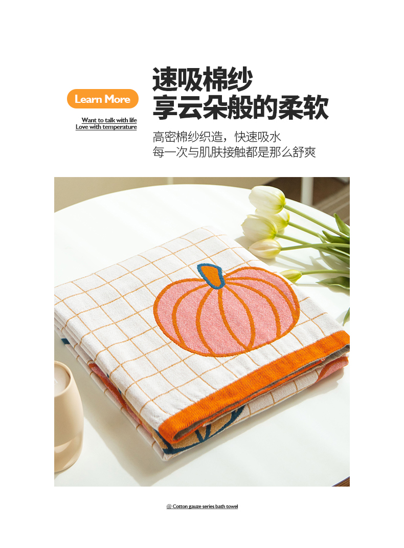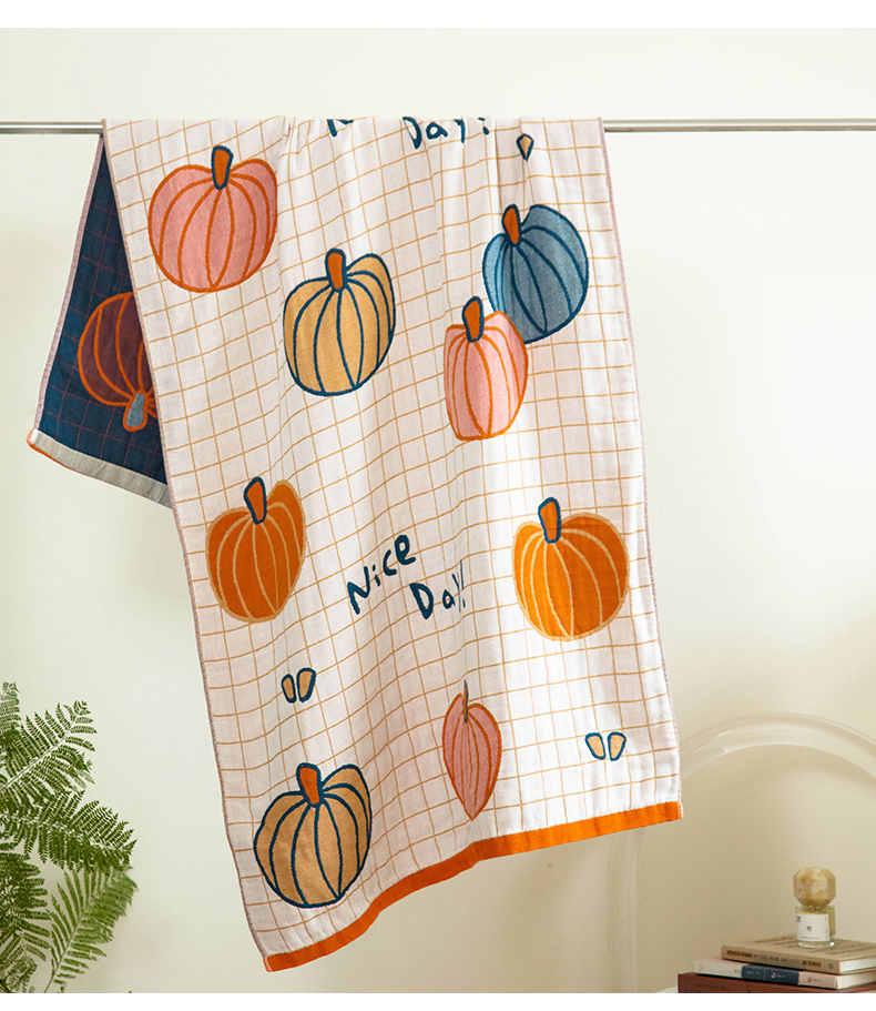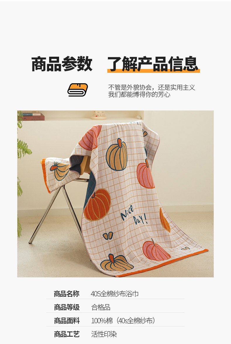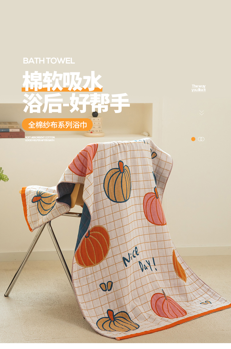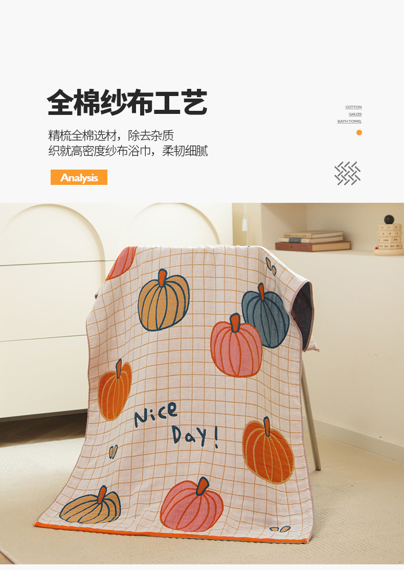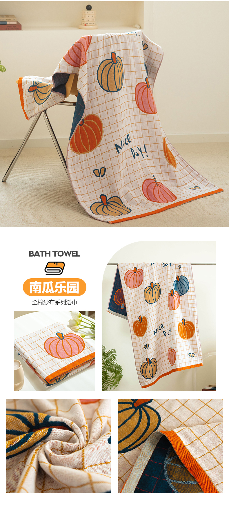当前位置: 91家纺网 > 商品网购 > 居家日用 > 毛巾/浴巾/浴袍 > 浴巾 > 雯雨家纺 2023新款全棉卡通系列纱布浴巾 南瓜乐园