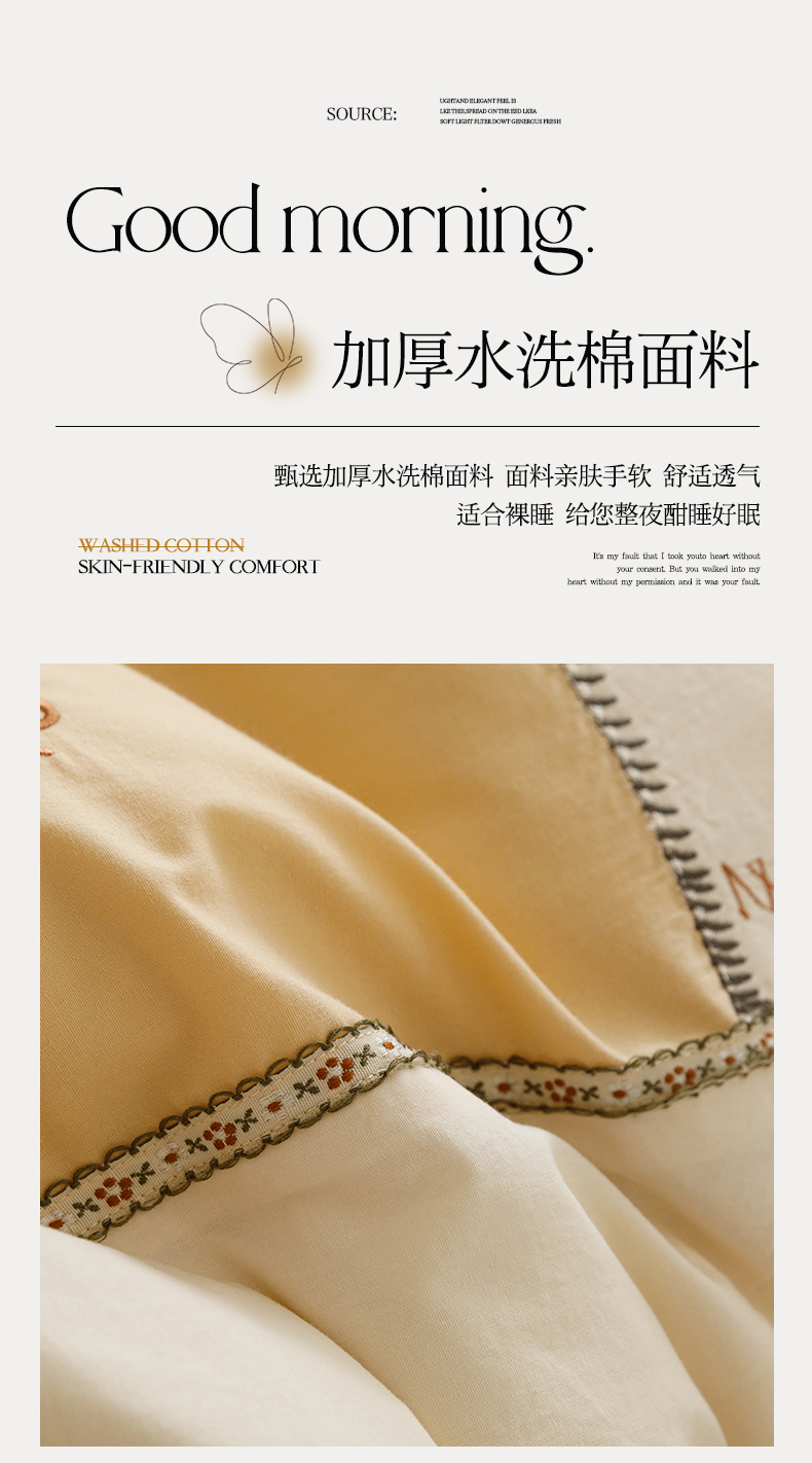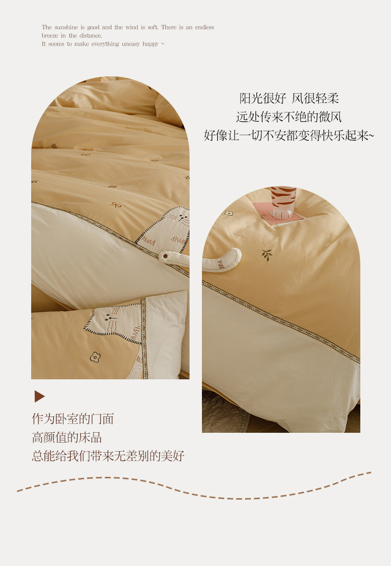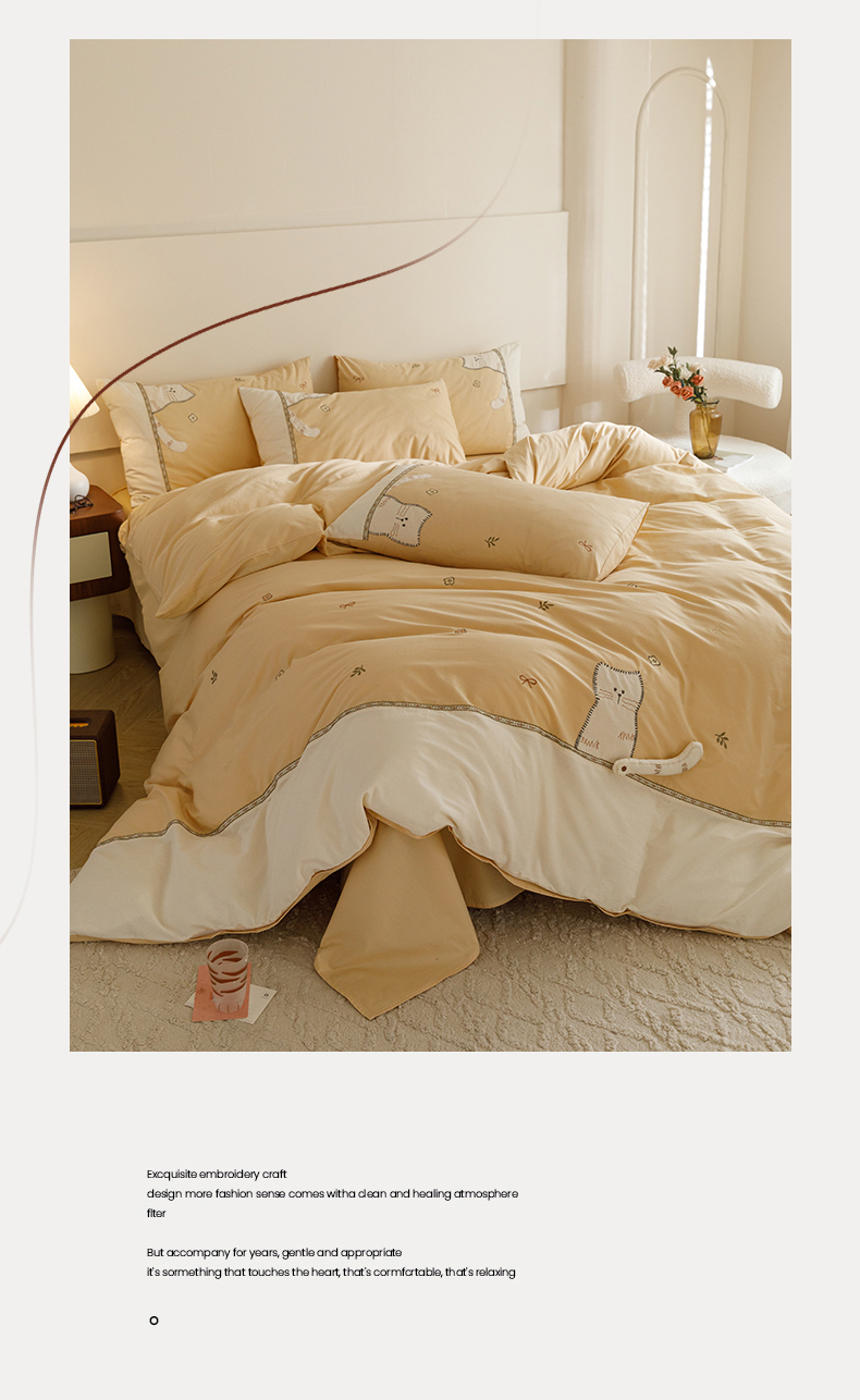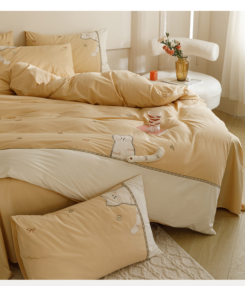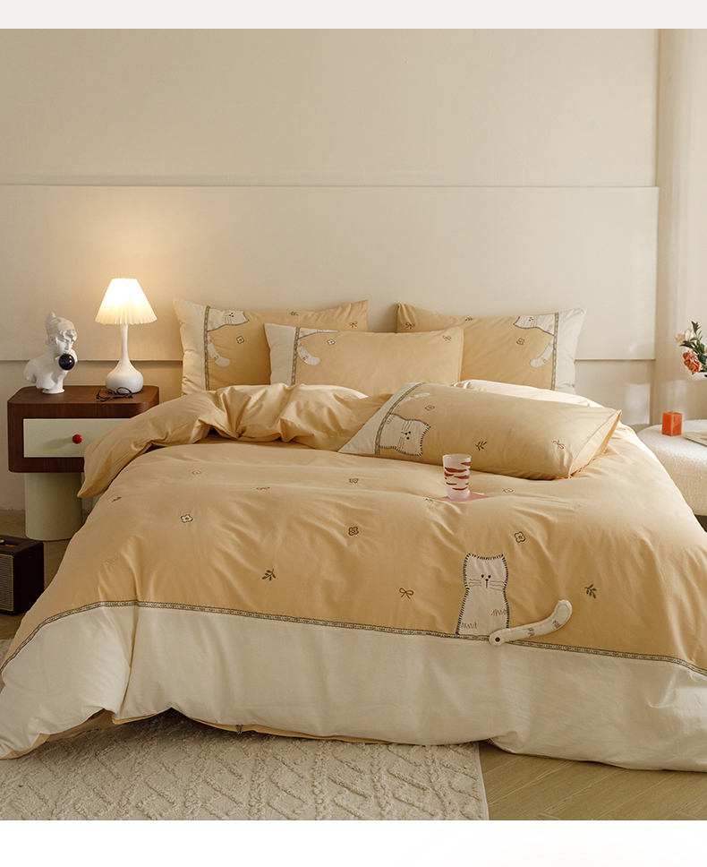 艾莱家纺 2024新款水洗棉加厚绣花四件套 卡其cat