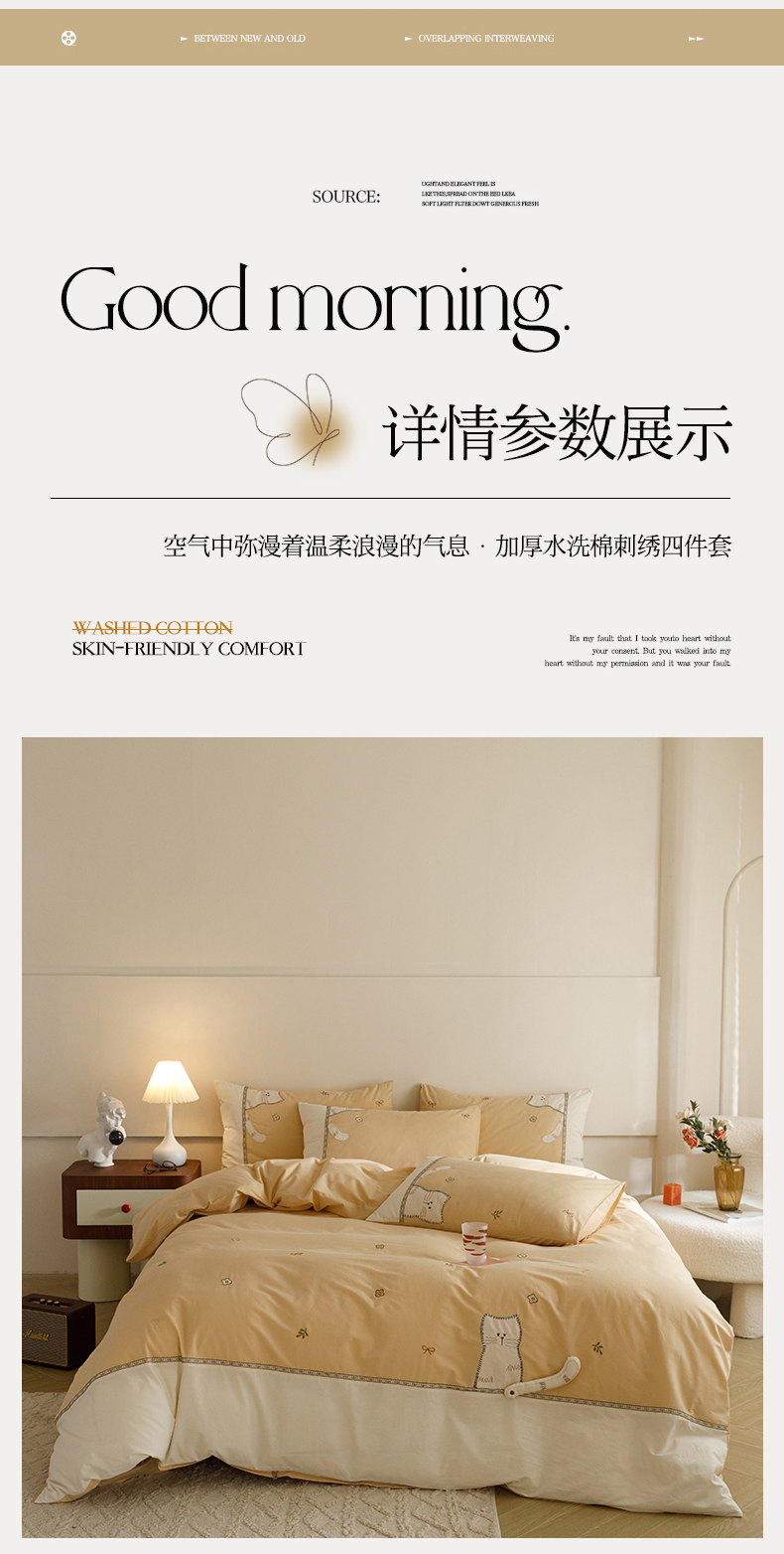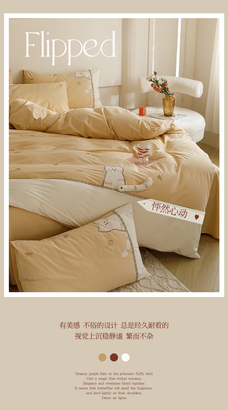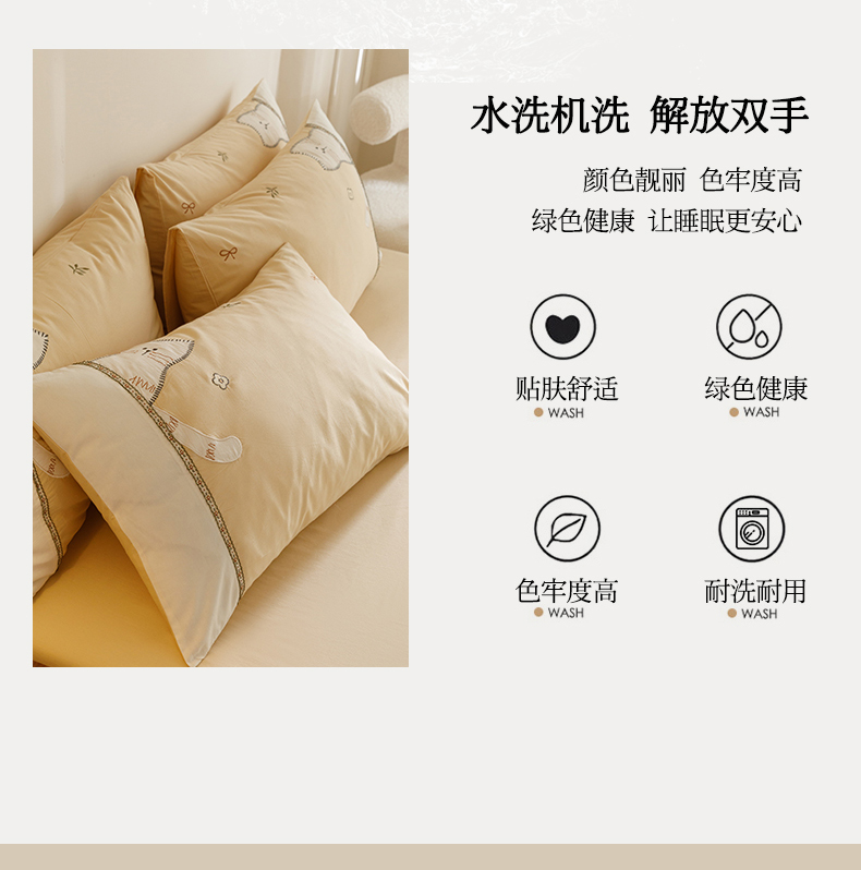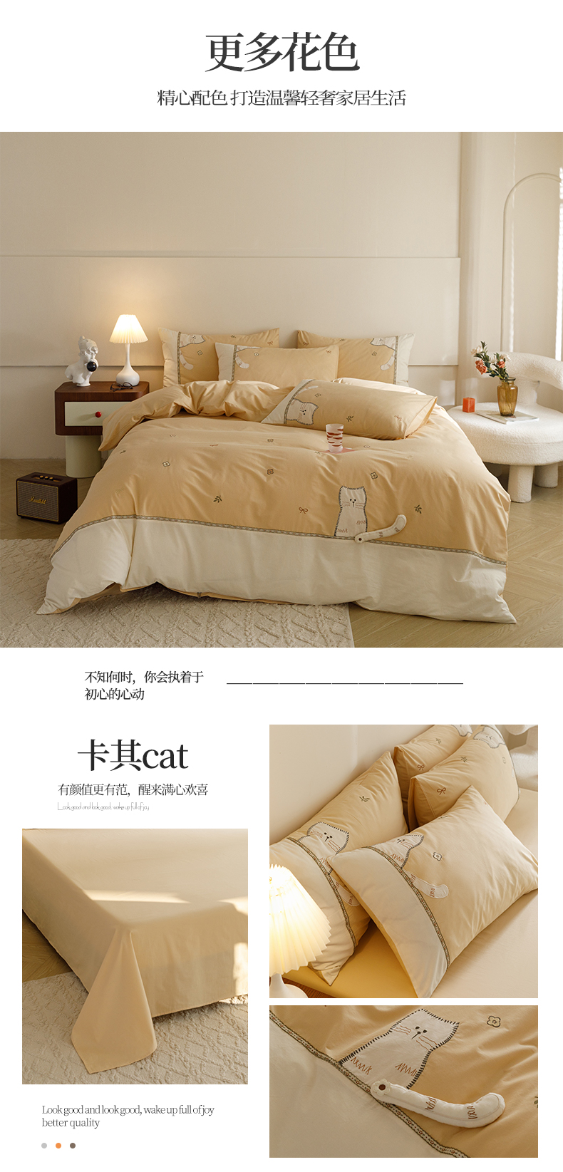 艾莱家纺 2024新款水洗棉加厚绣花四件套 卡其cat