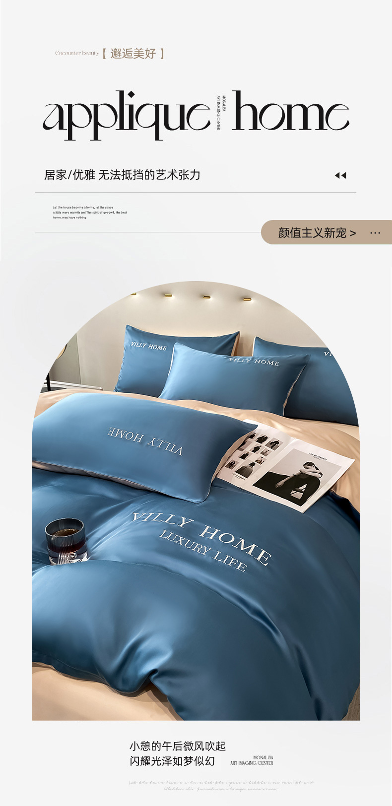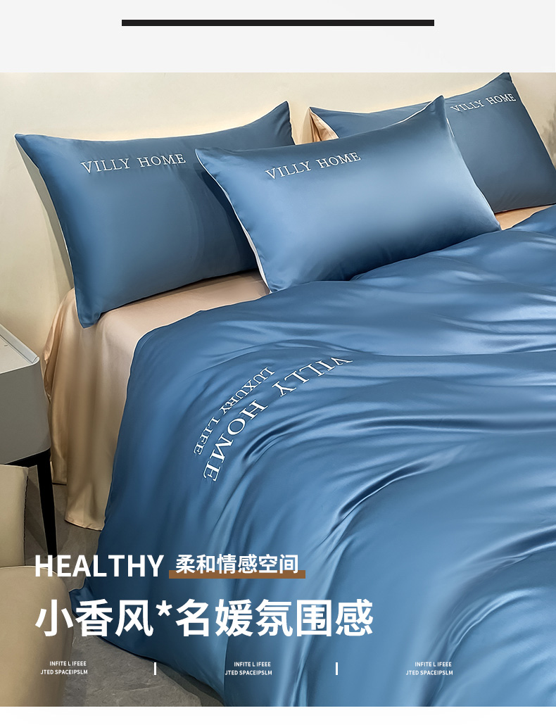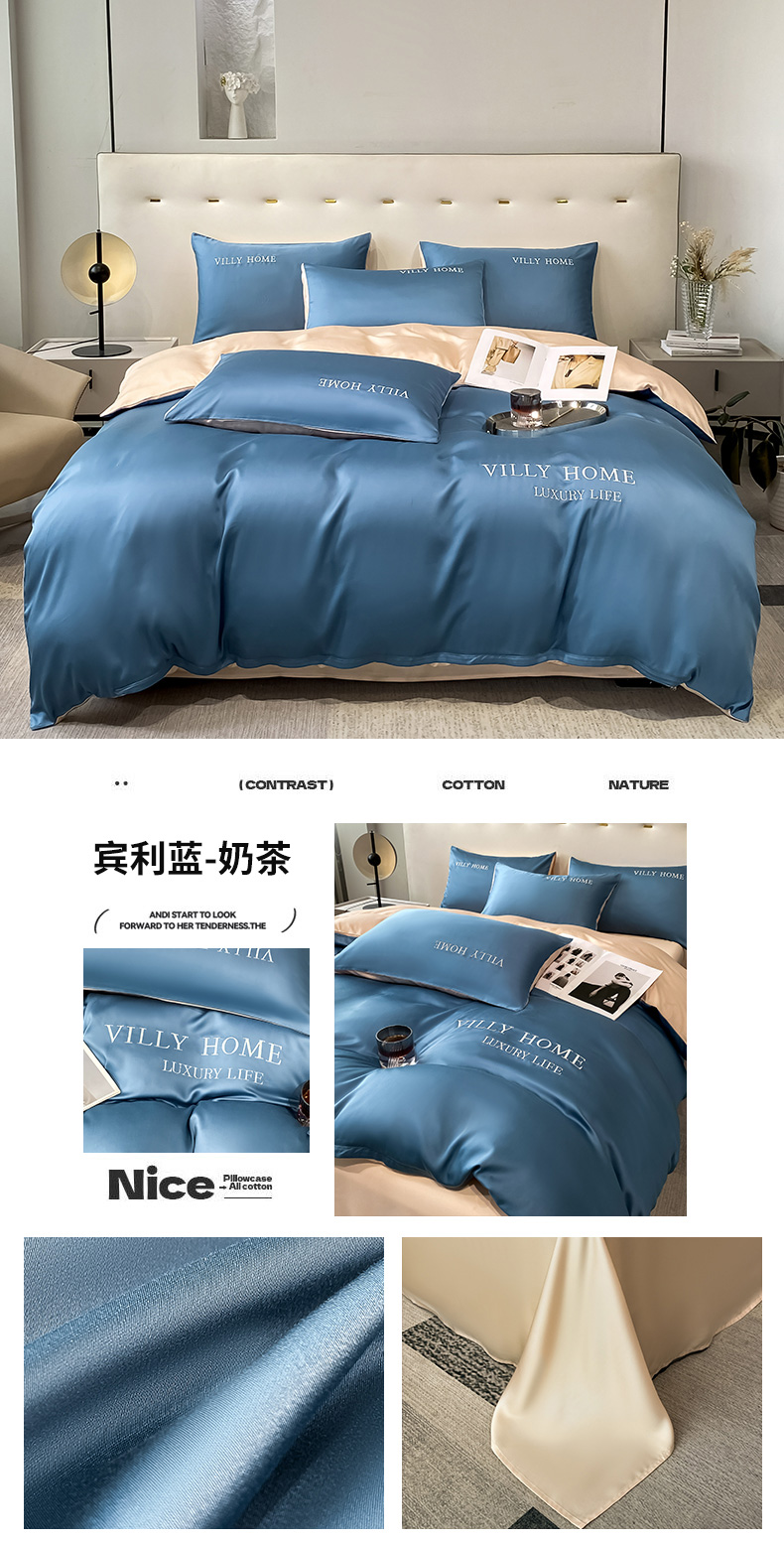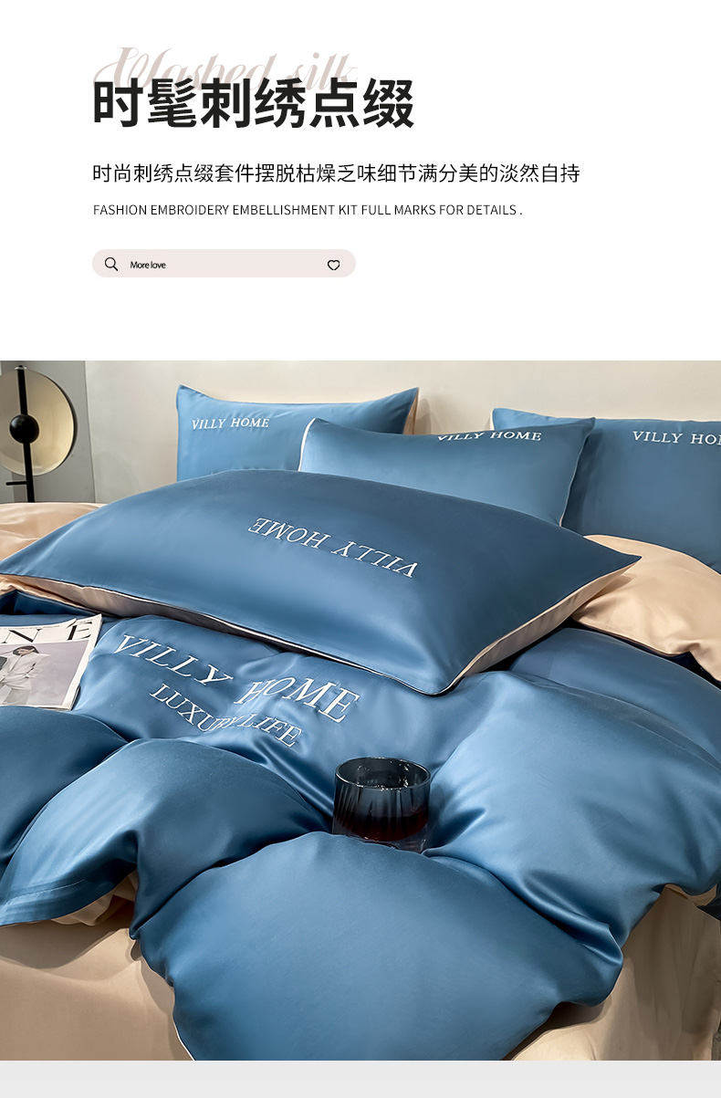 当前位置: 91家纺网 > 商品网购 > 床品套件 > 四件套 > 水洗真丝四件套 > 眠帛家居 2024新款水洗真丝绣花四件套-惟丽系列 宾利蓝-奶茶