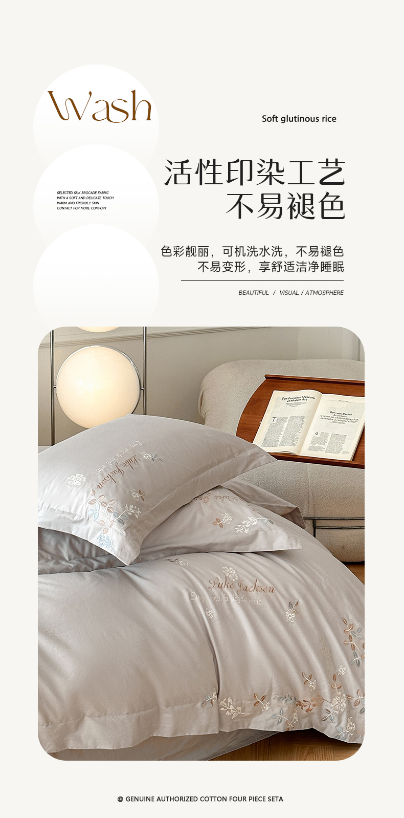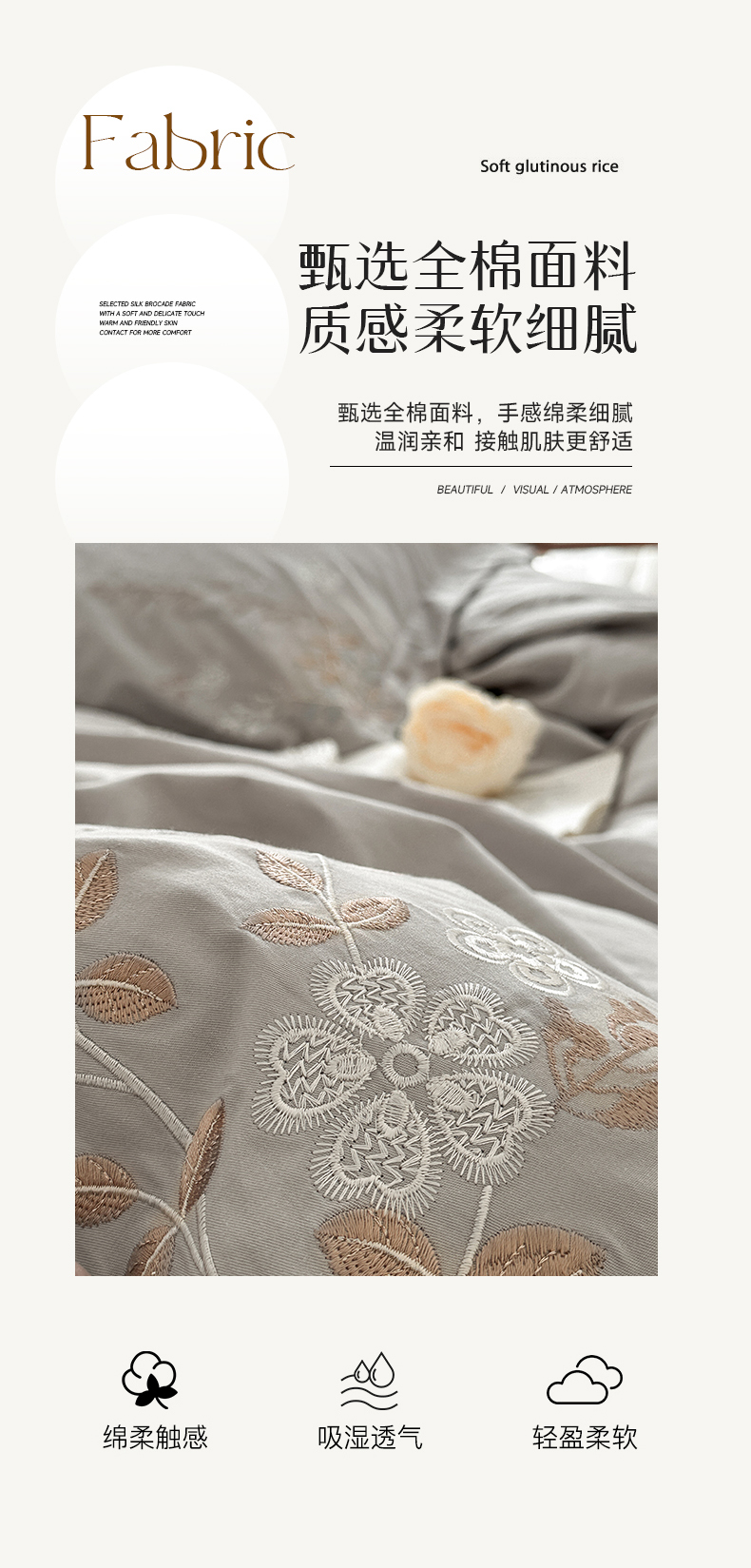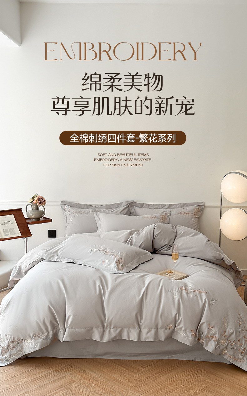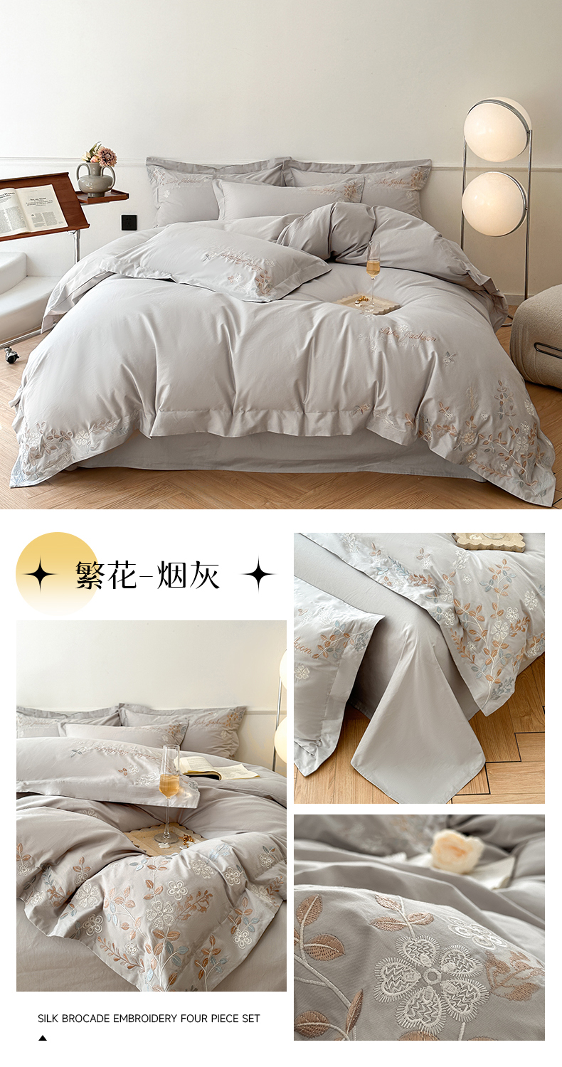 商品名称:金牛座 2025新款A类长绒棉全棉刺绣四件套【配礼盒】 繁花-烟灰