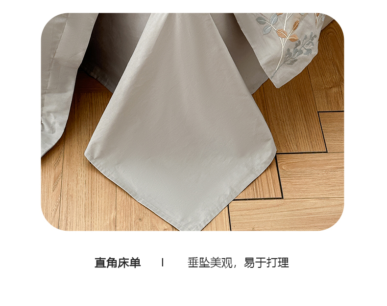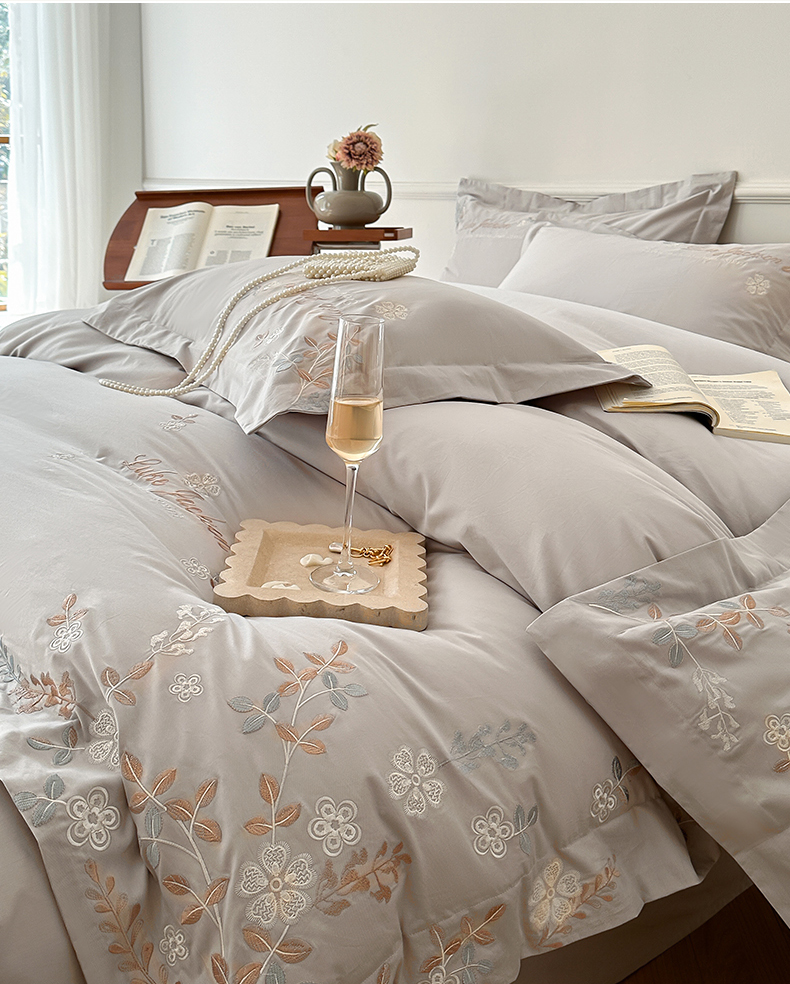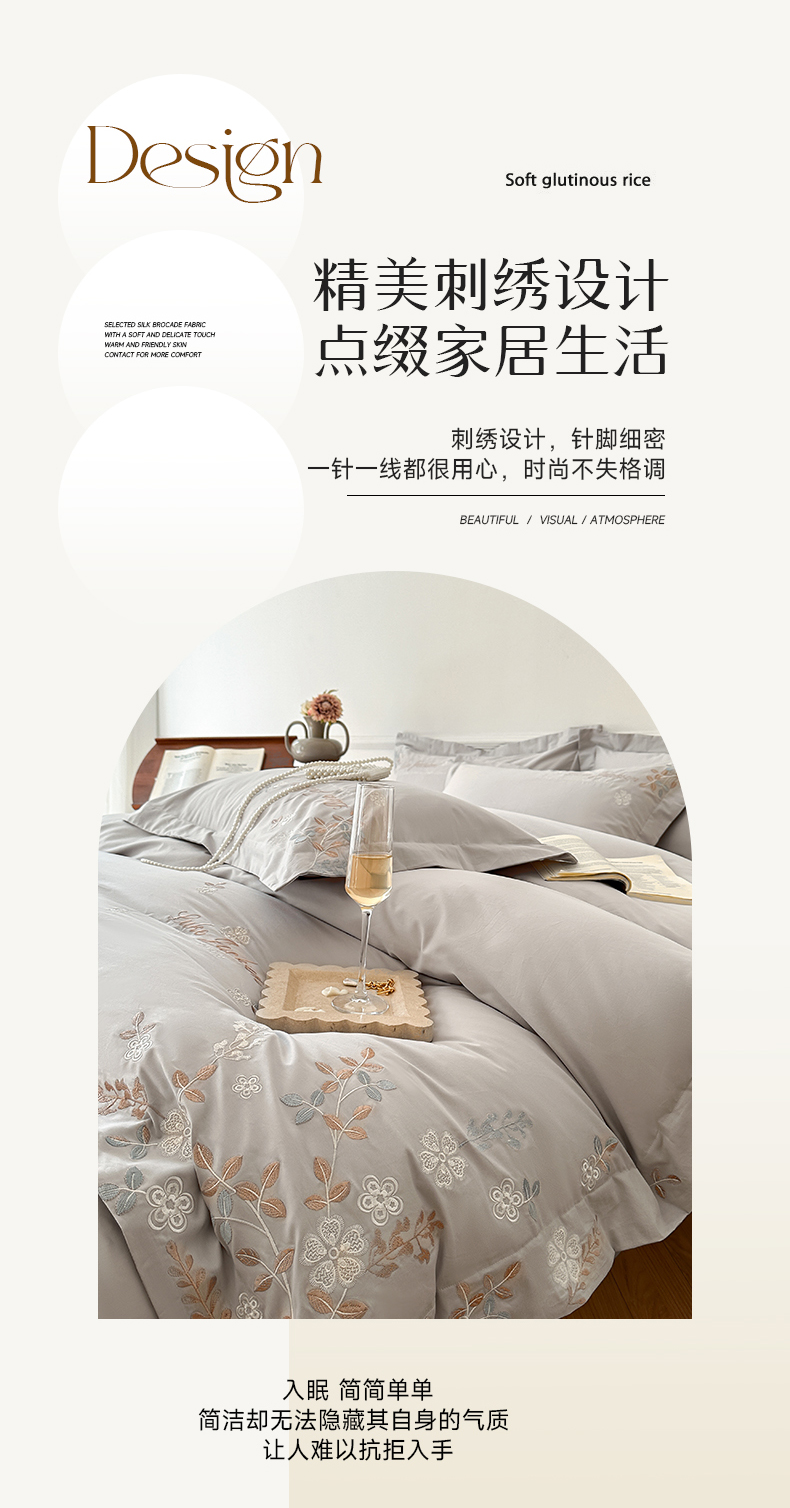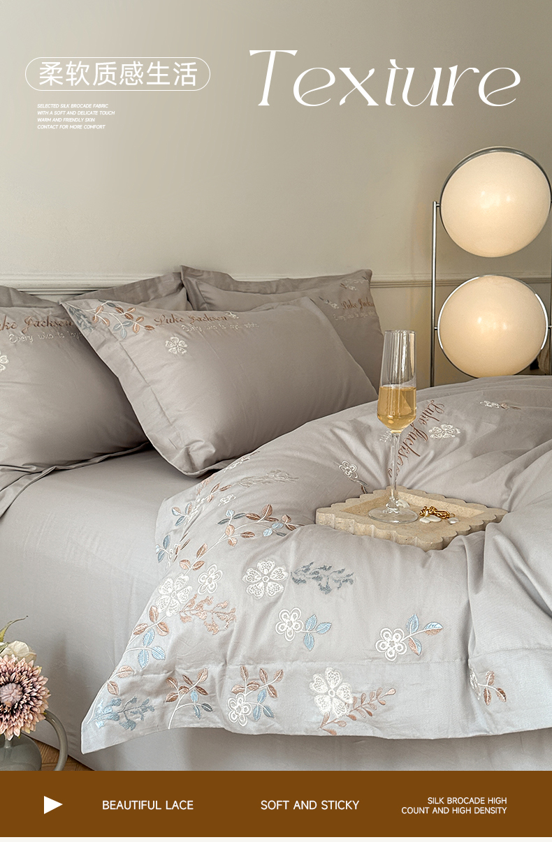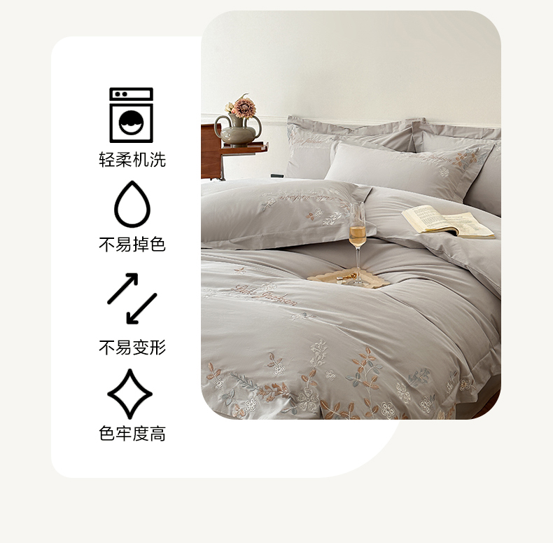 商品名称:金牛座 2025新款A类长绒棉全棉刺绣四件套【配礼盒】 繁花-烟灰