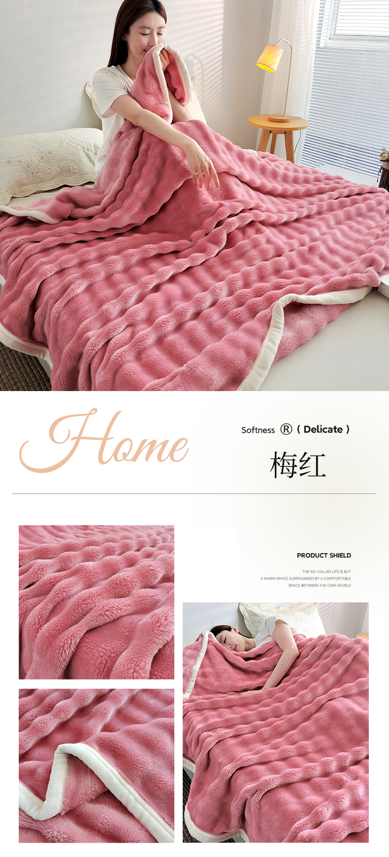 (总)美洲琳 2025新款提花简约珊瑚绒法莱绒毯毛毯毯子,白色,粉色,咖色,蓝灰,绿色,深灰