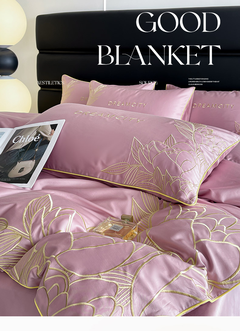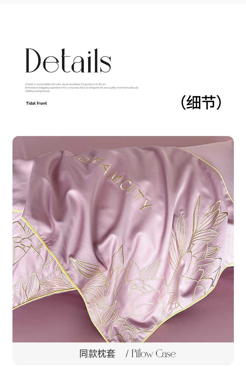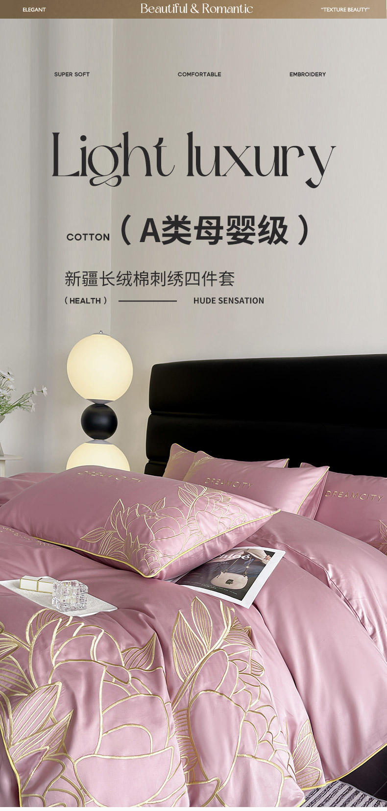 商品名称: 【A类母婴级】100支长绒棉四件套全棉纯棉金线刺绣酒店风纯色简约床笠款澳棉天丝棉棉轻奢床上用品 莲芙蓉-豆沙色
