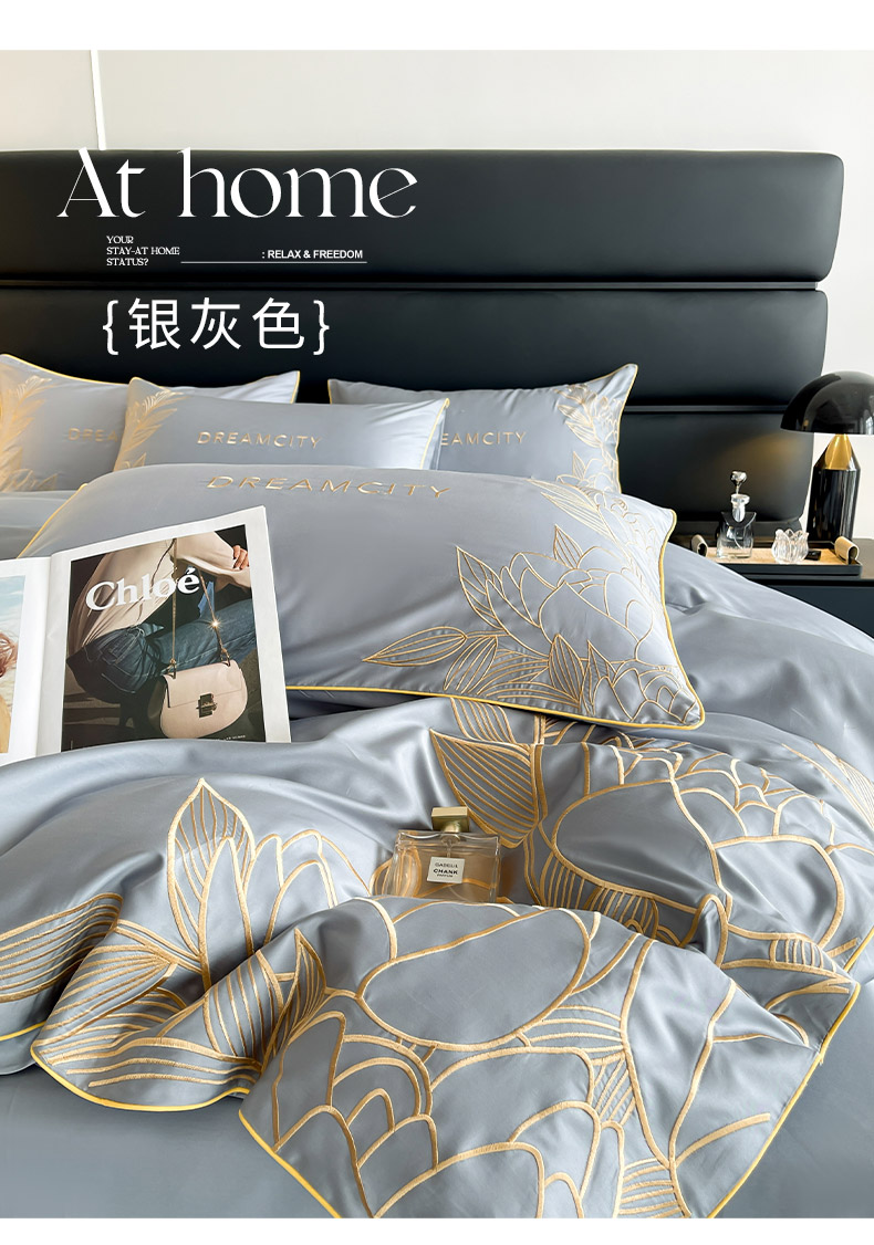 【A类母婴级】100支长绒棉四件套全棉纯棉金线刺绣酒店风纯色简约床笠款澳棉天丝棉棉轻奢床上用品 莲芙蓉-豆沙色