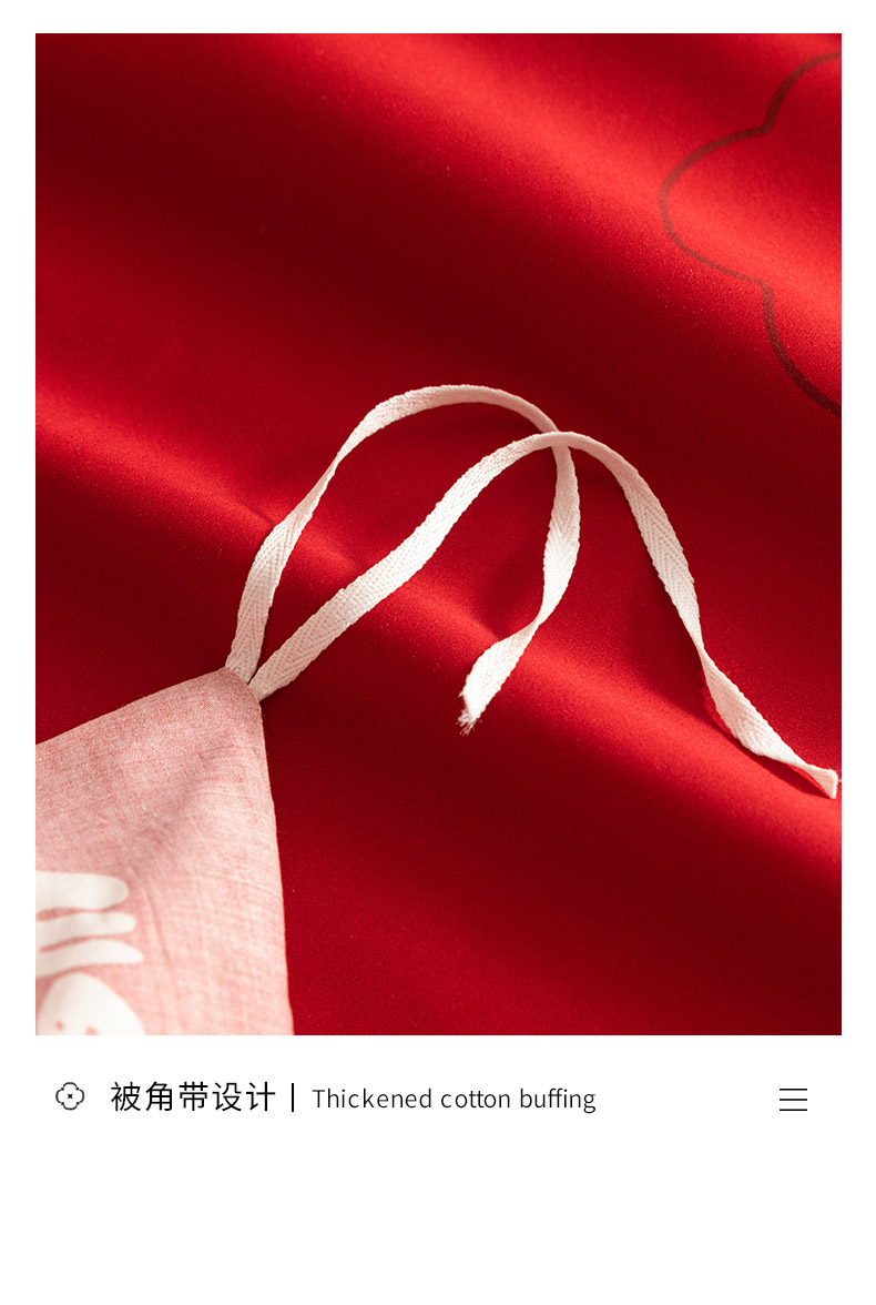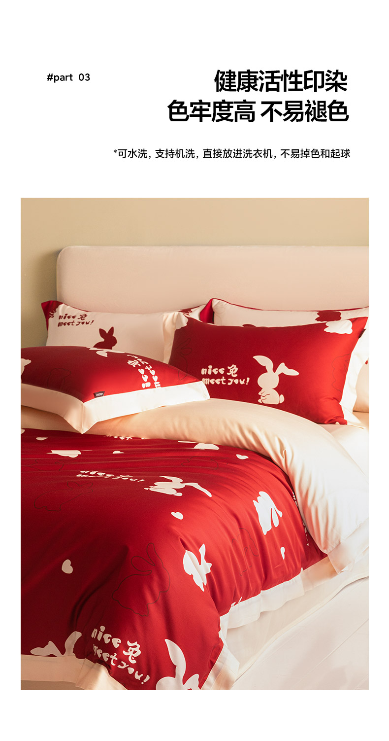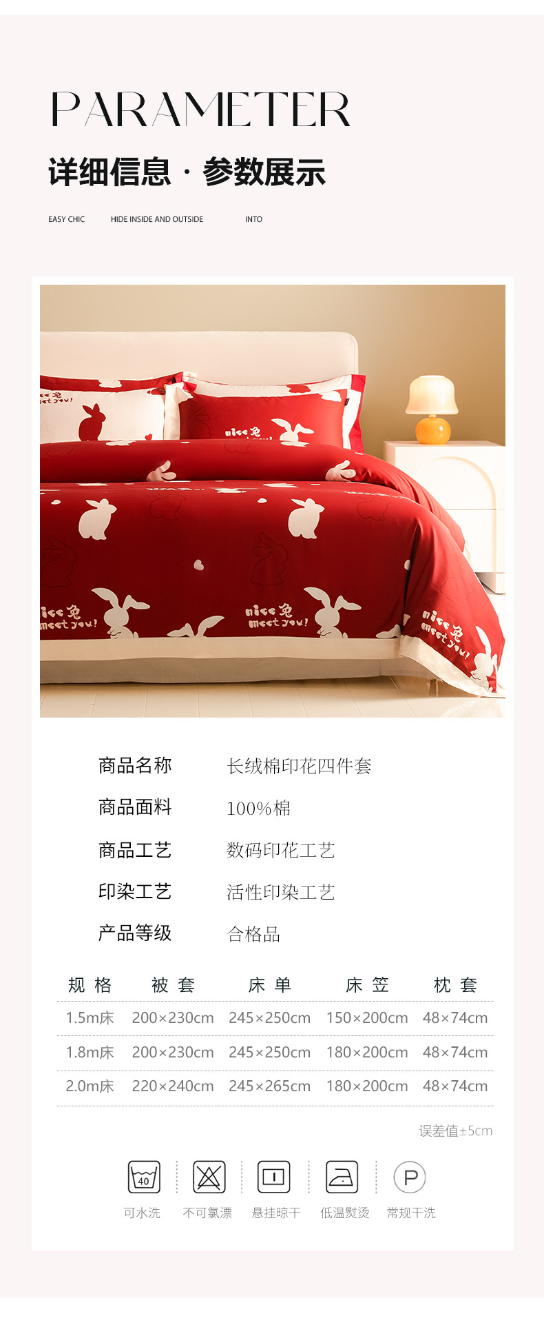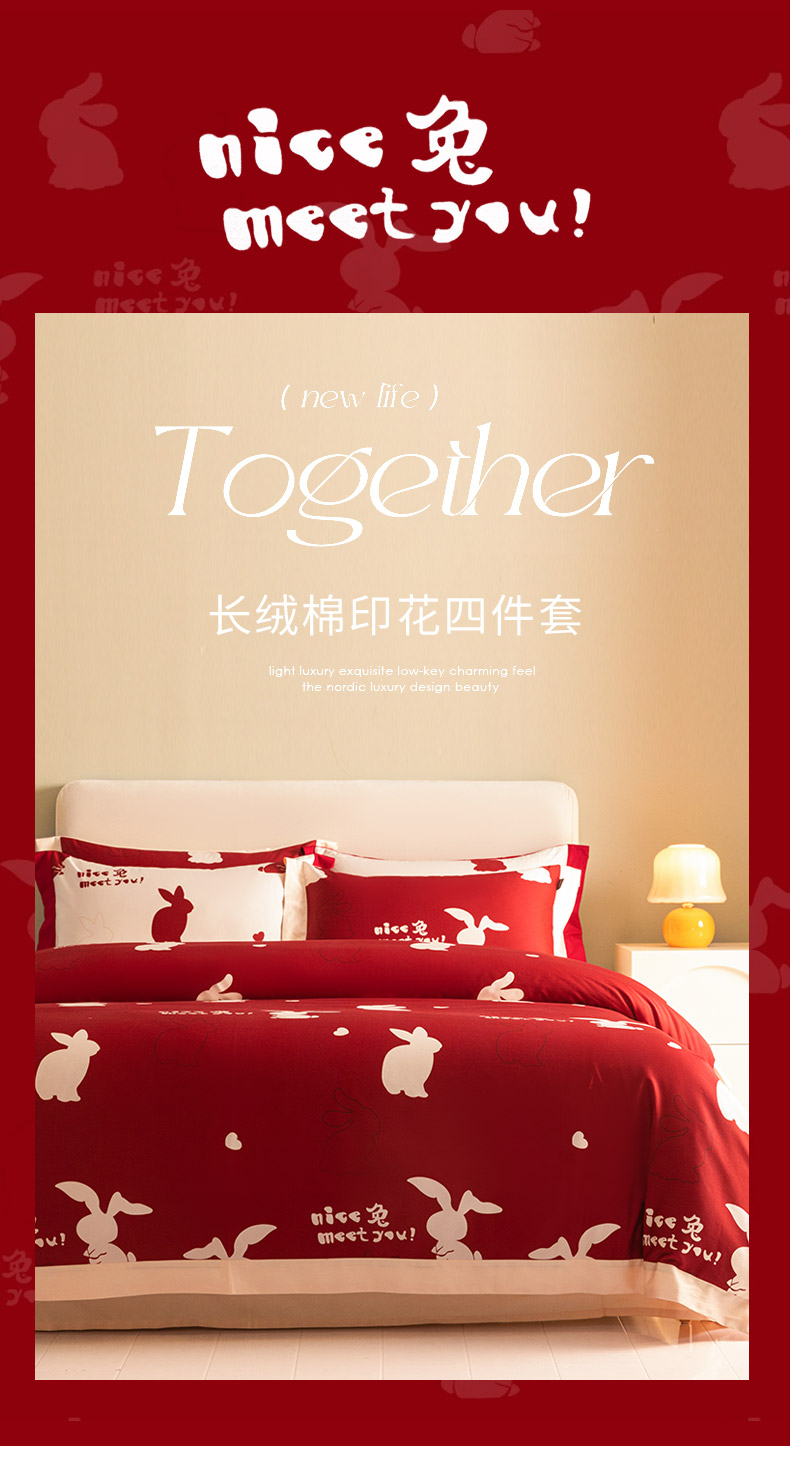 当前位置: 91家纺网 > 商品网购 > 床品套件 > 四件套 > 全棉普通四件套 > 【婚嫁新品】100支长绒棉四件套全棉纯棉北欧风印花床上用品轻奢风床笠款 nice兔 喜庆红