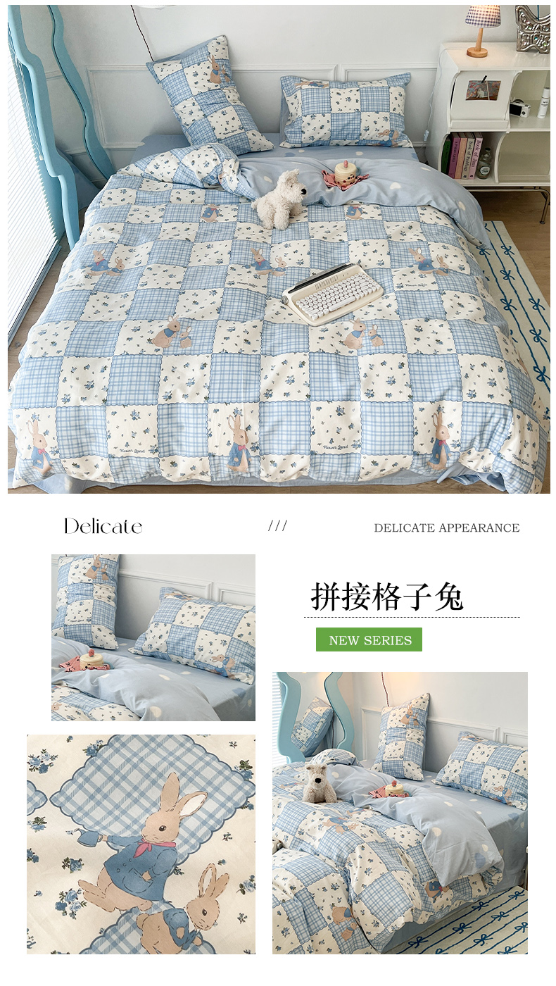 商品名称:2024新款13070跑量款全棉四件套--卡通系列 拼接格子兔
