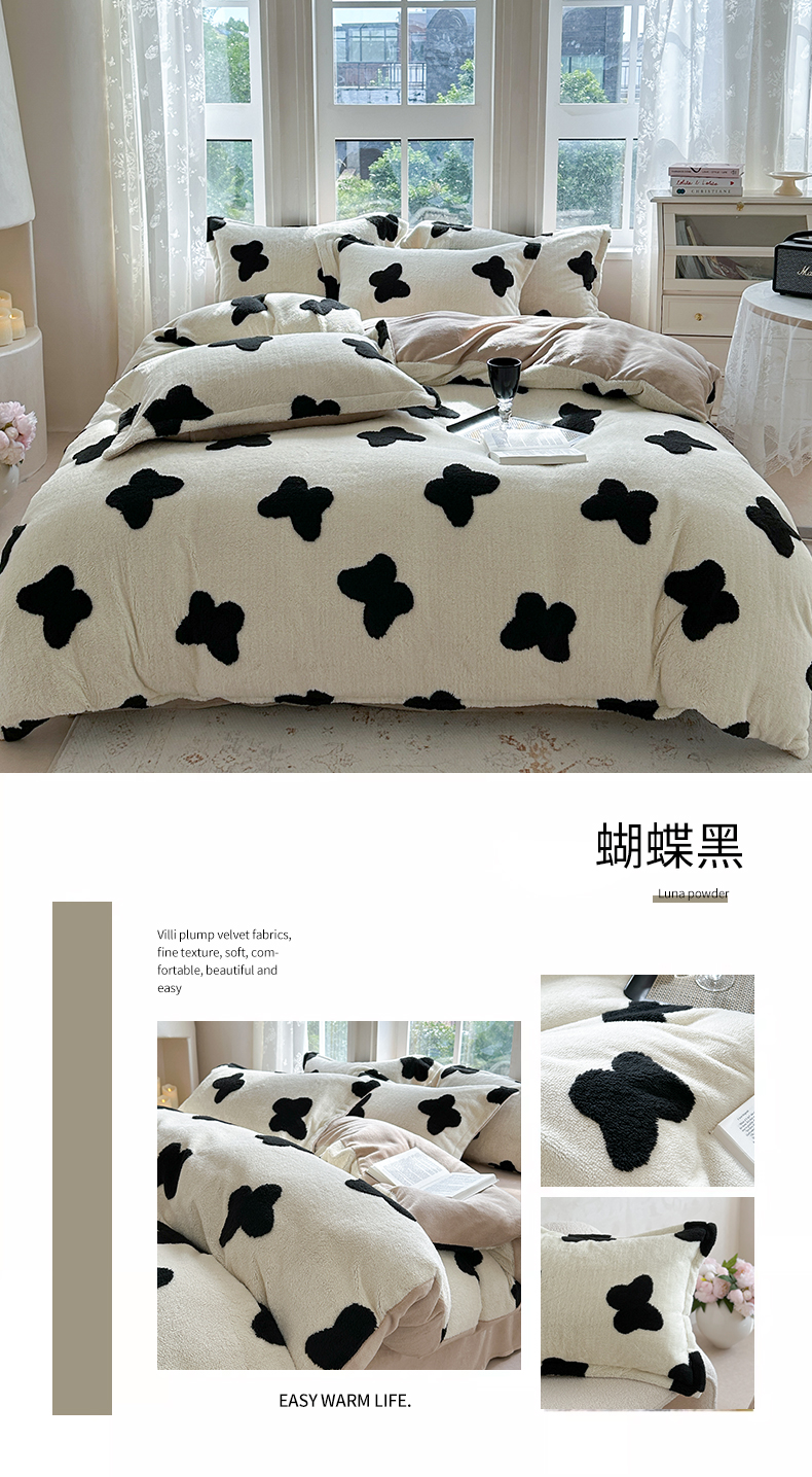 商品名称:萝莉家纺 2024新款加厚舒舒绒提花舒棉绒牛奶绒系列四件套 蝴蝶黑