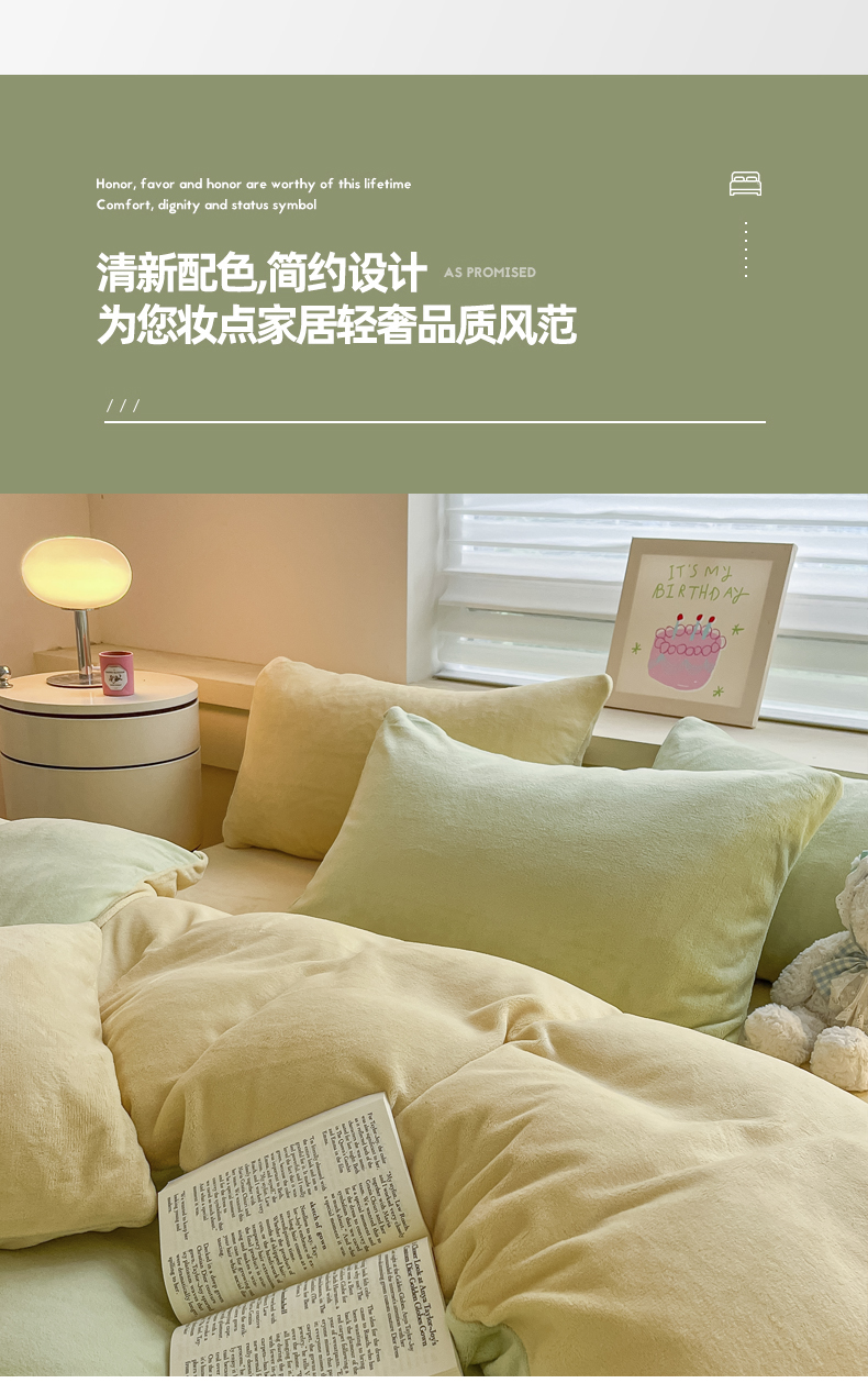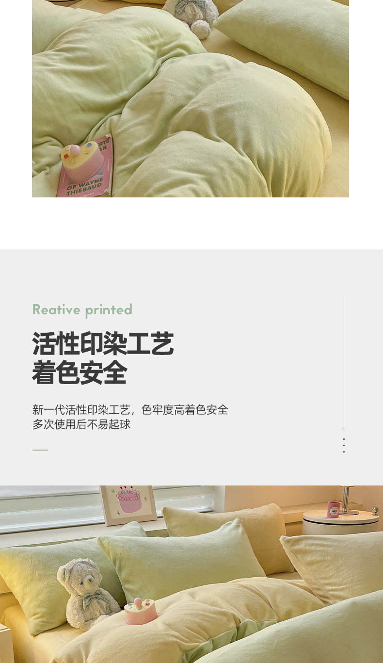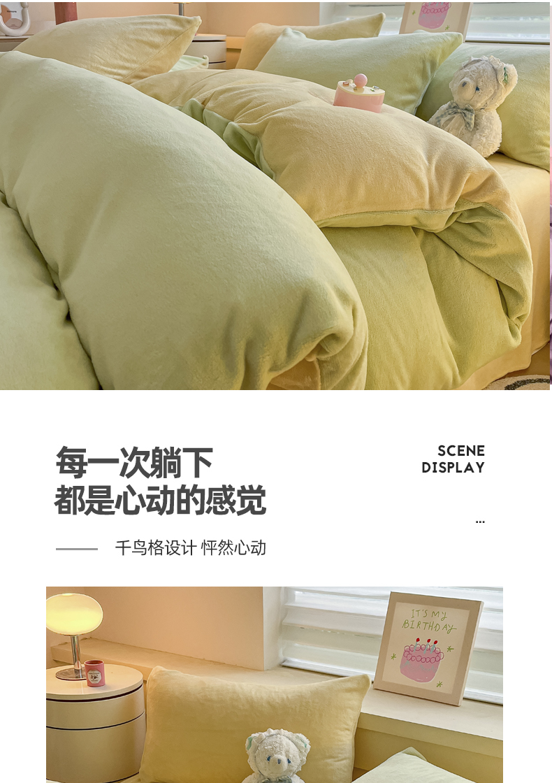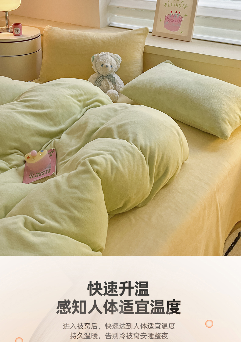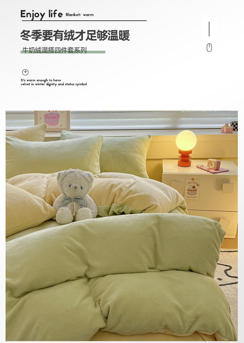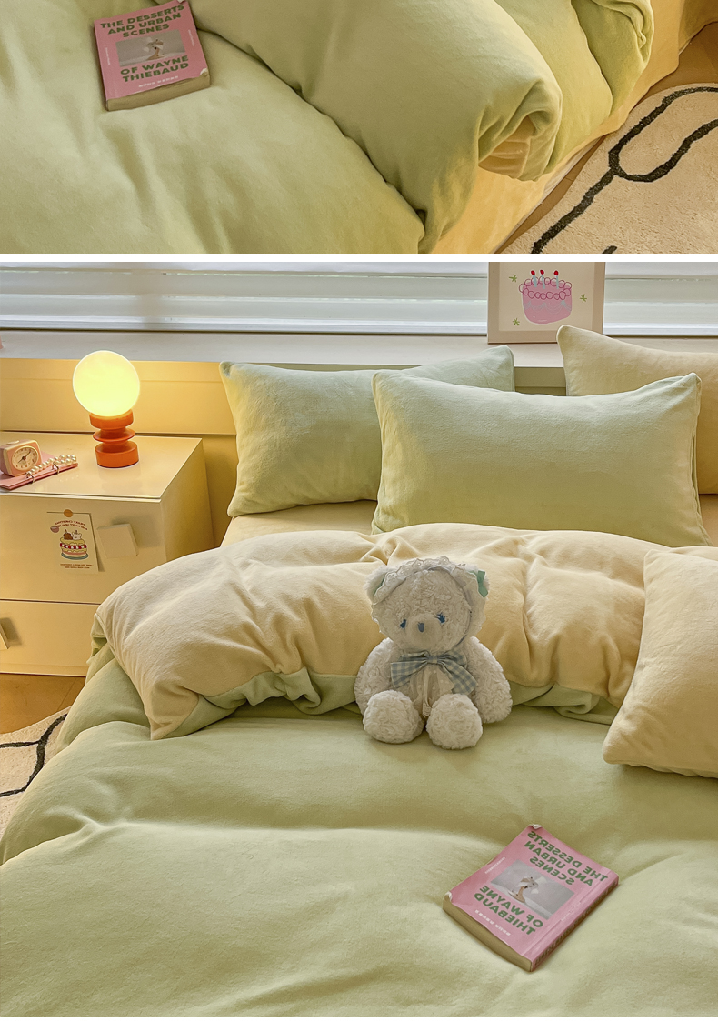 当前位置: 91家纺网 > 商品网购 > 床品套件 > 四件套 > 牛奶绒四件套 > 三朵家纺 2024新款加厚保暖牛奶绒混搭系列四件套 嫩绿+奶黄