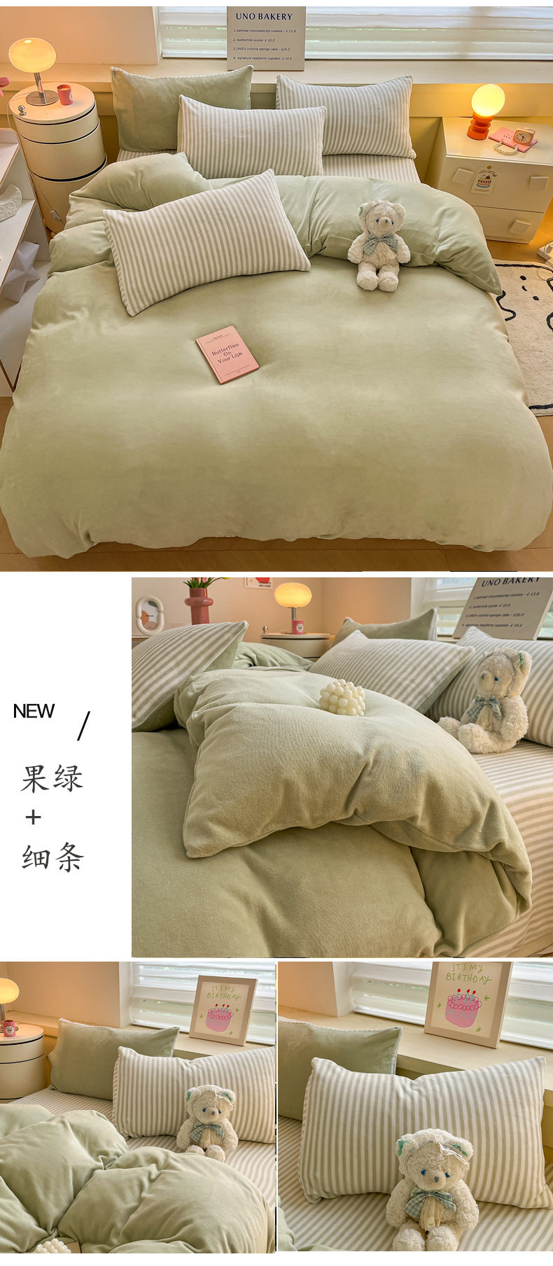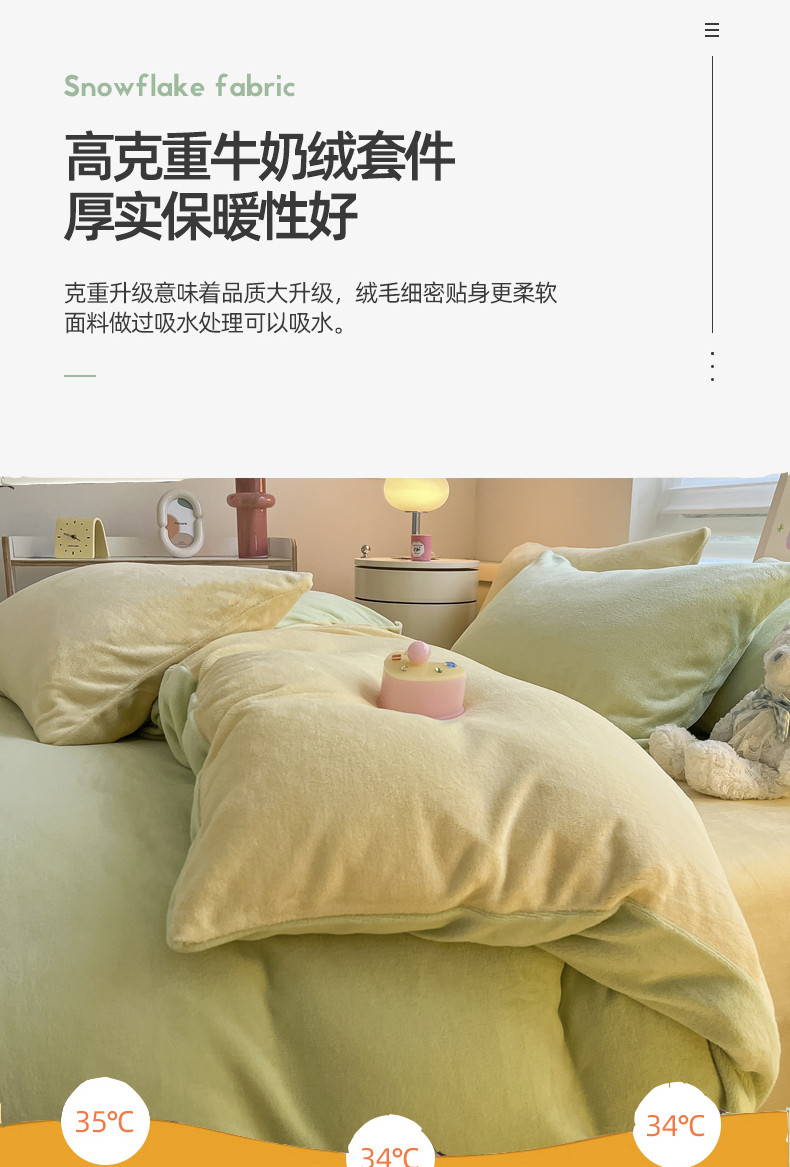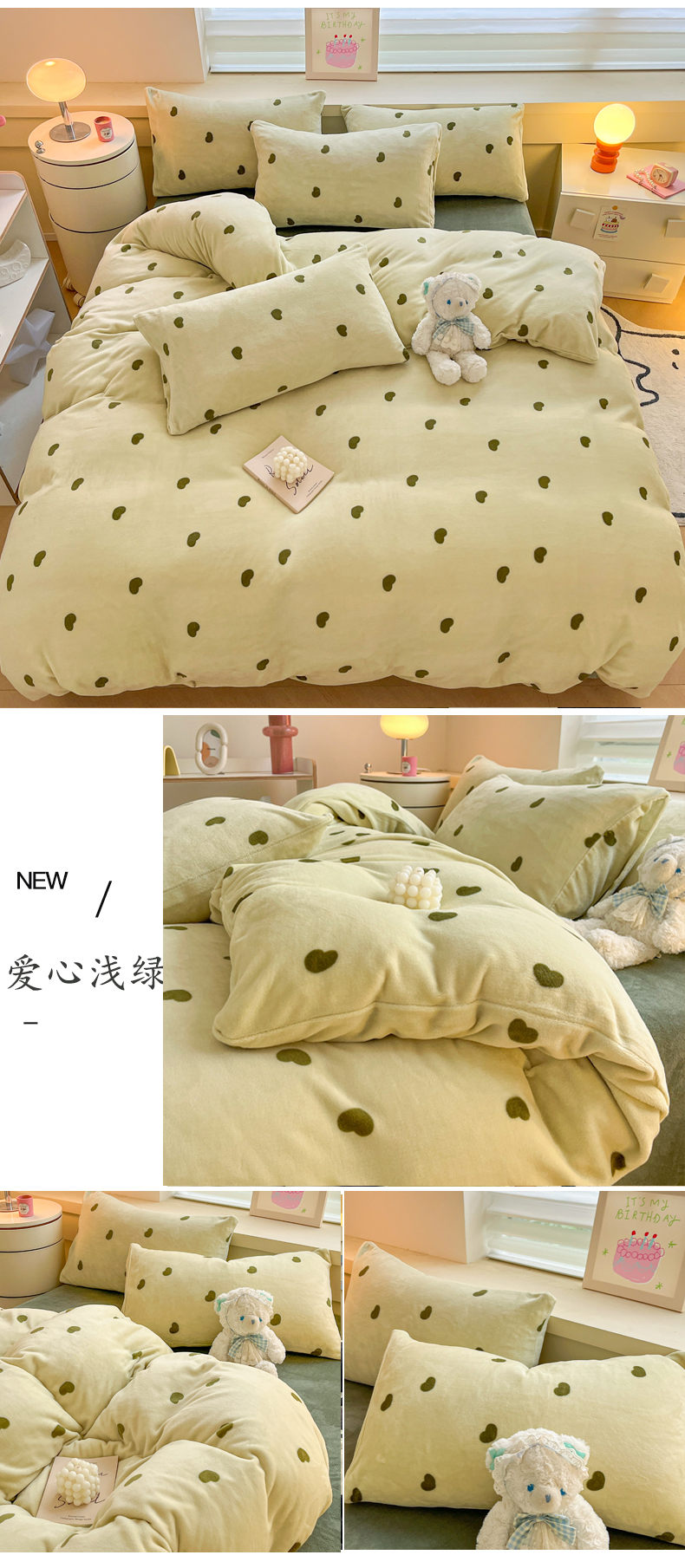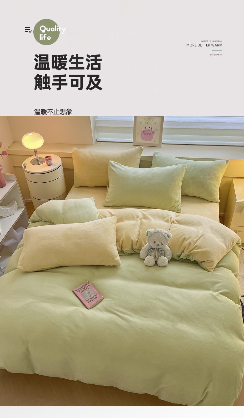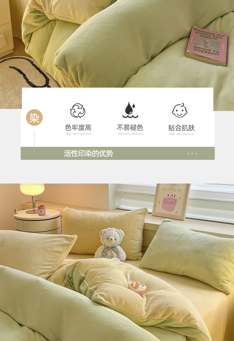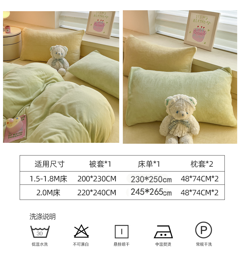 当前位置: 91家纺网 > 商品网购 > 床品套件 > 四件套 > 牛奶绒四件套 > 三朵家纺 2024新款加厚保暖牛奶绒混搭系列四件套 嫩绿+奶黄
