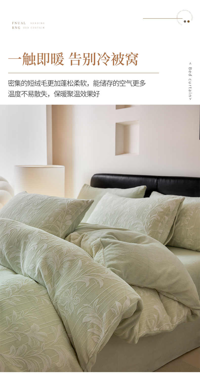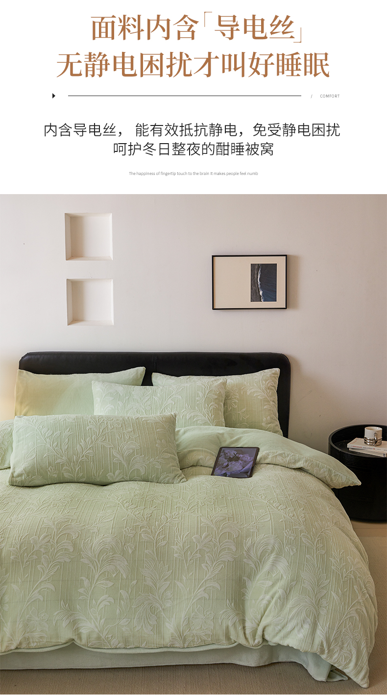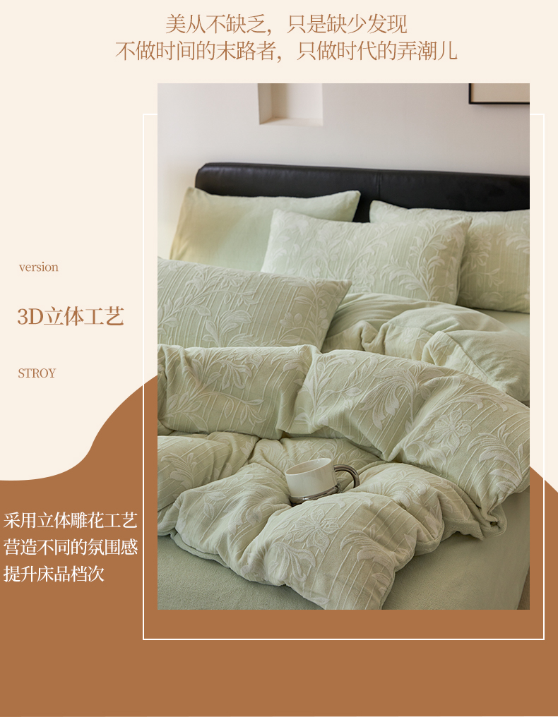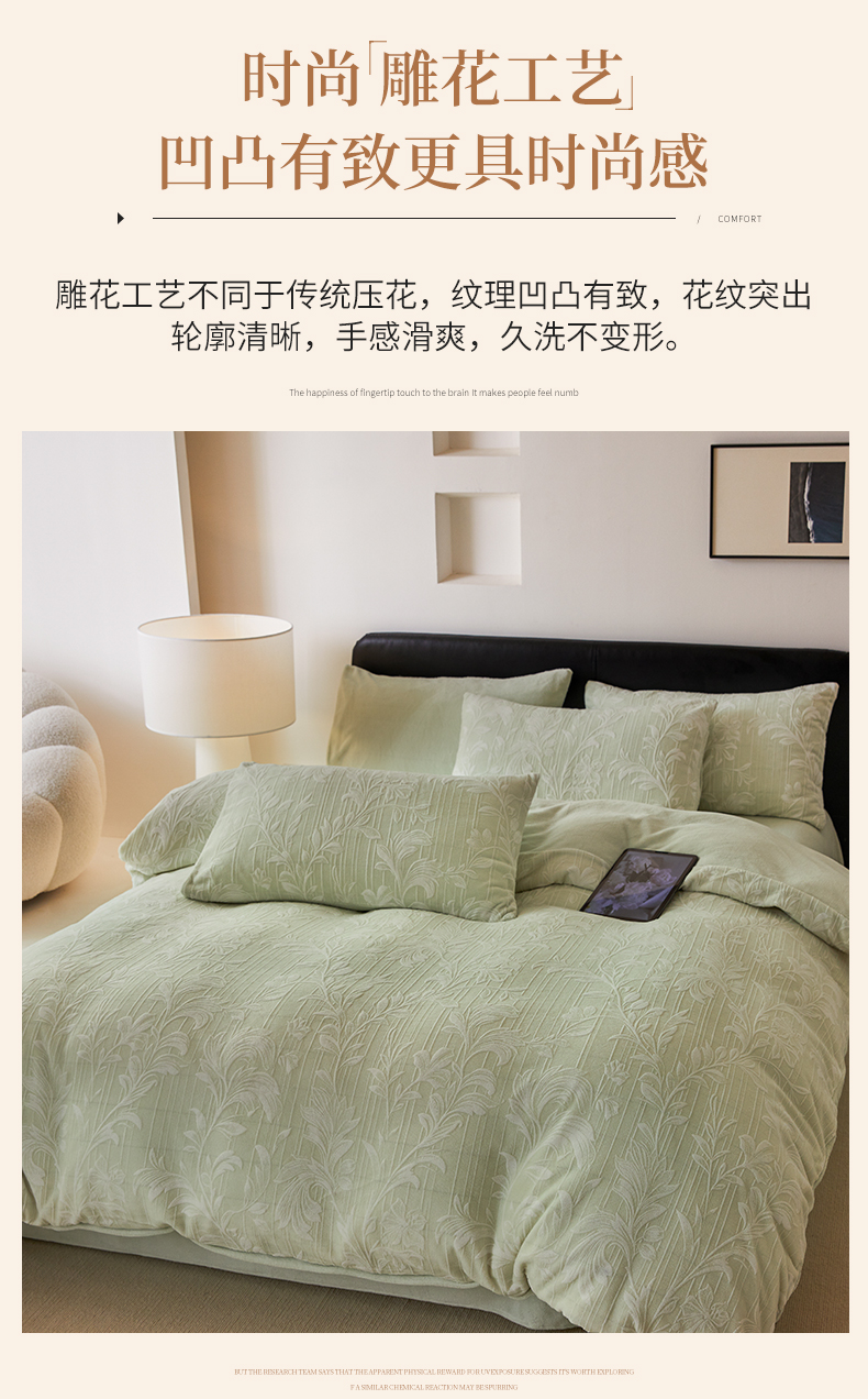 商品名称:优彩 2025新款雕花牛奶绒四件套烂花牛奶绒四件套 若叶-浅荷绿