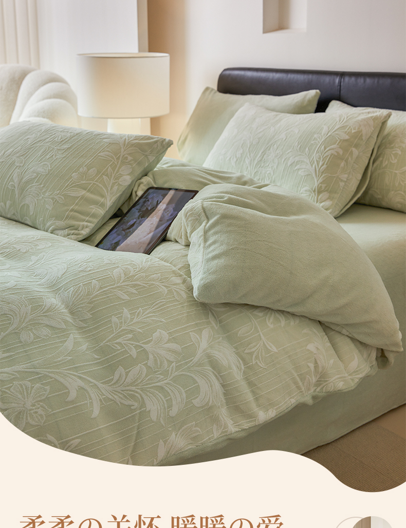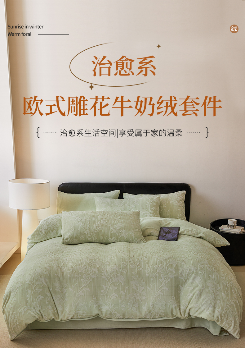优彩 2025新款雕花牛奶绒四件套烂花牛奶绒四件套 若叶-浅荷绿
