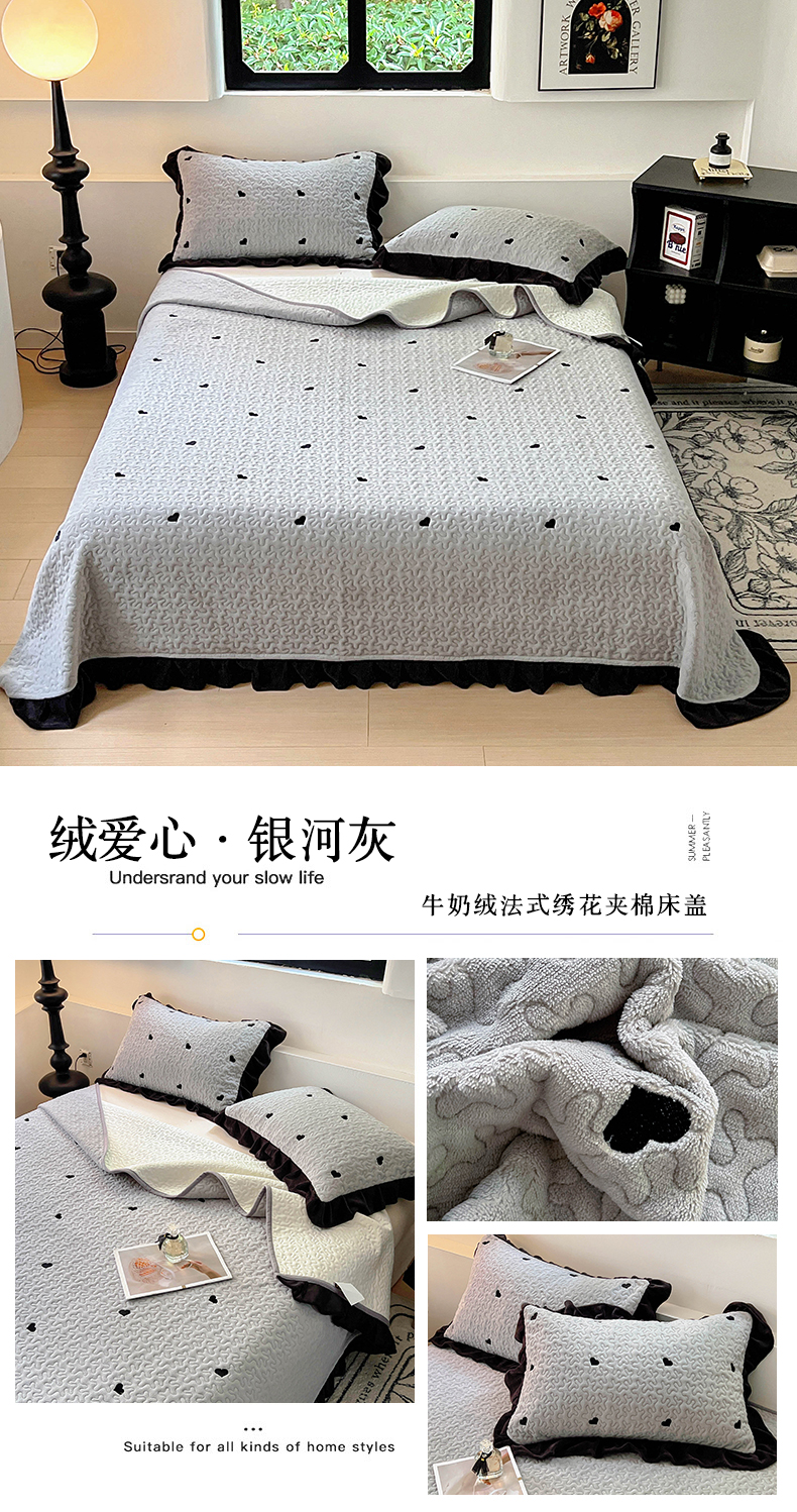 • 91家纺网 家纺一手货源 找家纺 美梦家纺 2024新款牛奶绒法式绣花夹棉床盖 绒爱心·银河灰