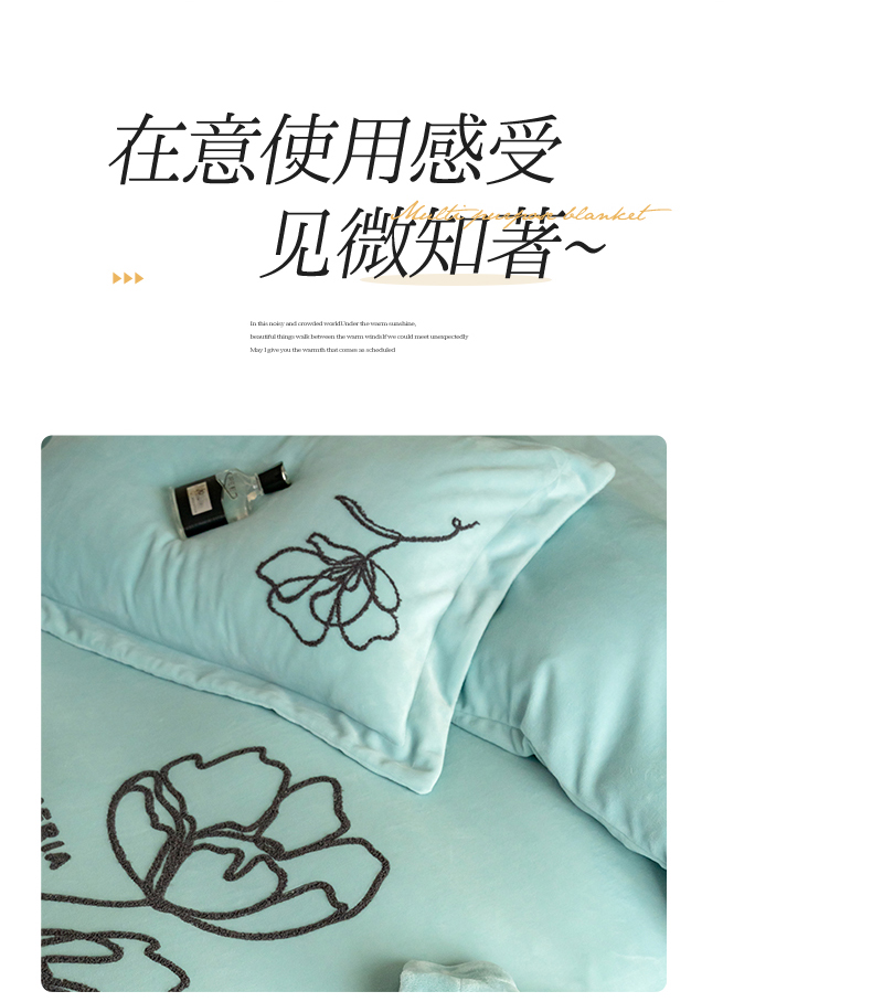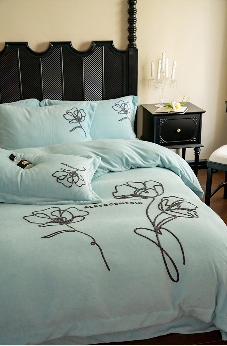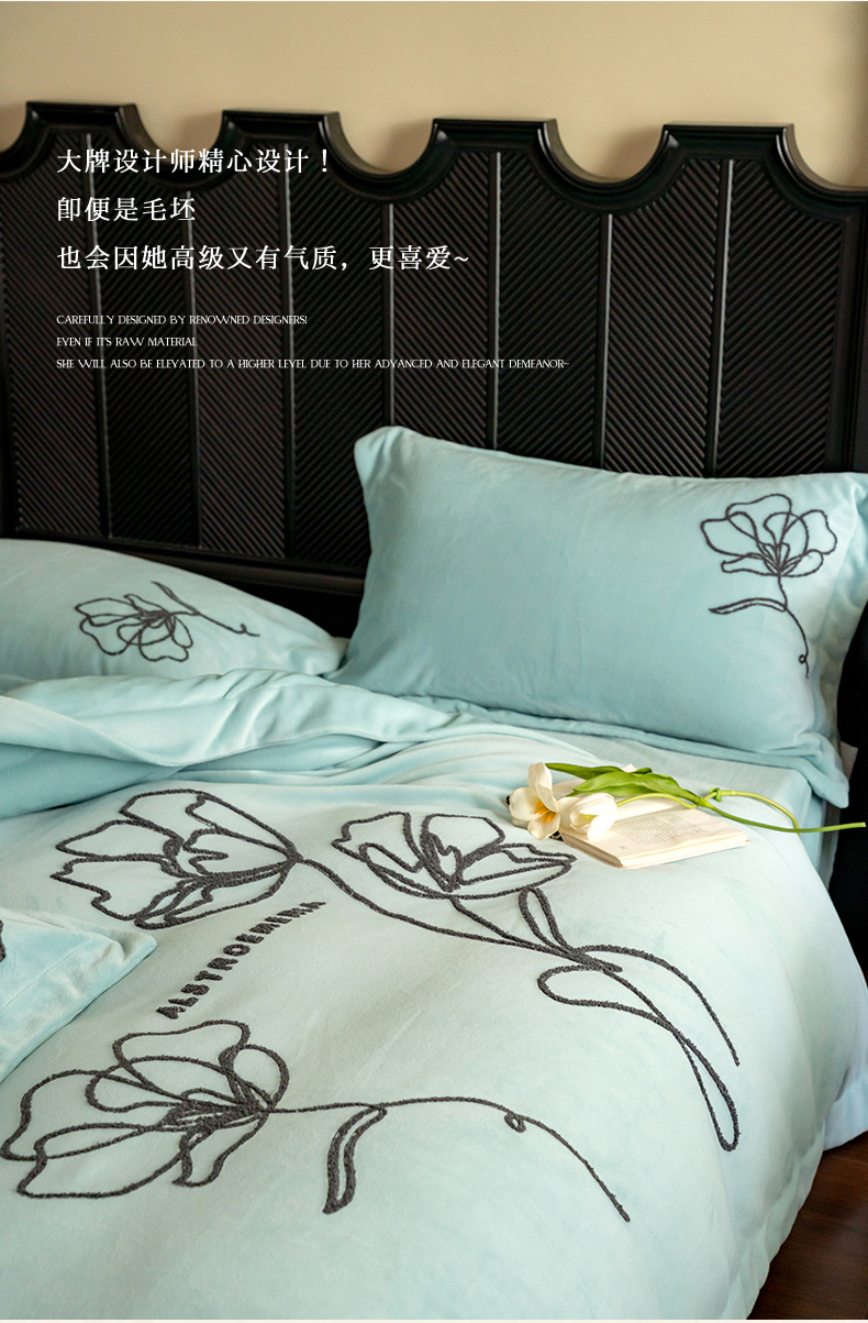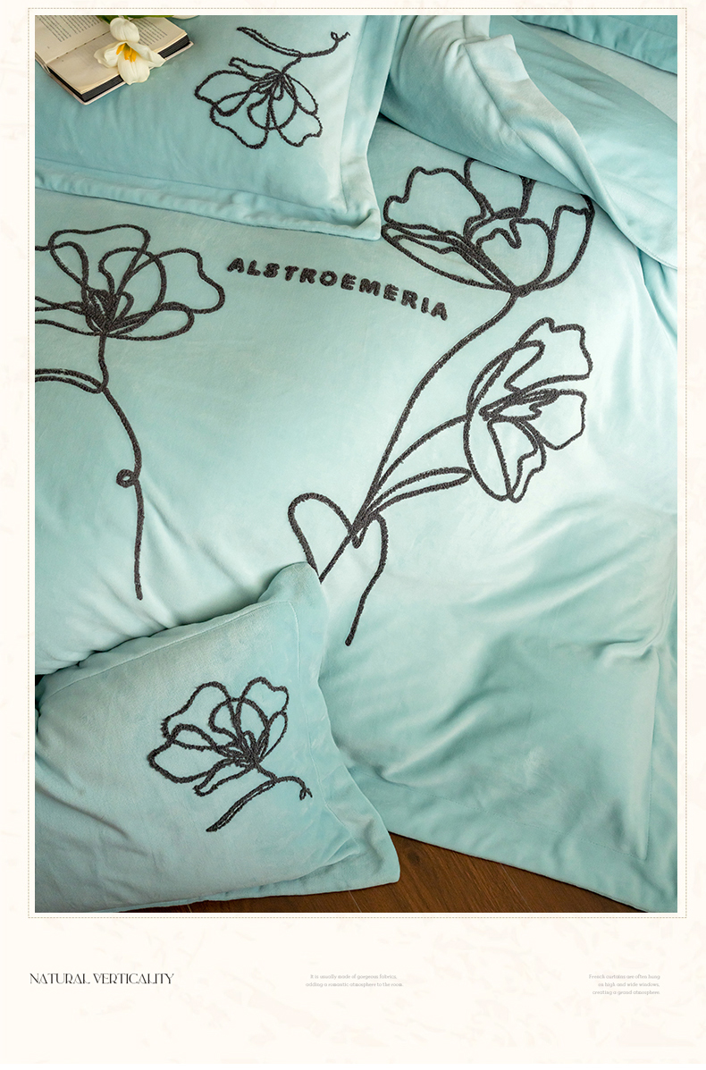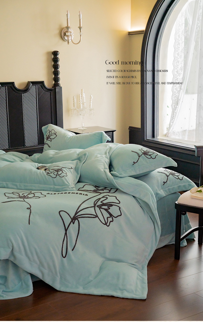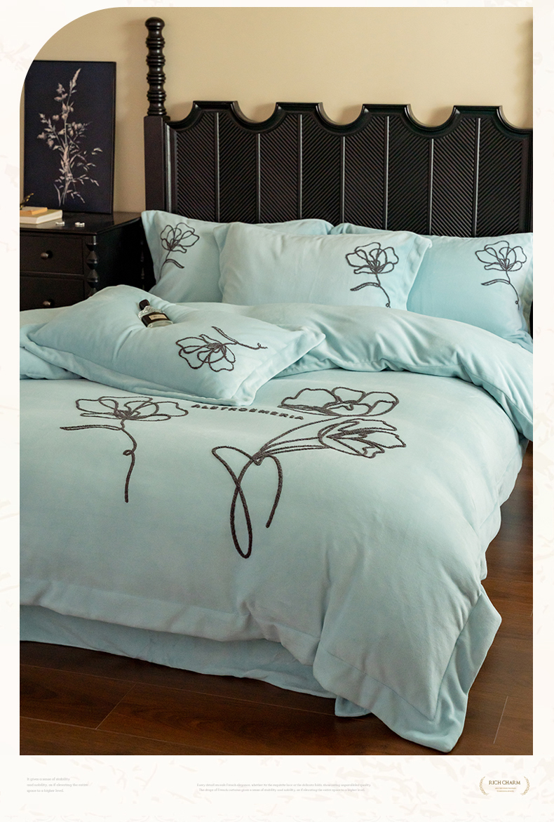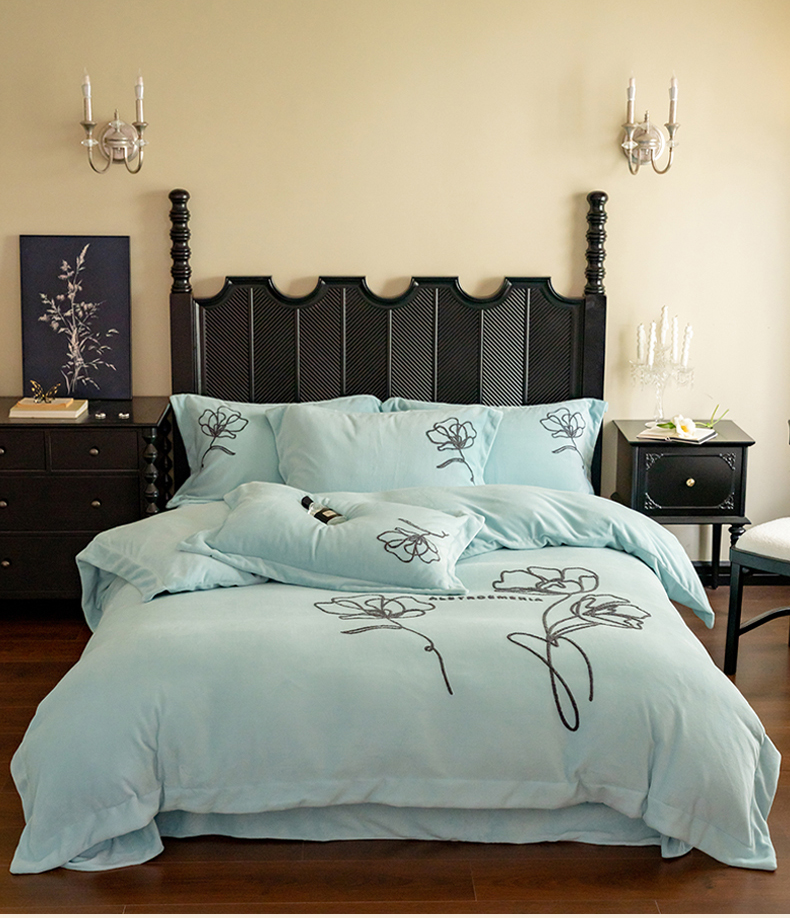 商品名称:名品优仓 2024新款牛奶绒毛巾绣花四件套-摩西 摩西-星清晨蓝
