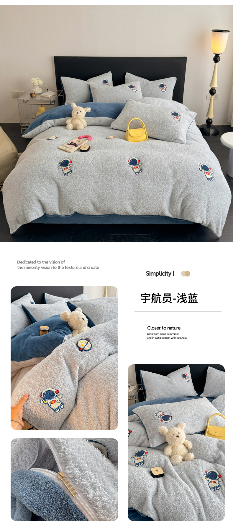 商品名称:沐辰 2024新款小元素绣花米粒绒牛奶绒毛毯 宇航员-浅蓝