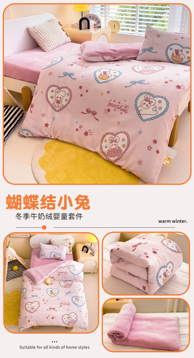 当前位置: 91家纺网 > 商品网购 > 床品套件 > 多件套 > 多件套 > 鱼宝 2024新款小版牛奶绒婴童套件蝴蝶结小兔
