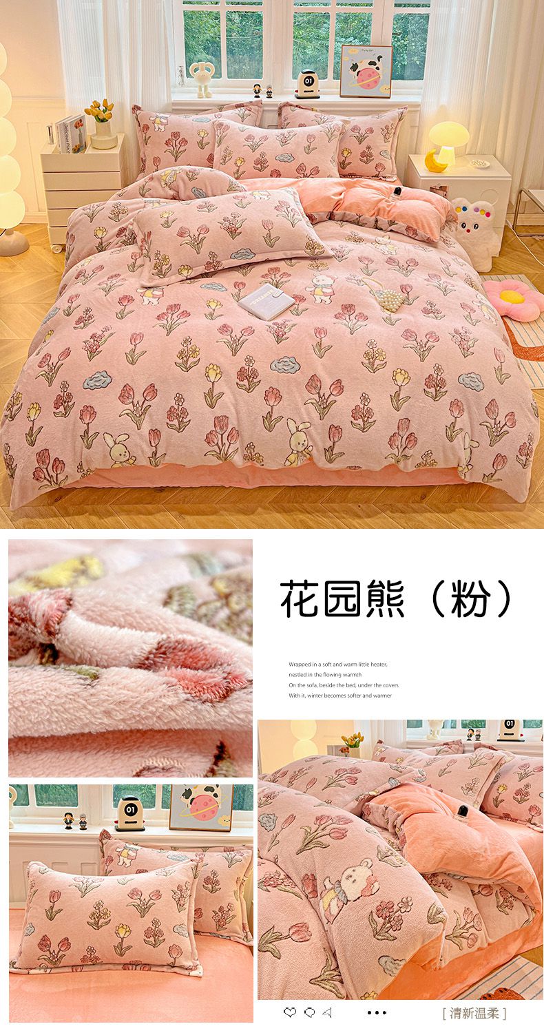 当前位置: 91家纺网 > 商品网购 > 床品套件 > 四件套 > 牛奶绒四件套 > 韩巢家纺 2024新款加厚雪花绒牛奶绒珊瑚绒四件套-新品(提供卖家秀) 花园熊(粉)