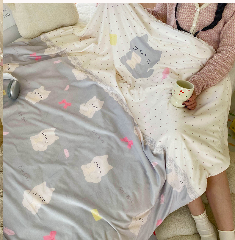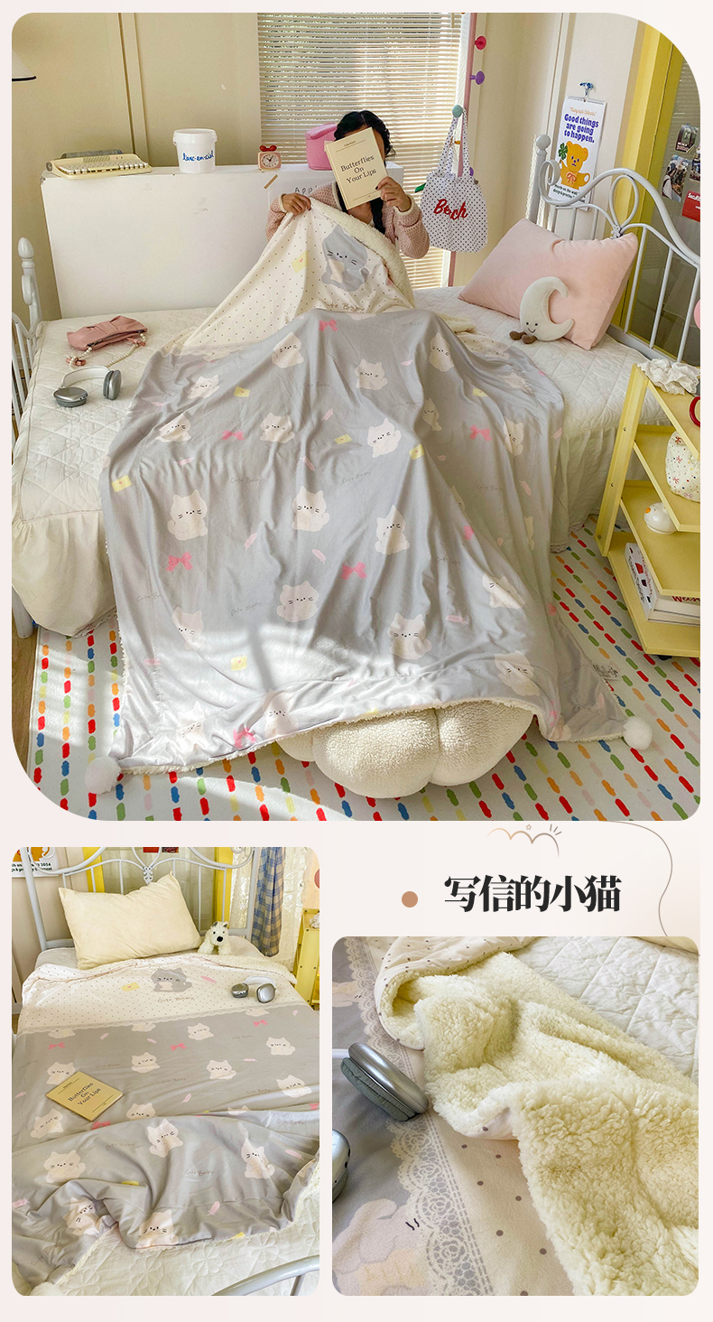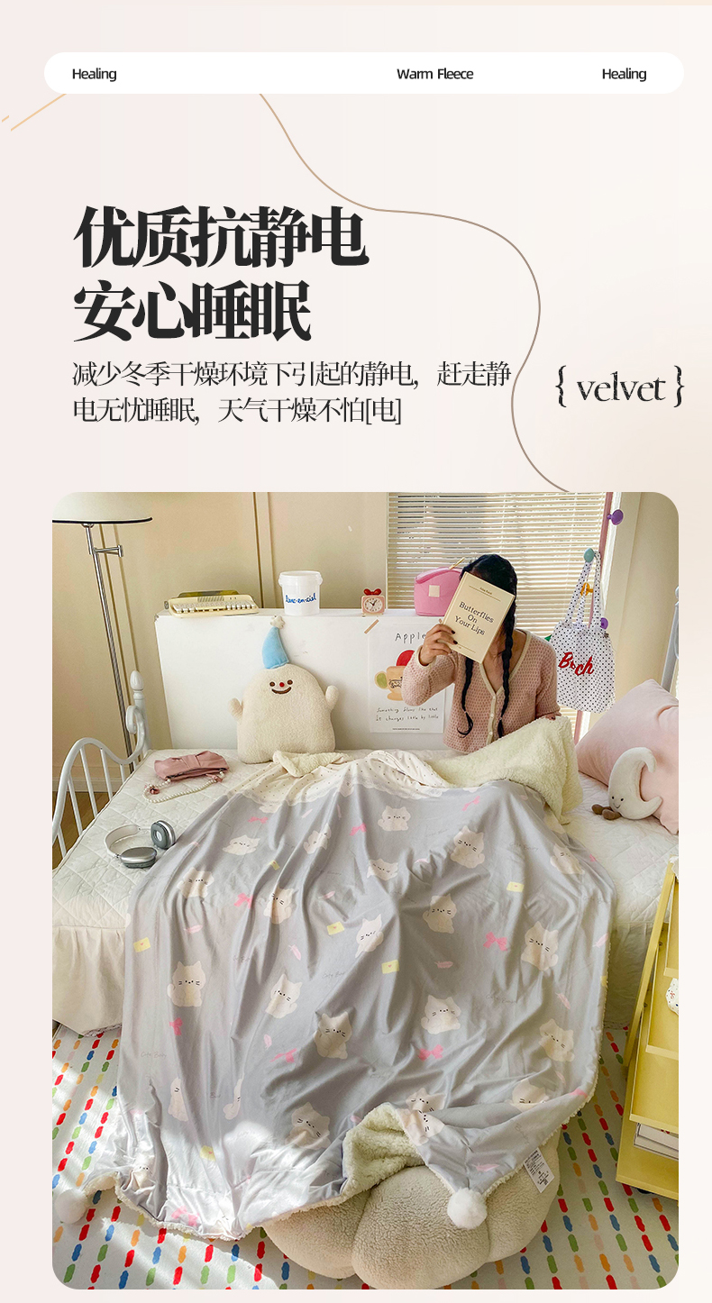 商品名称:潮邦创意家居 2025新款印花大版羊羔绒球-BIBY KELY系列羊绒绒毯 写信的小猫