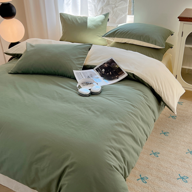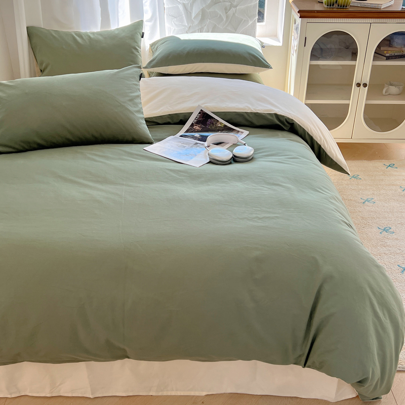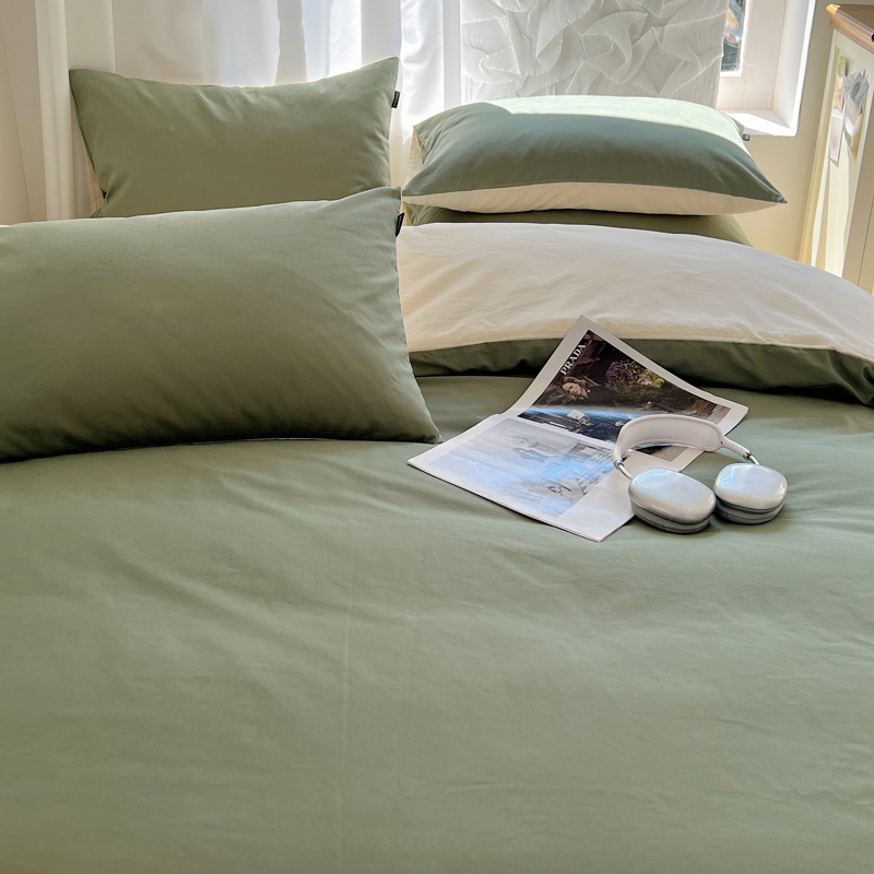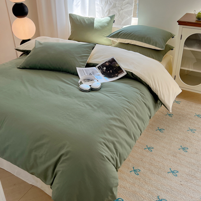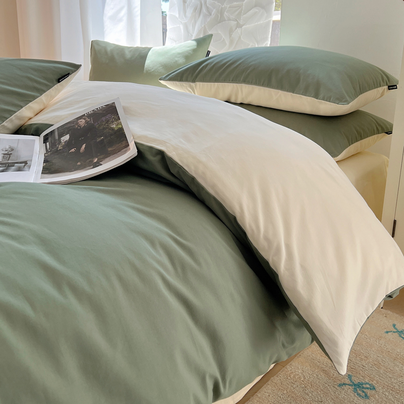 丽卡家纺(原丽卡家纺) 2024新款A类艾阳棉双拼纯色四件套 松霜绿+象牙白