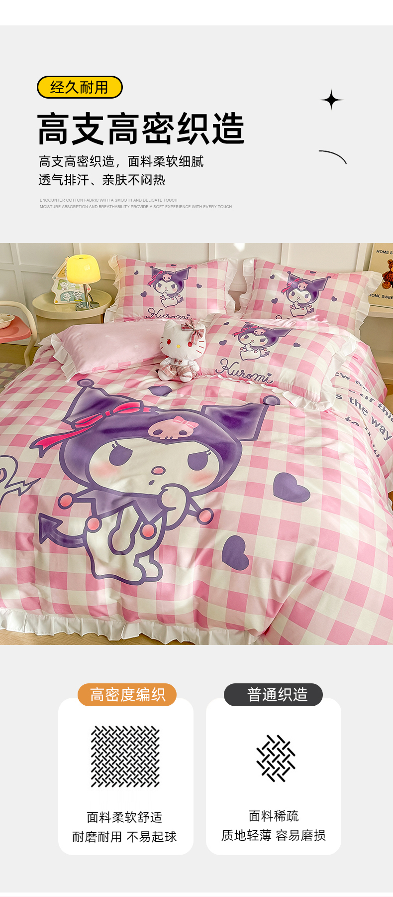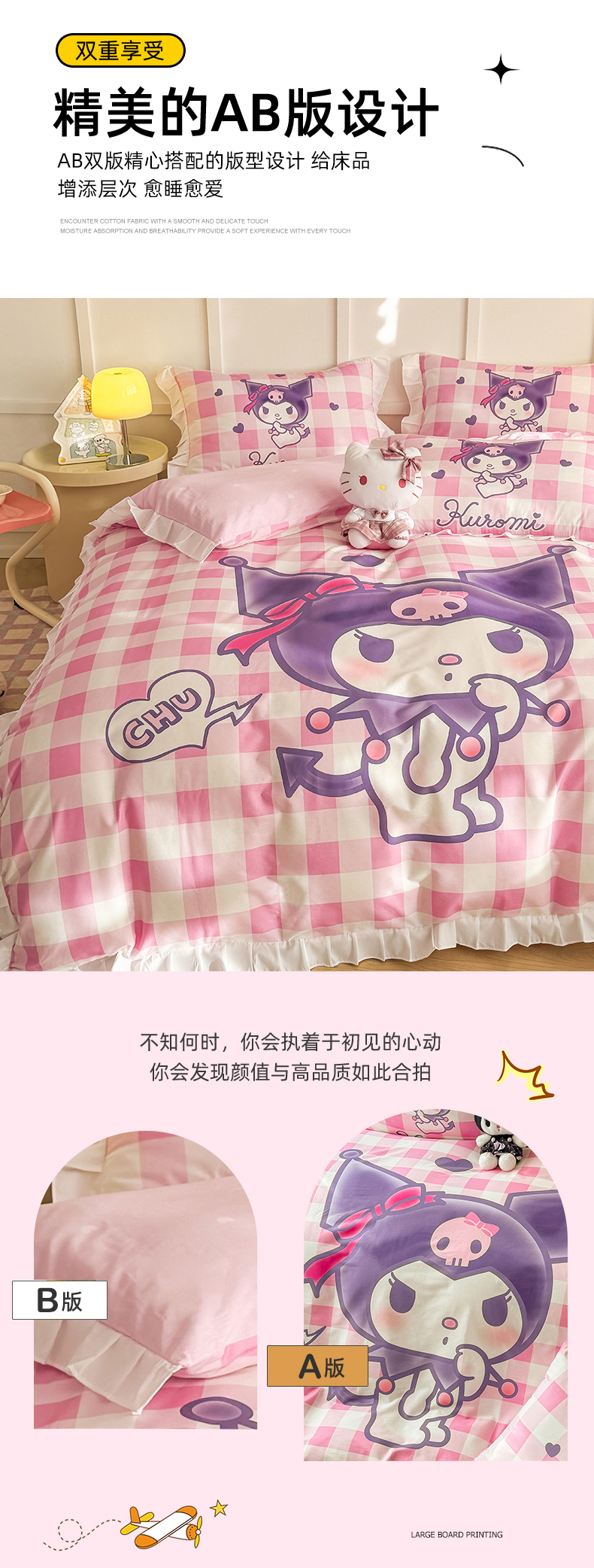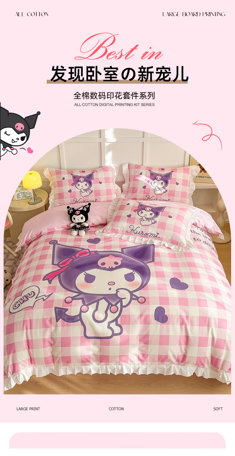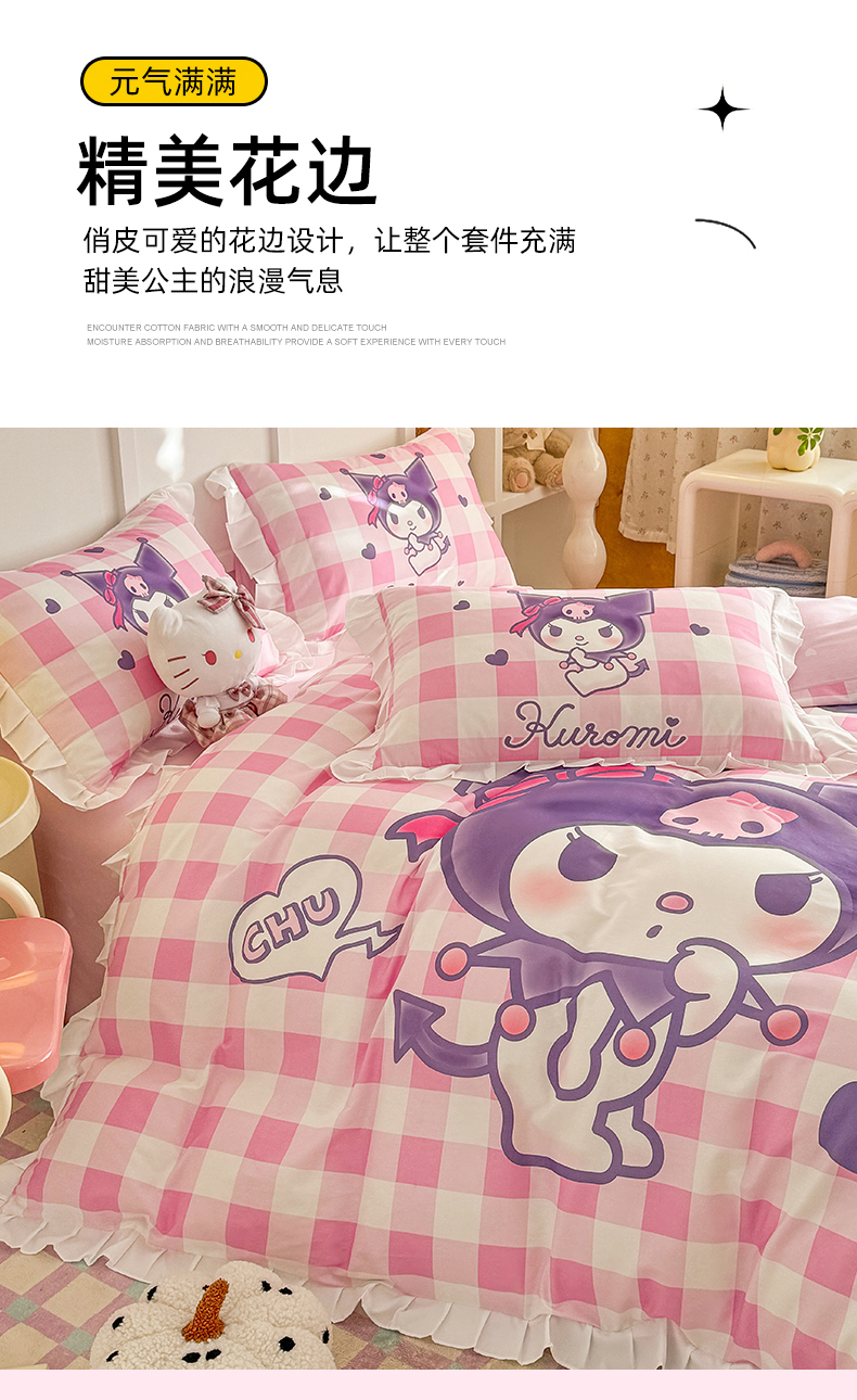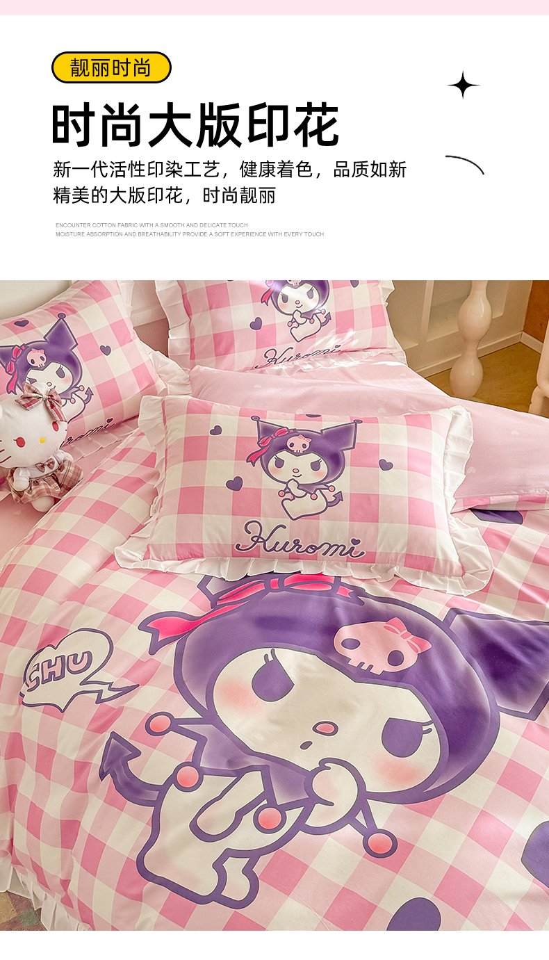 当前位置: 91家纺网 > 商品网购 > 床品套件 > 四件套 > 全棉普通四件套 > 玉元坊 2025年新款三丽鸥系列数码印花纯棉全棉床裙三件套四件套-花边款式 大版花边-格子库洛米