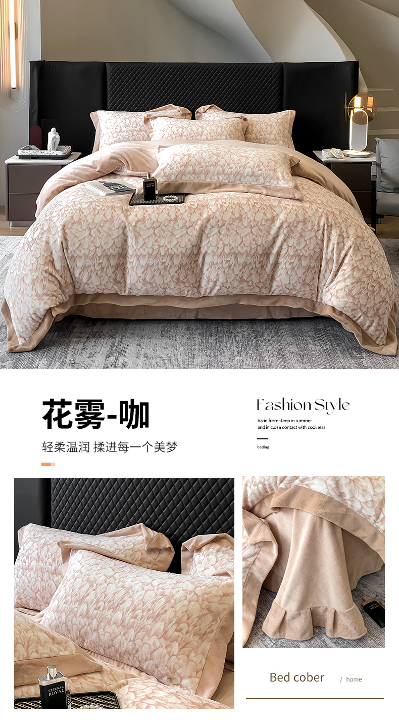2025高克重加厚牛奶绒四件套印花四件套-轻奢系列 花雾-咖