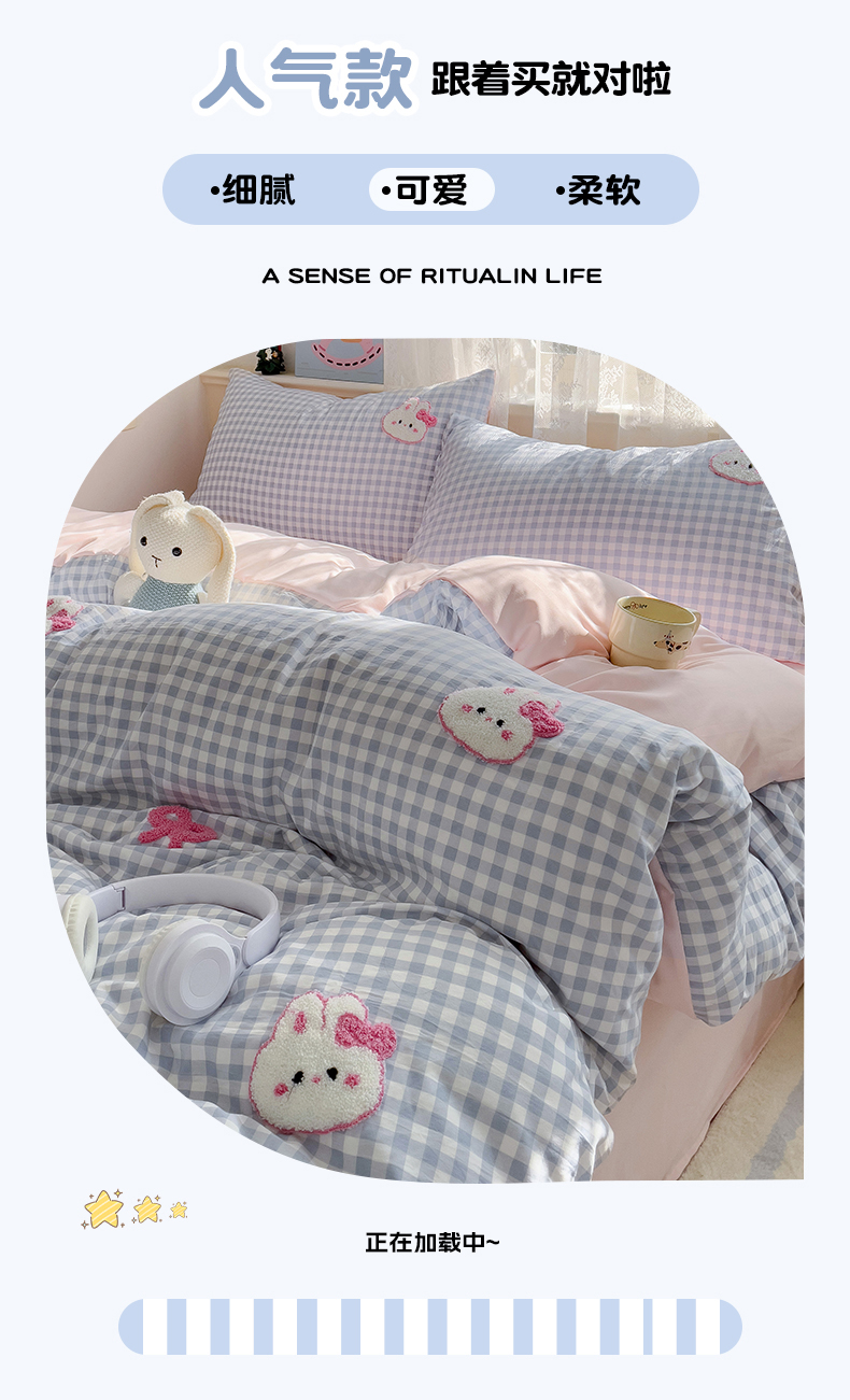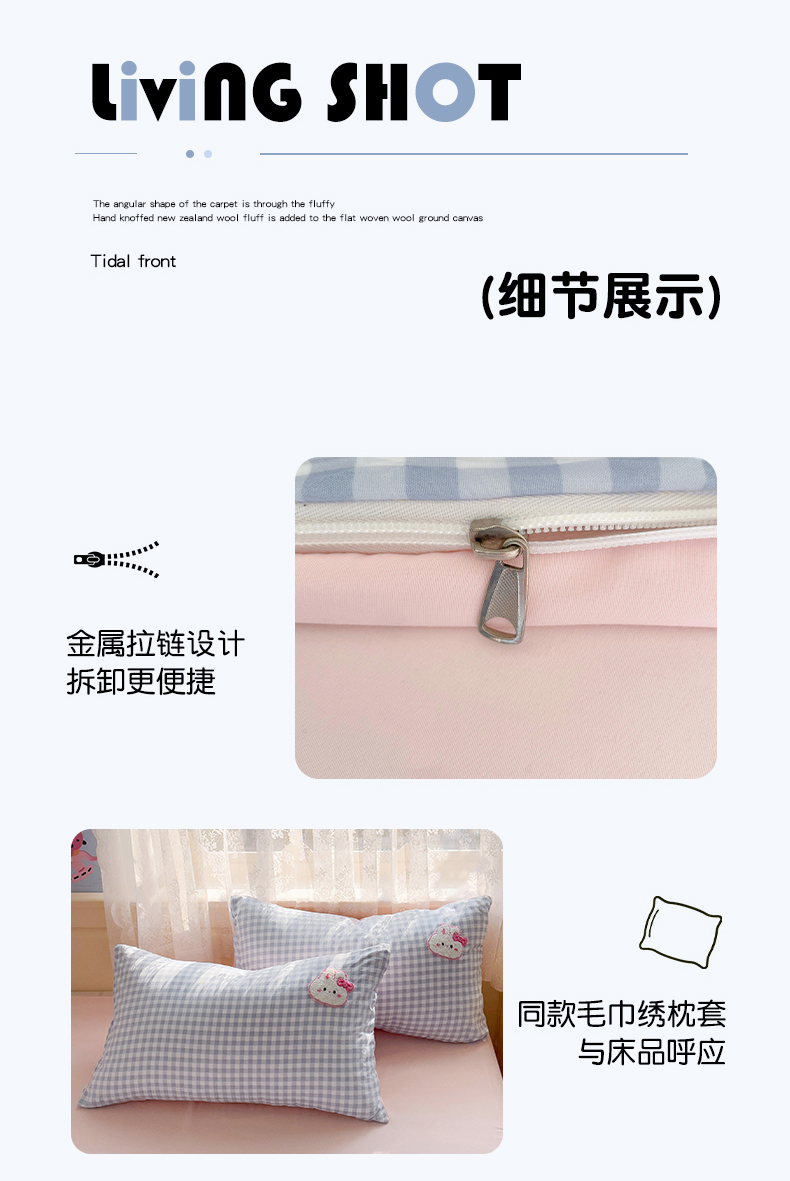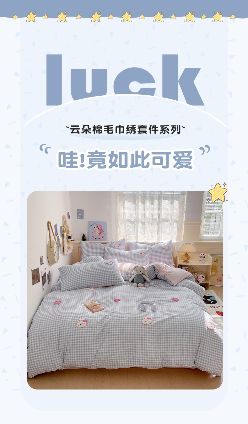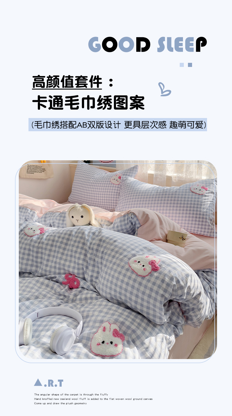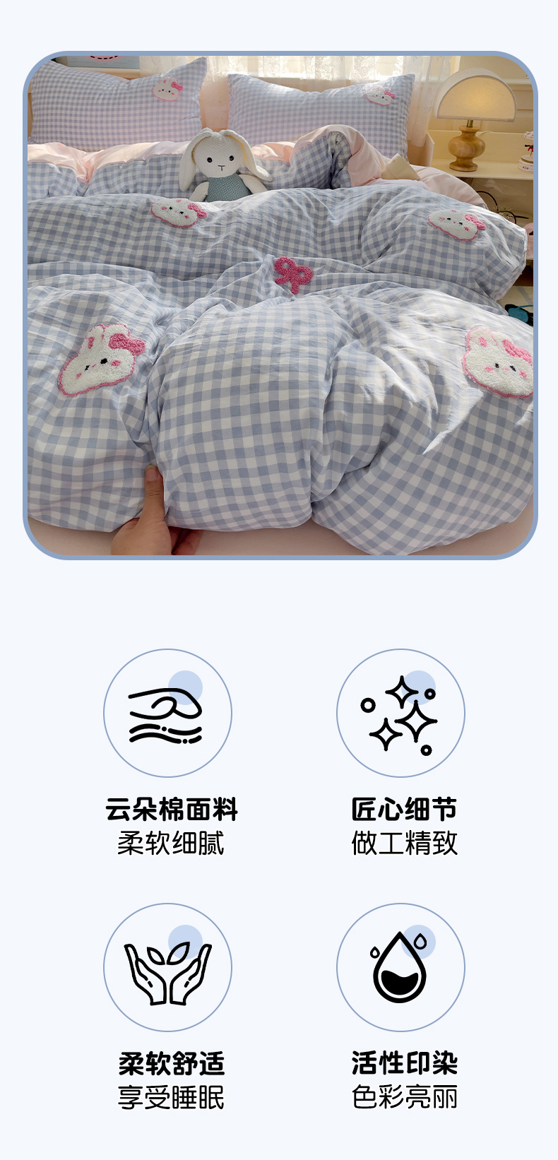 当前位置: 91家纺网 > 商品网购 > 床品套件 > 四件套 > 其它四件套 > 梦之岛 2025云朵棉ins格子小兔可爱毛巾绣四件套 格子小兔-蓝
