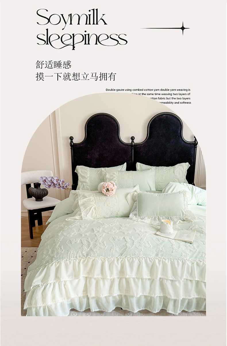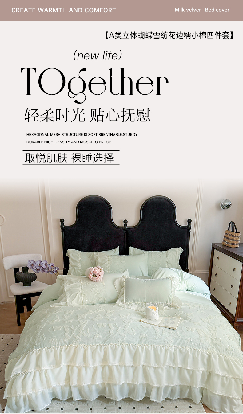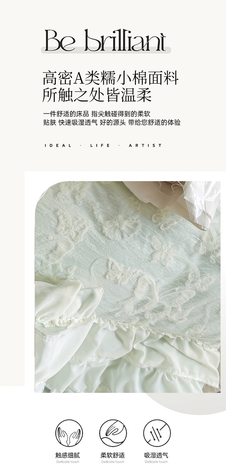 商品名称:吾欢心2025新款蝴蝶梦立体定制蝴蝶加三层雪纺花边系列四件套 蝴蝶梦绿