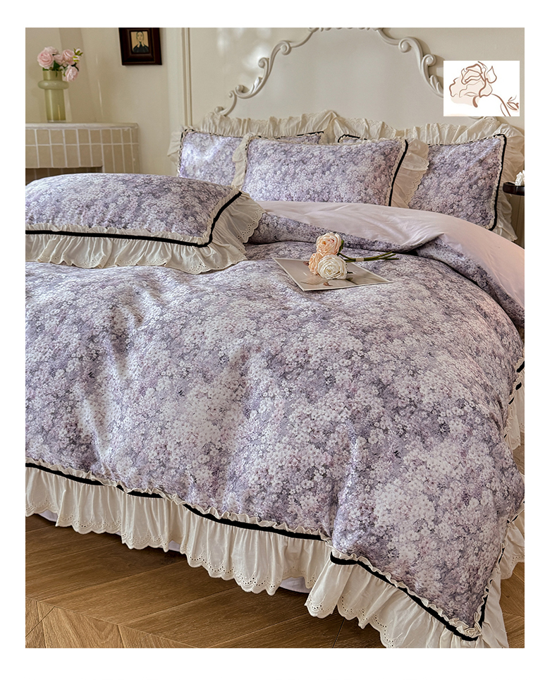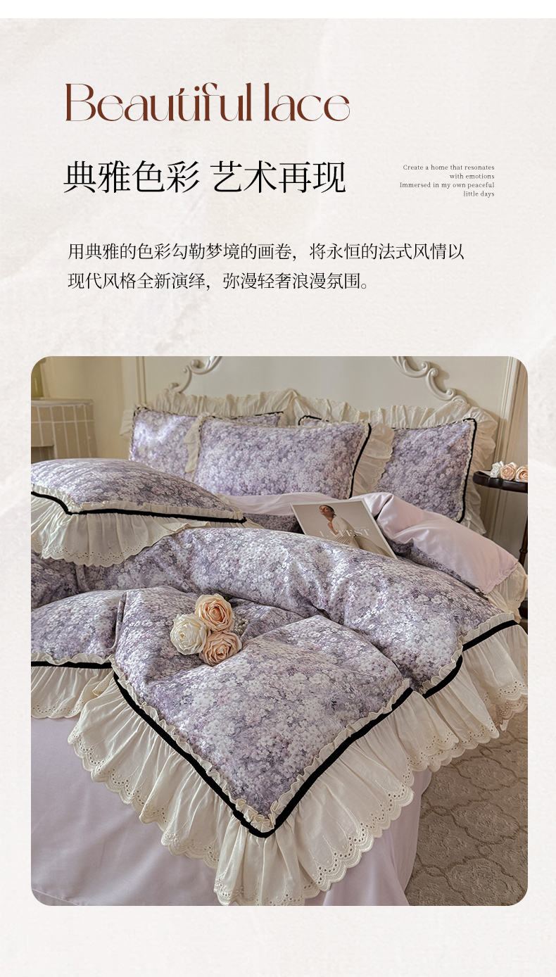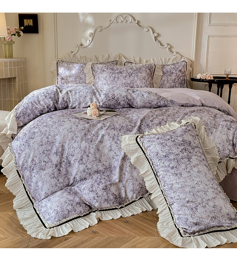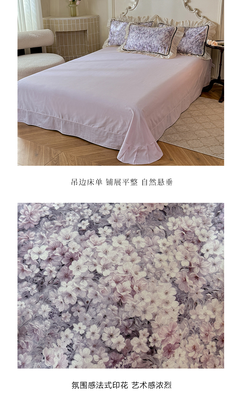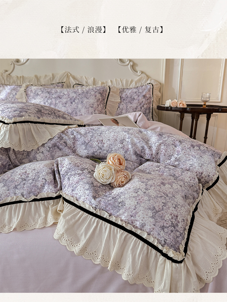 商品名称:巧玲珑 2025新款法式蕾丝印花60支进口长绒棉四件套 沐春风-紫