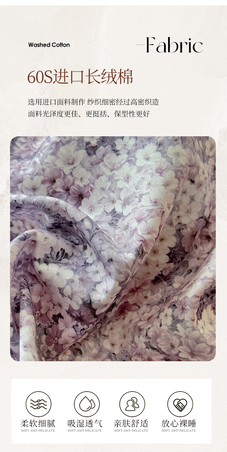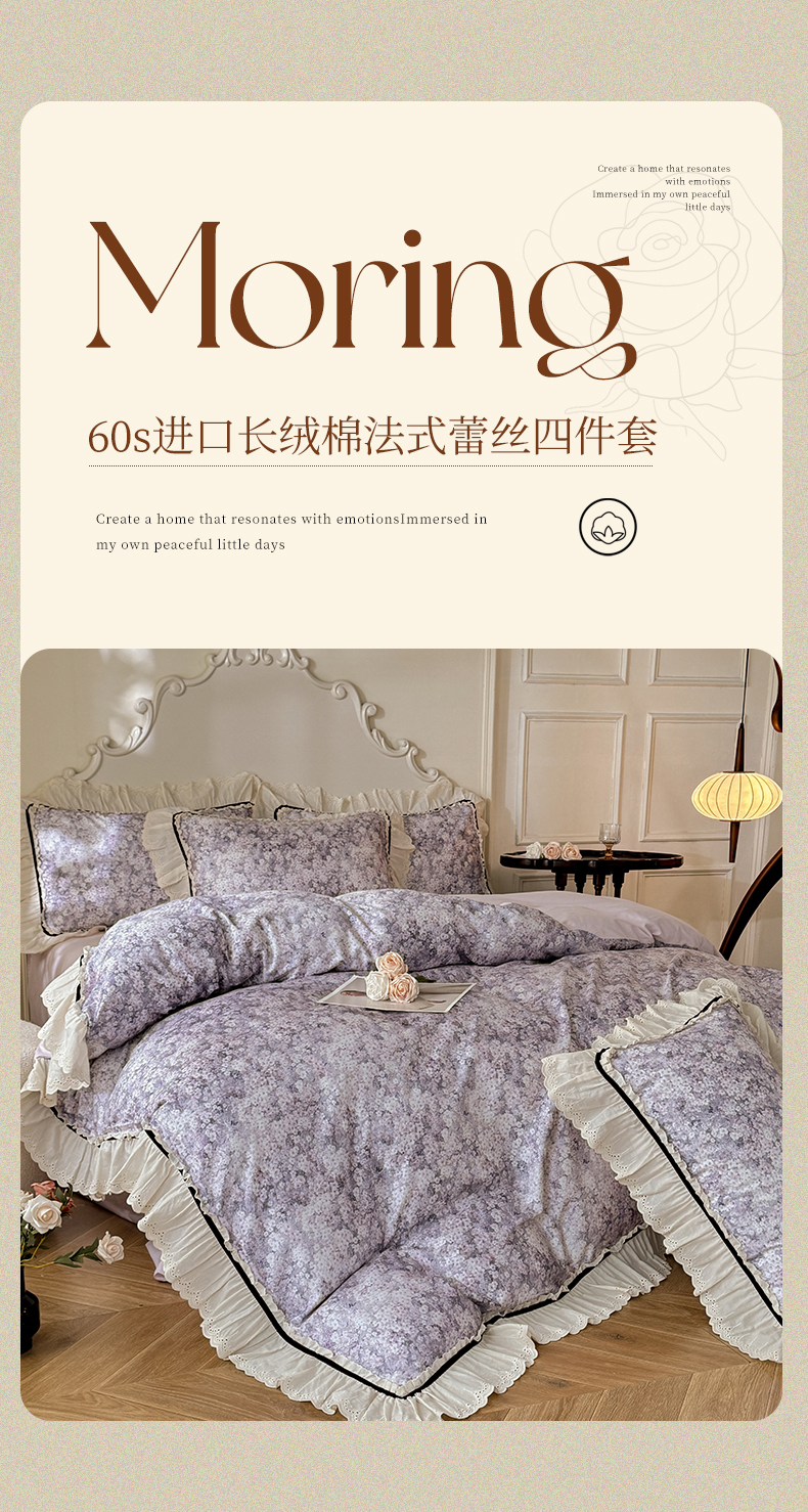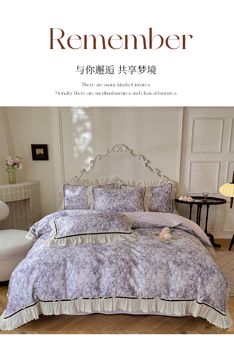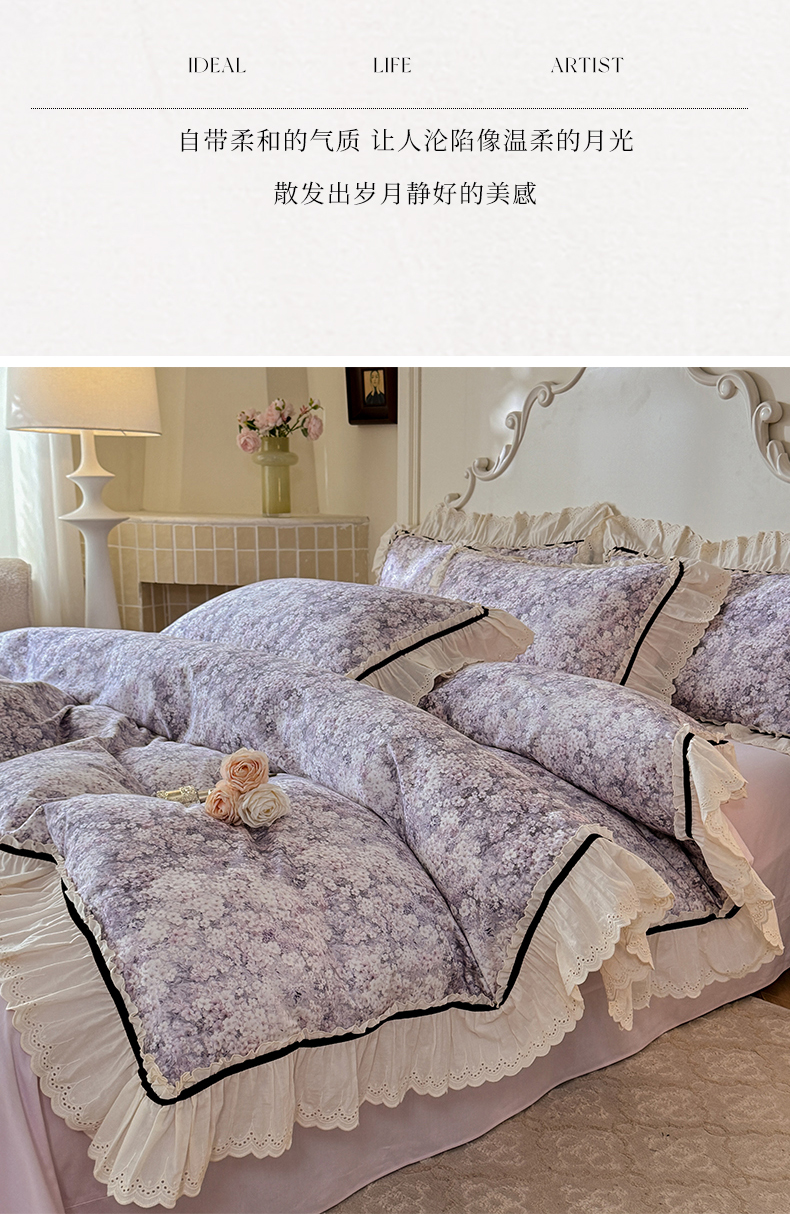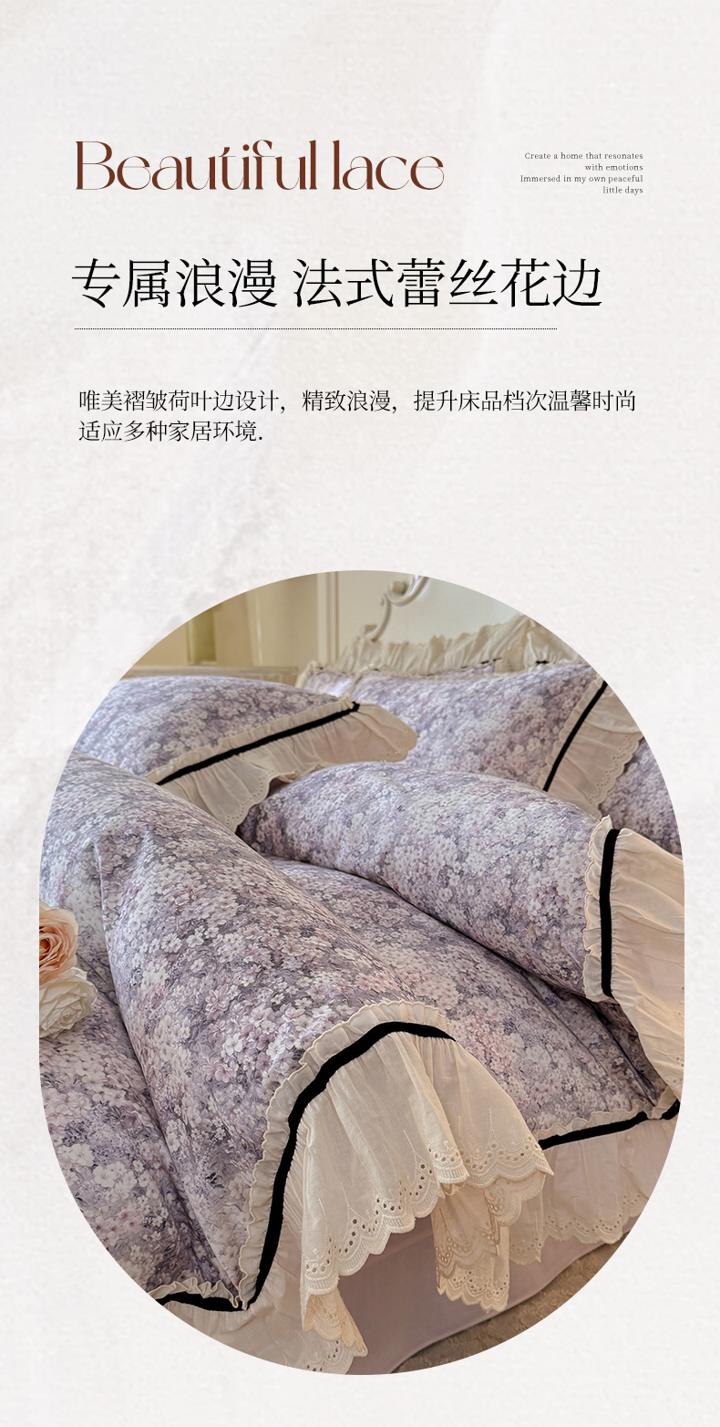 商品名称:巧玲珑 2025新款法式蕾丝印花60支进口长绒棉四件套 沐春风-紫