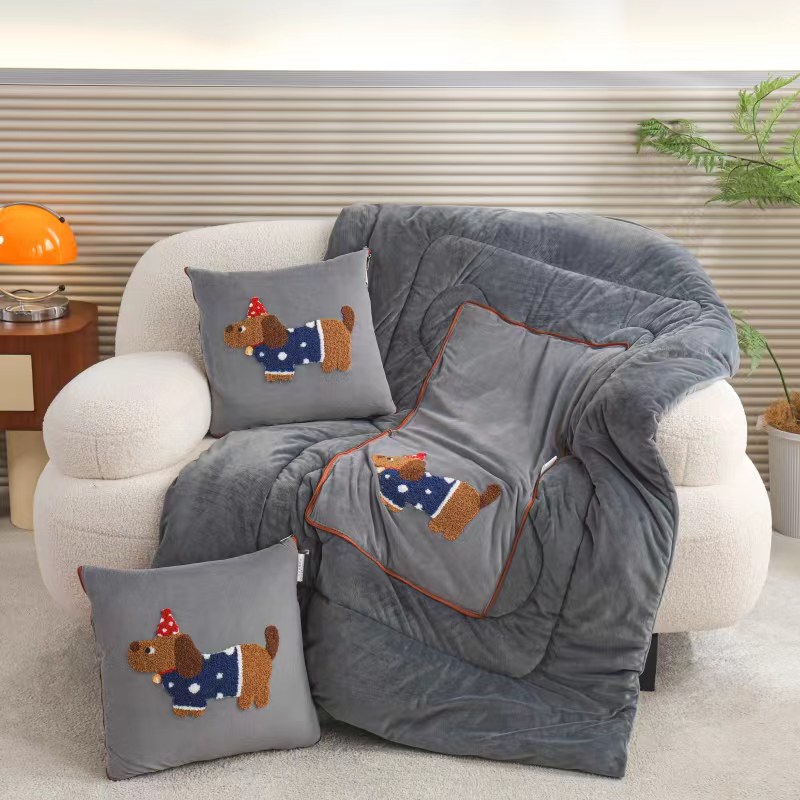 商品名称:枕芯真意 2025新款毛巾绣刺绣小狗系列多功能抱枕被--腊肠狗 腊肠狗-灰色