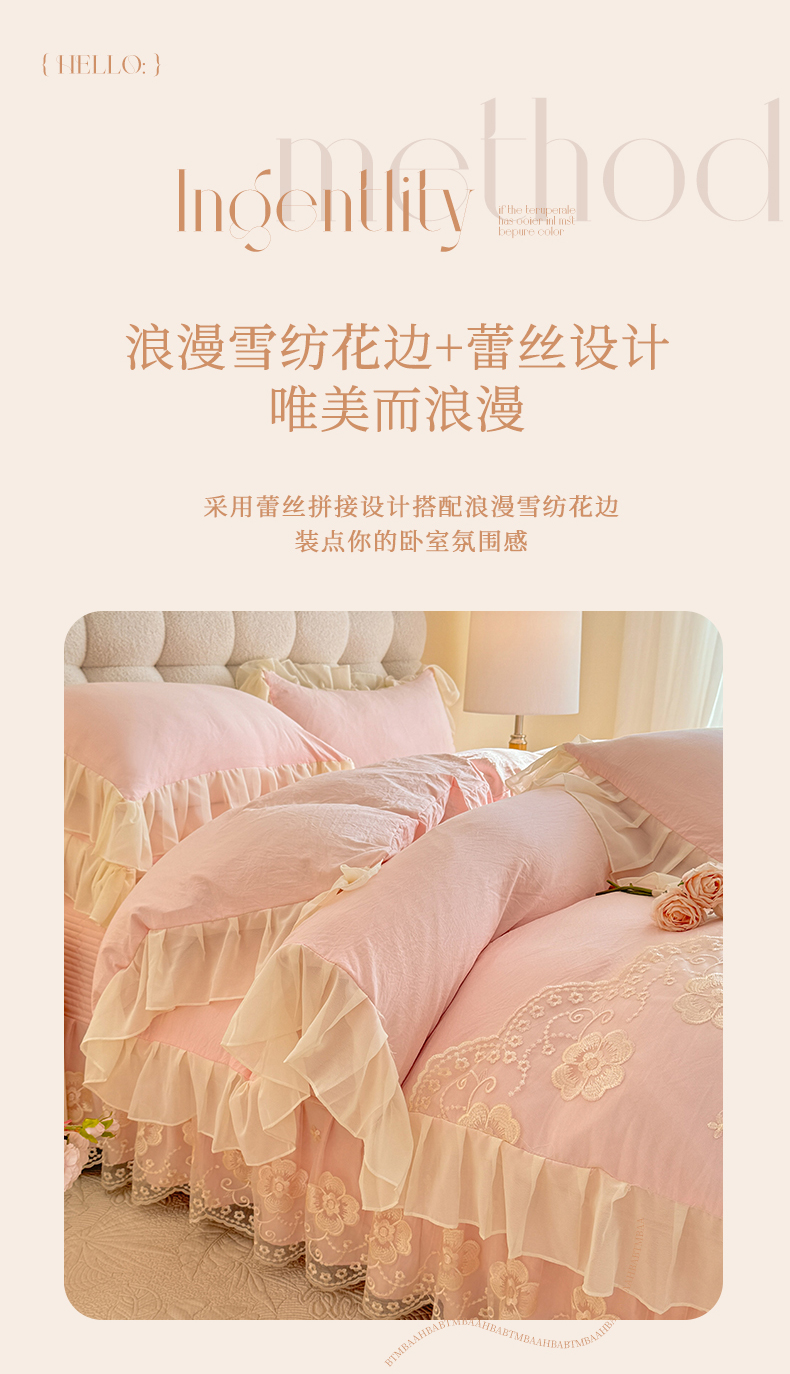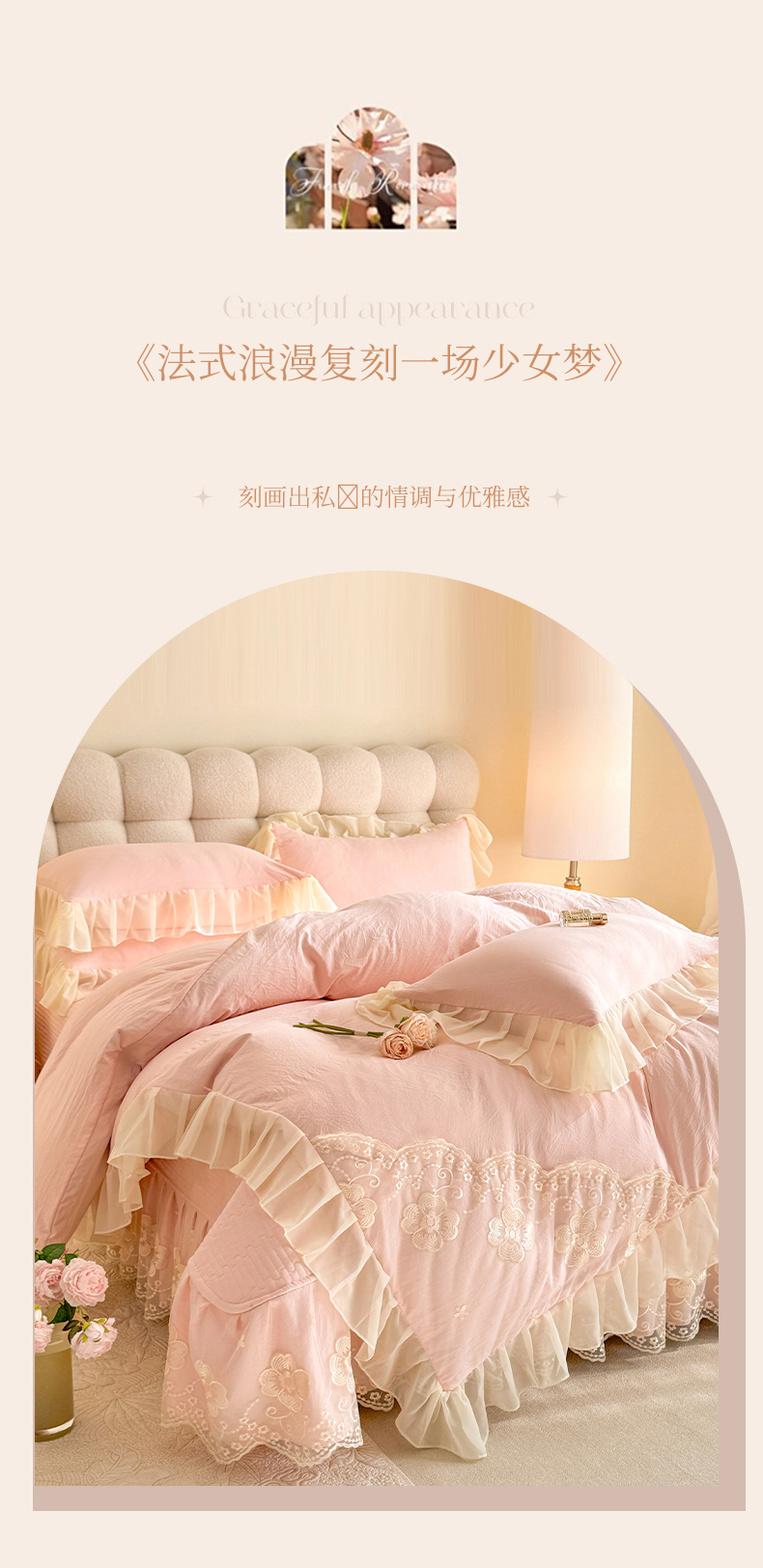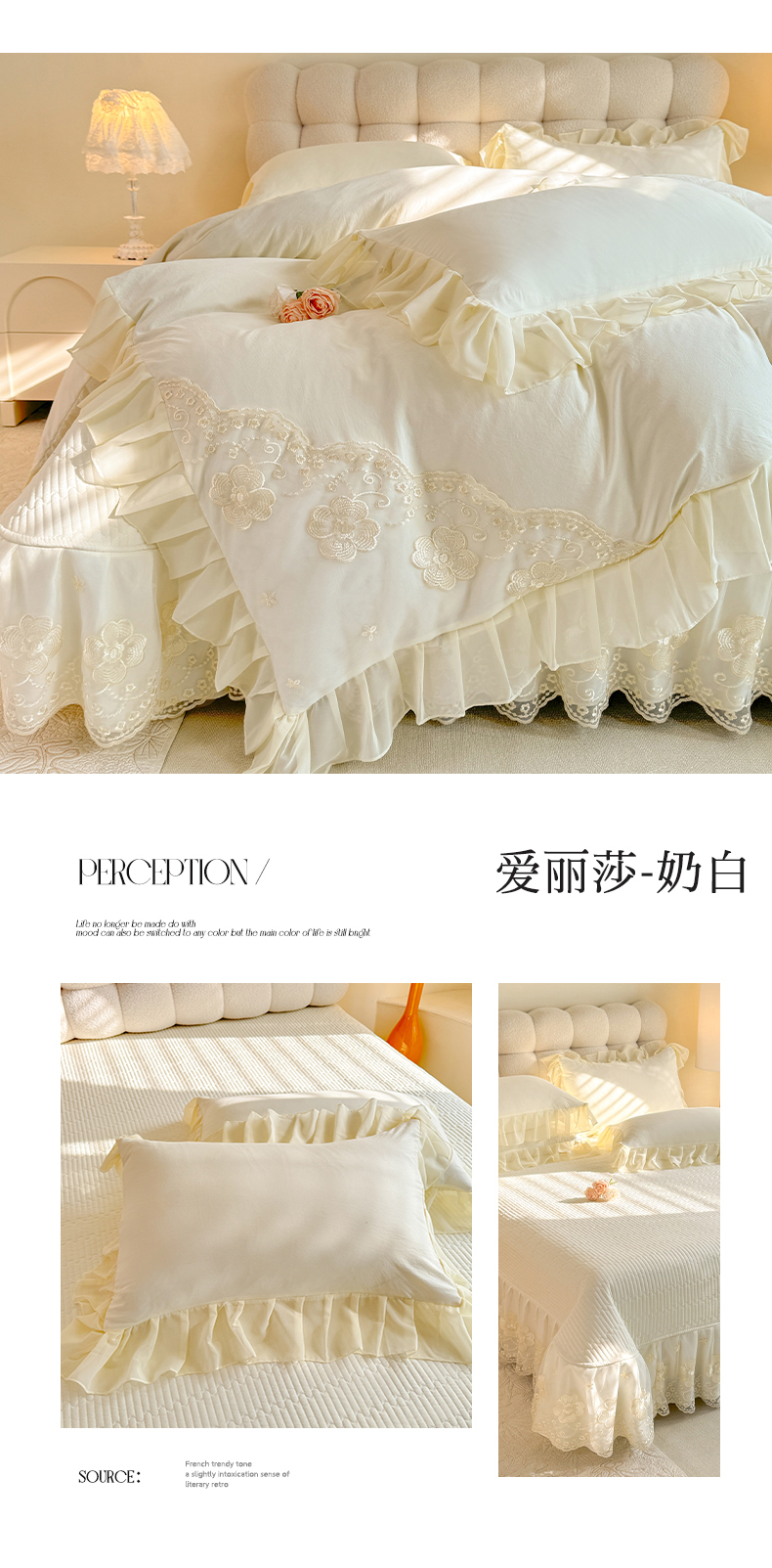 商品名称:(总)迪梦姿家纺 2025新款简约纯色高密水洗棉花边床盖四件套-爱丽莎