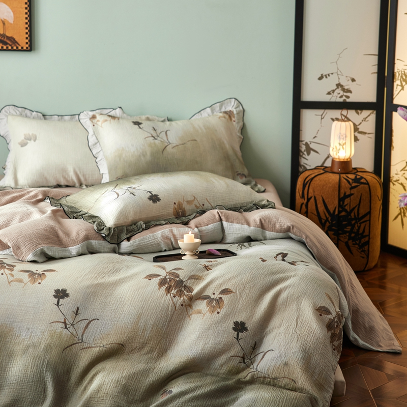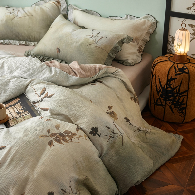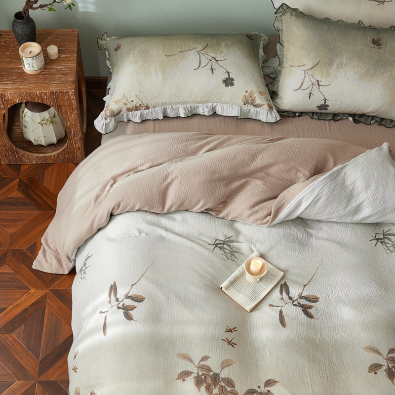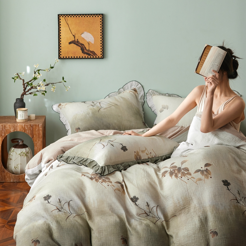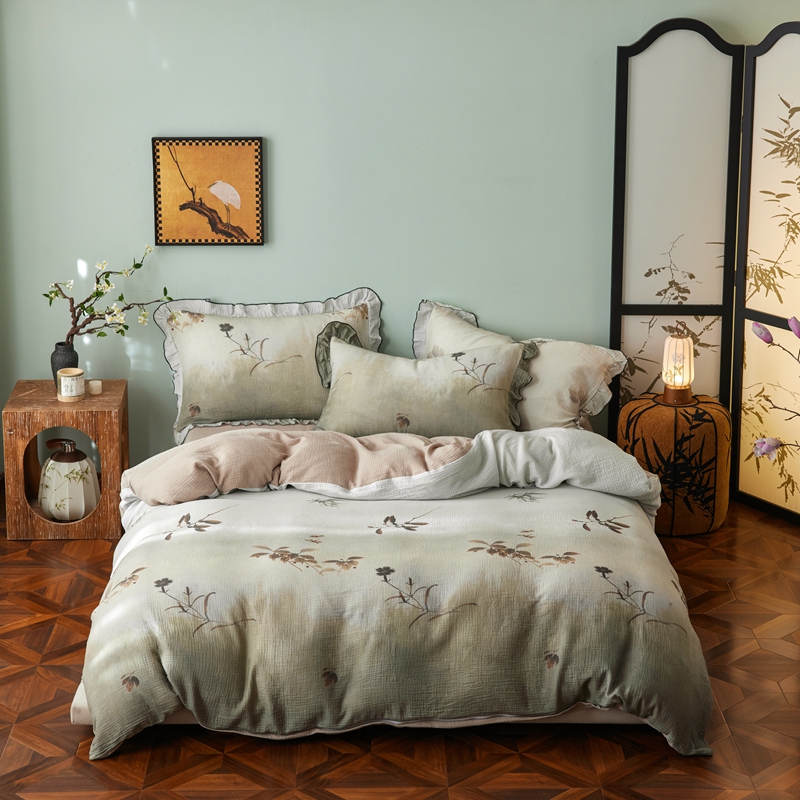 商品名称:安莱生活 2025新款全棉精梳棉双层纱绉纱数码印花四件套 烟雨江南-绿