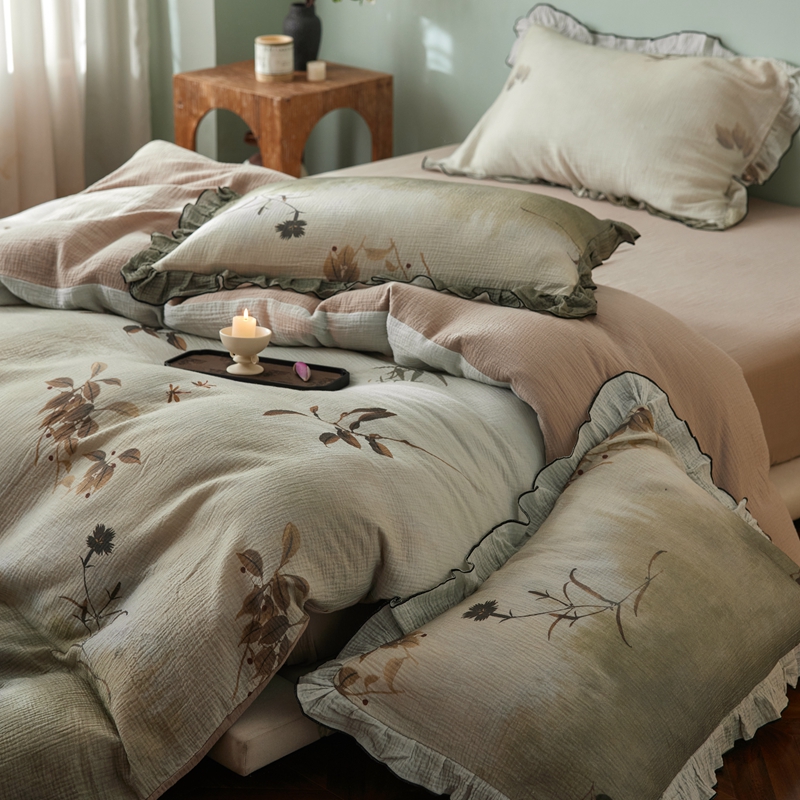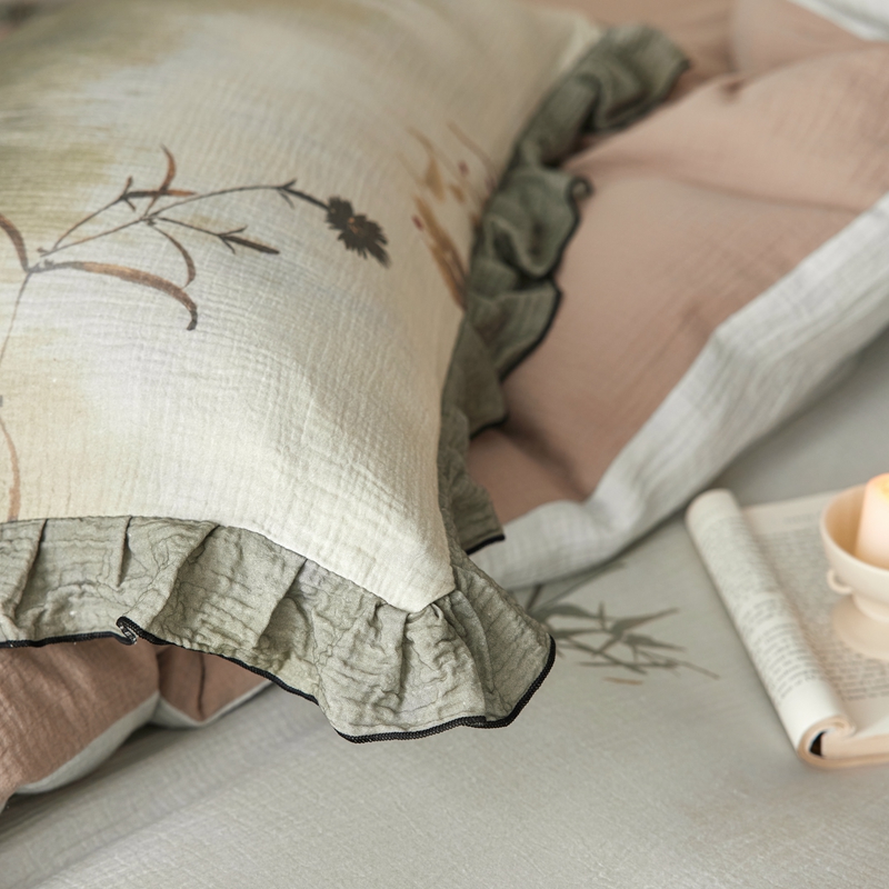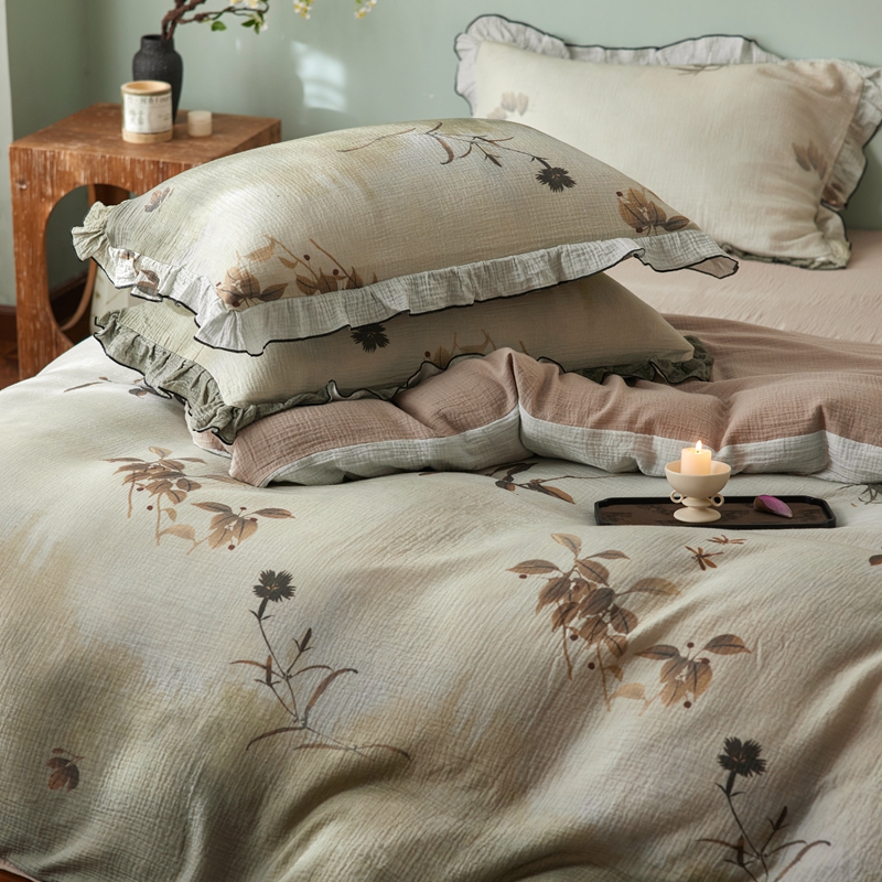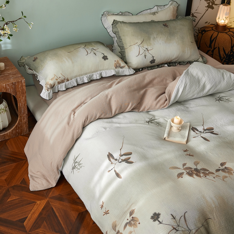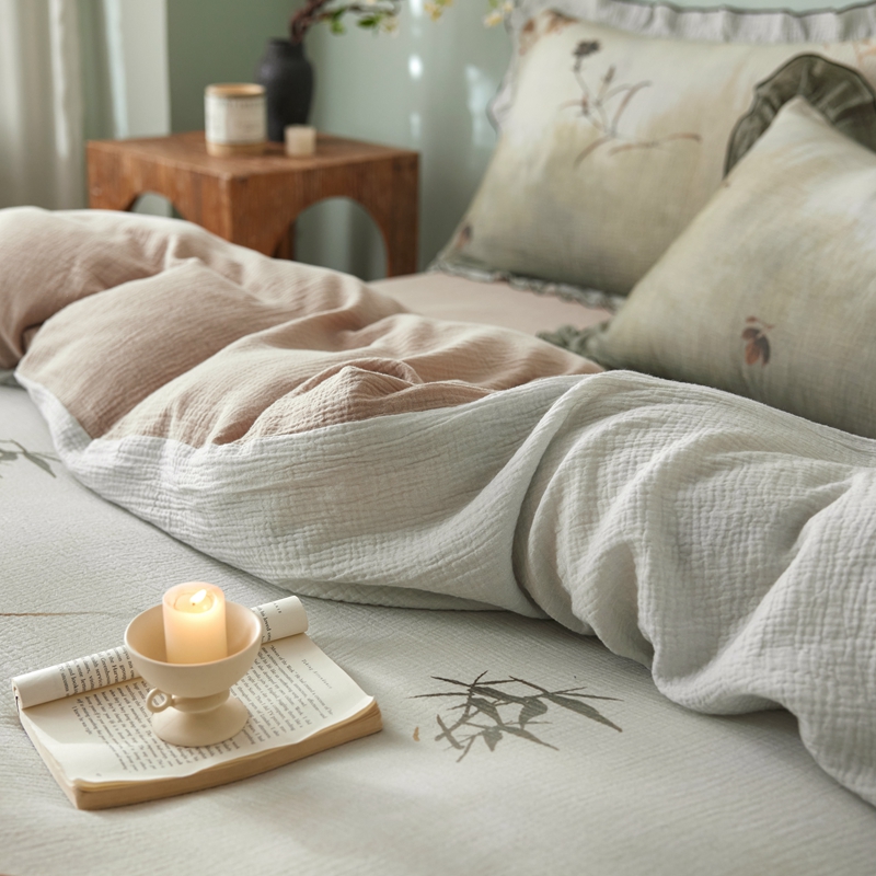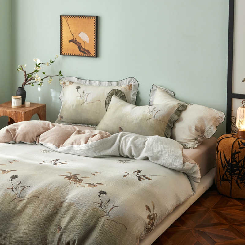 商品名称:安莱生活 2025新款全棉精梳棉双层纱绉纱数码印花四件套 烟雨江南-绿