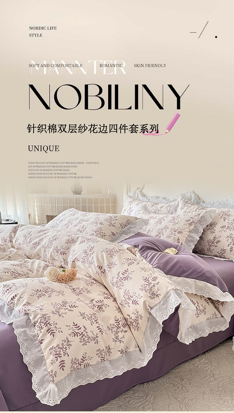 苏米娜家纺2025春夏新款韩版复古花边A类有氧针织棉双层纱四件套纯棉麻泡泡棉小竺棉四件套法式赫本风水洗棉床盖款四件套 格调-蓝