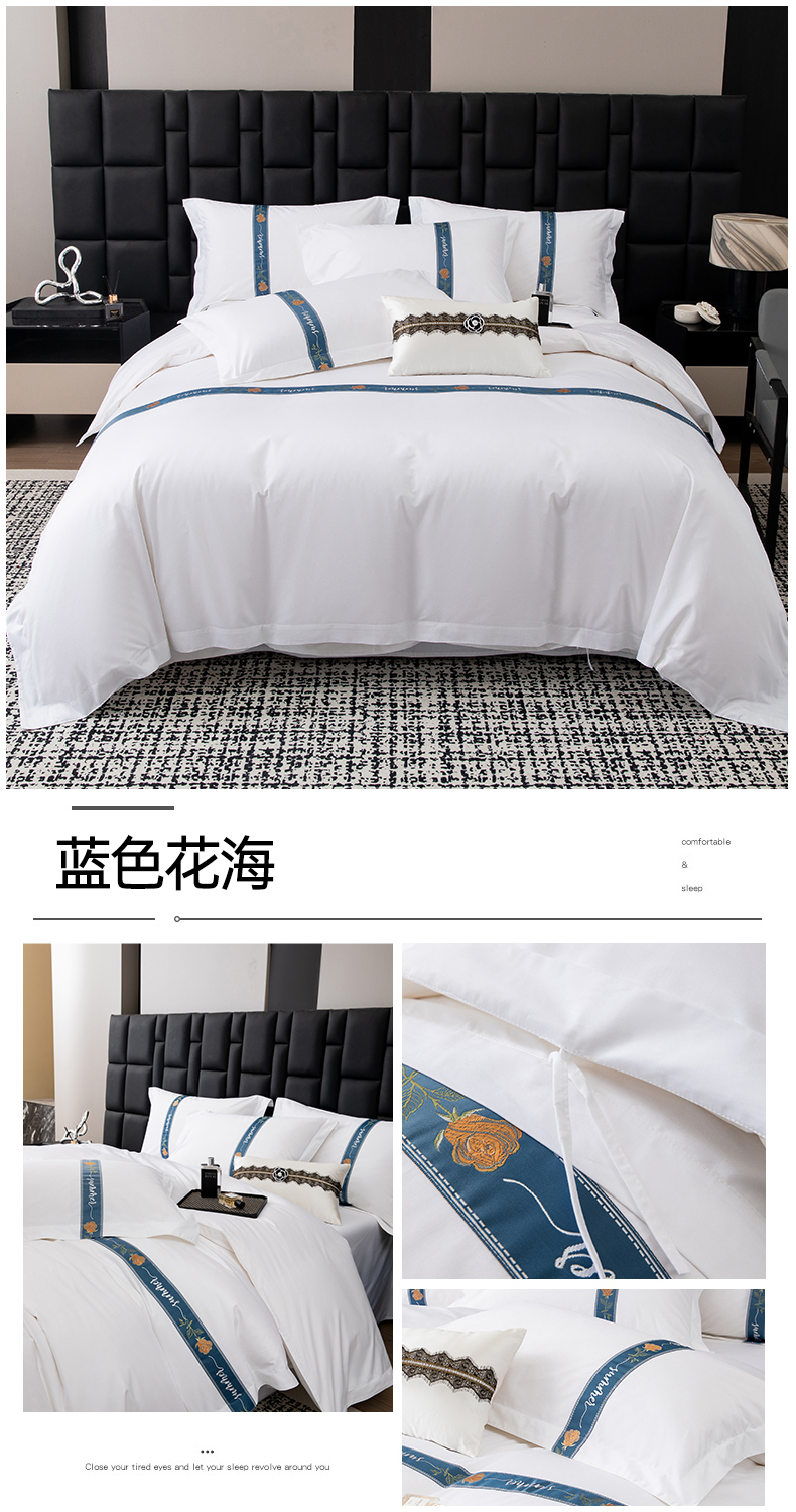当前位置: 91家纺网 > 商品网购 > 床品套件 > 四件套 > 全棉普通四件套 > 优必恩 2025新款高支高密民宿酒店织带款四件套套件 蓝色花海