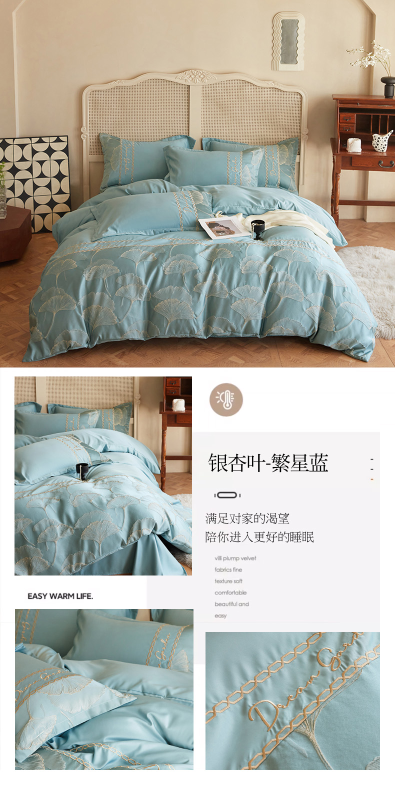 商品名称:菲儿2025新款冰丝浮雕提花绣花四件套 银杏叶-繁星蓝