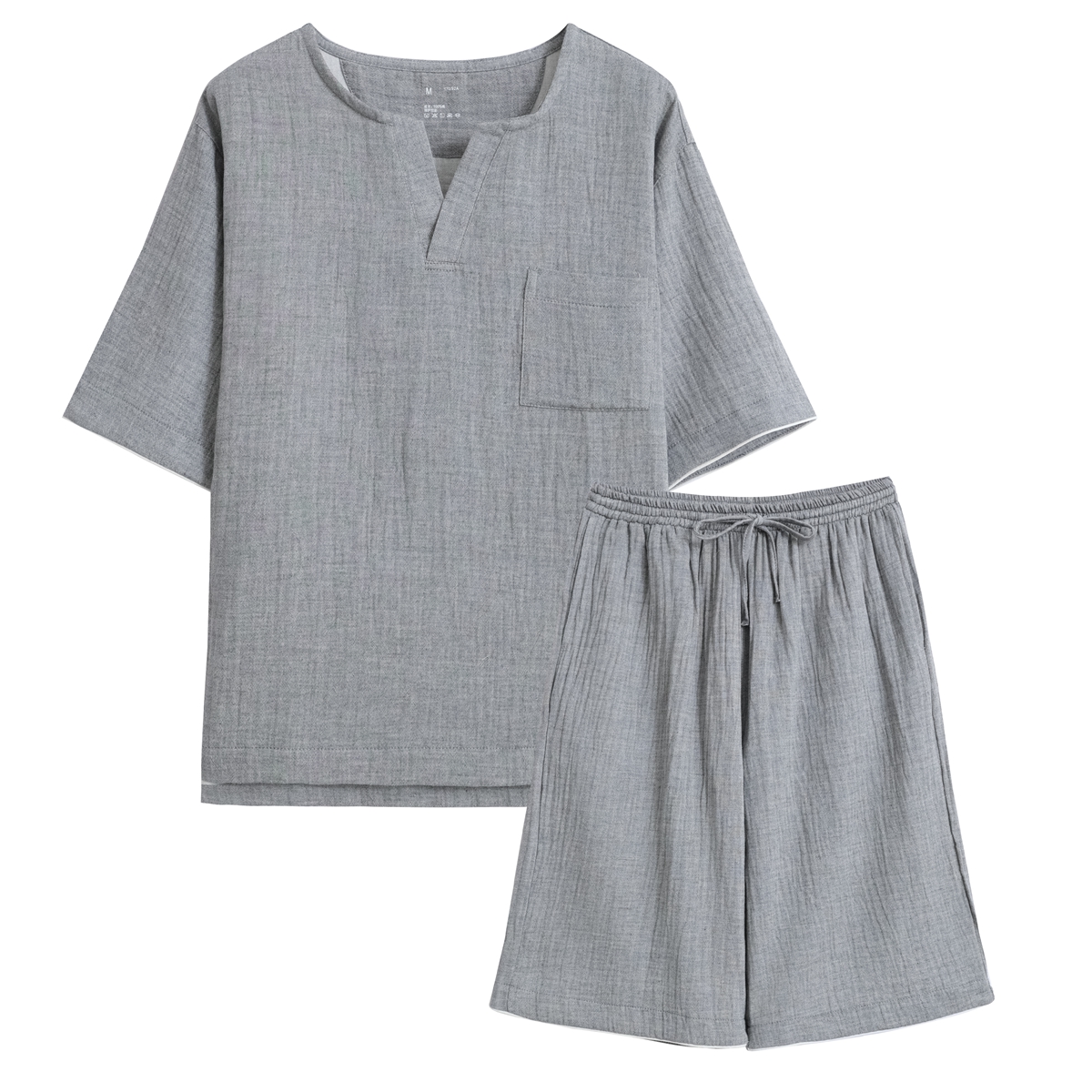 伊嫚家居 日式无印风良品全棉双层纱睡衣男纯棉短袖睡衣夏季皱纱短裤家居服 男深灰色短袖短裤