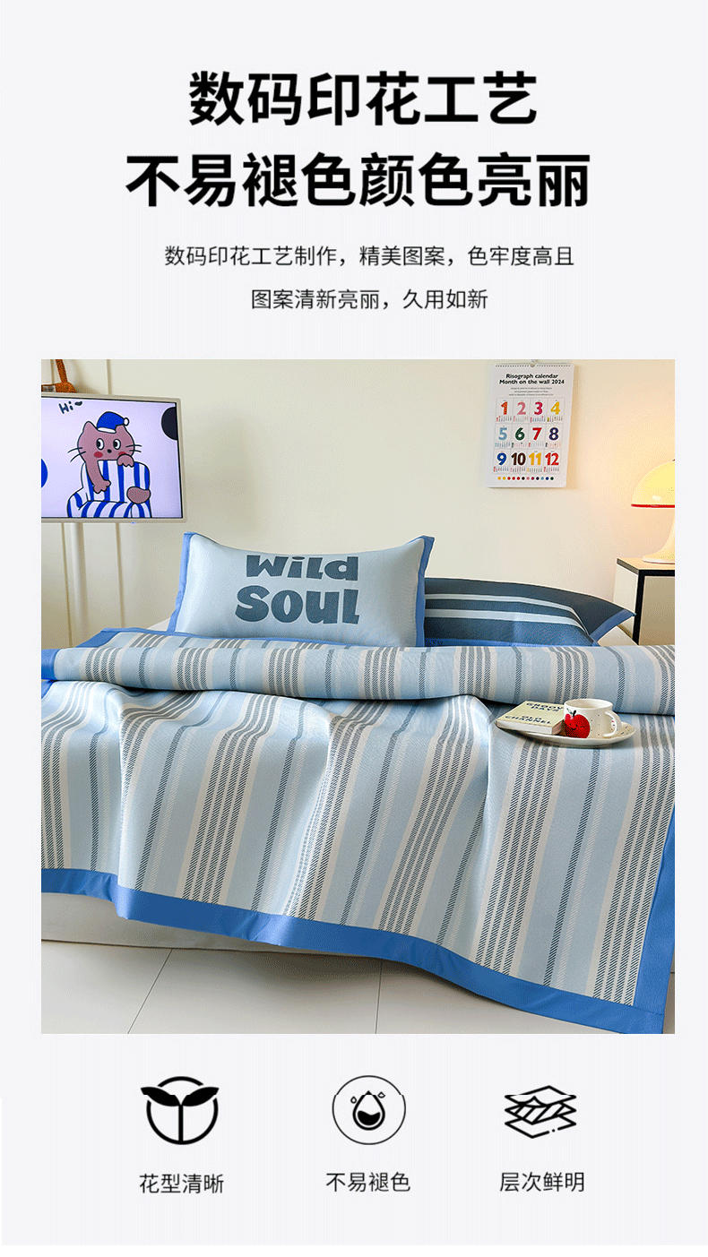 安哆啦家纺 2025新款A类印花冰藤凉席简约条格系列凉席席子 绅士蓝条-床席款