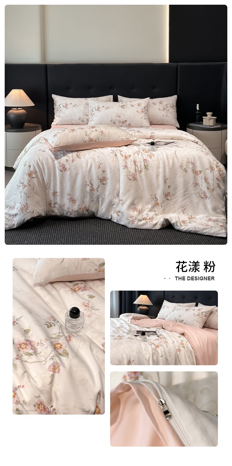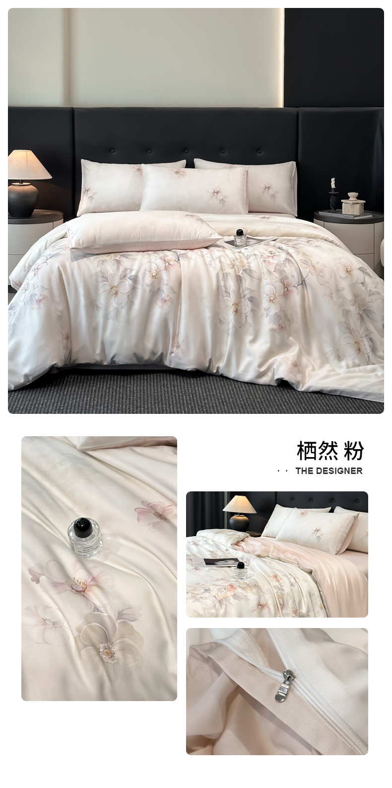 商品名称:慕晨 2025新款莱赛尔天丝数码印花四件套莱赛尔夏被四件套天丝夏凉被直播热款四件套 嫚熙 粉